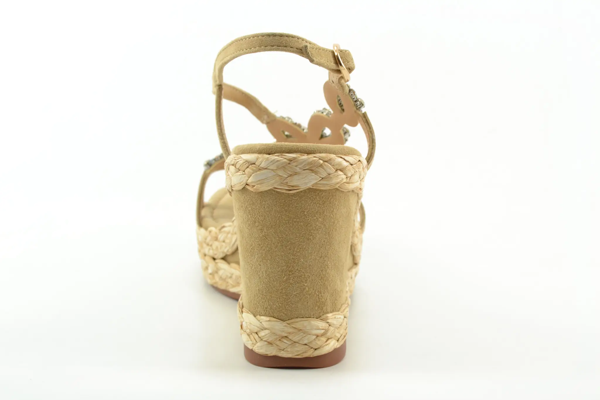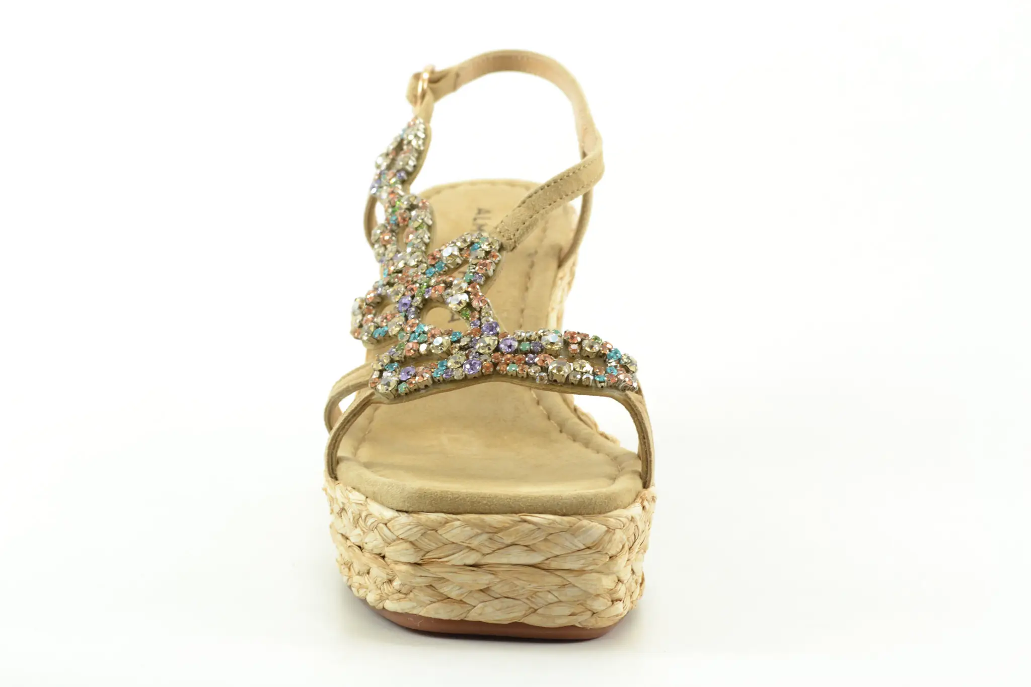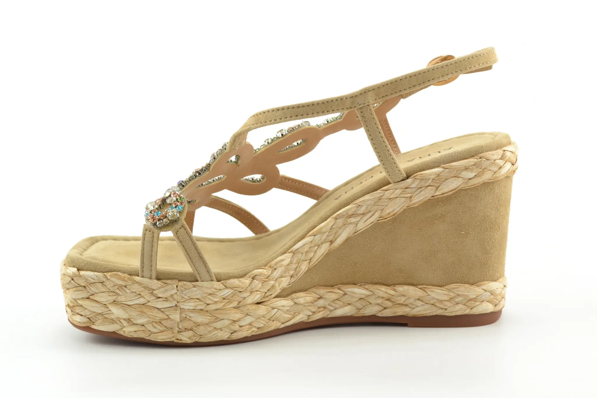 details: deze mooie vrouwelijke sandaal met sleehak van het Spaanse merk Alma en Pena heeft een raffia rand langs de zool en strasssteentjes op de voorvoet.