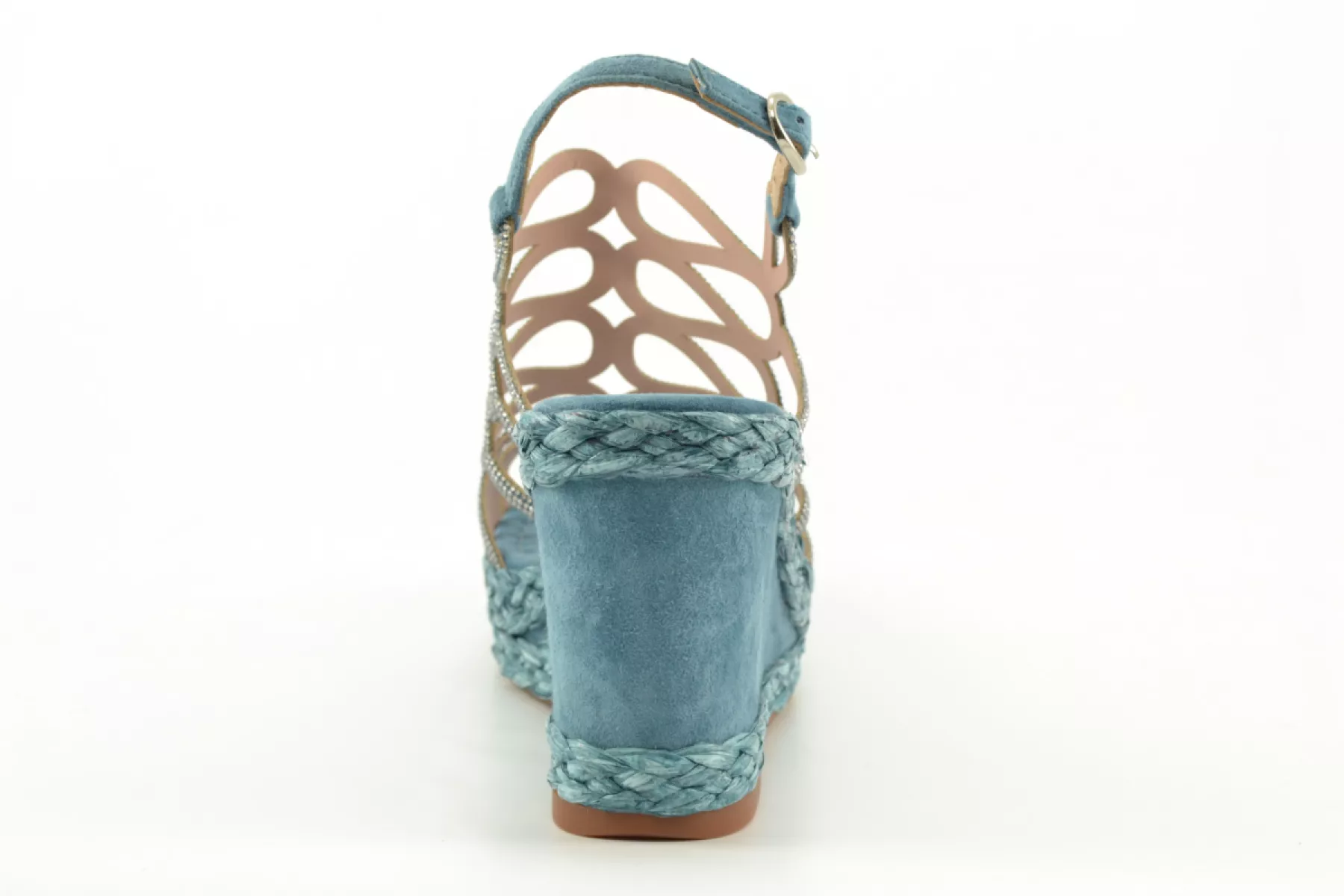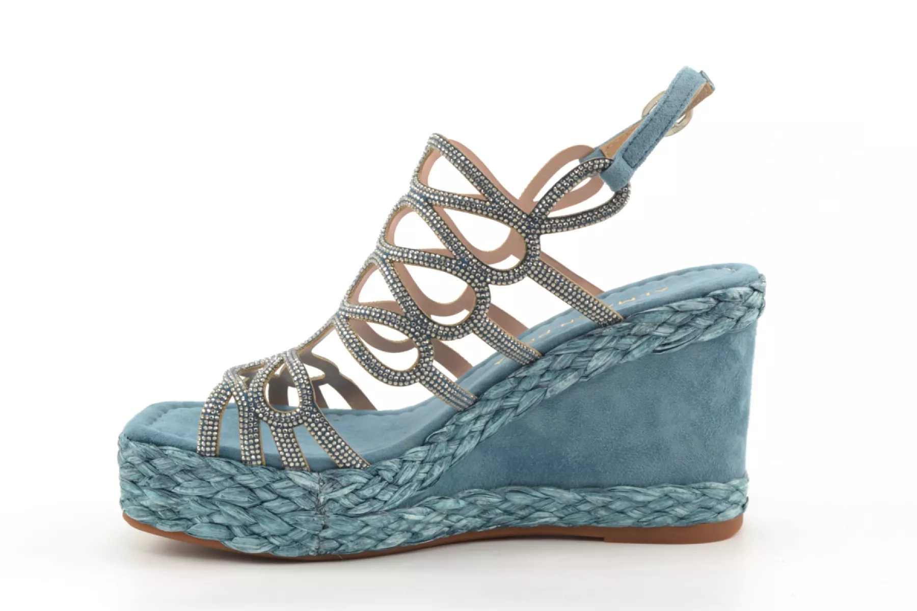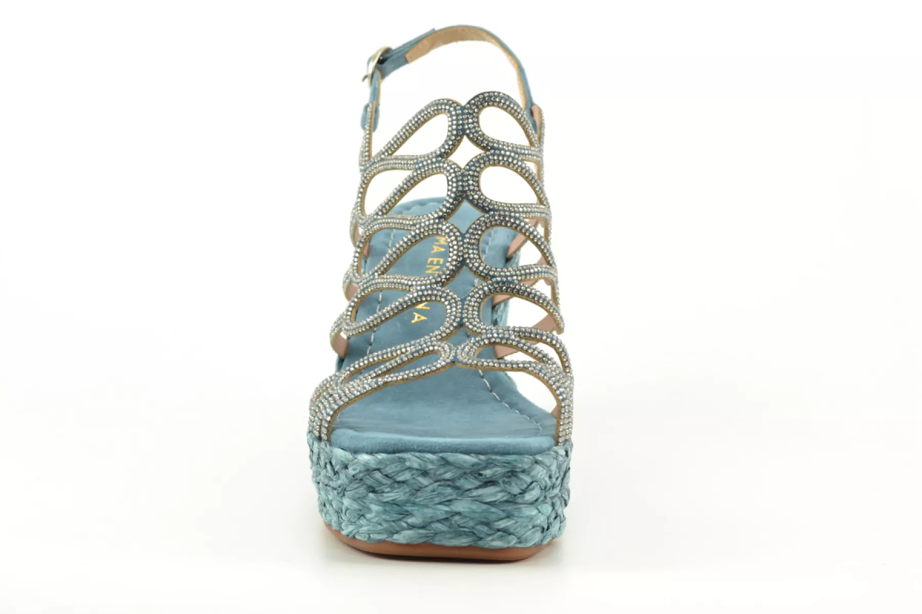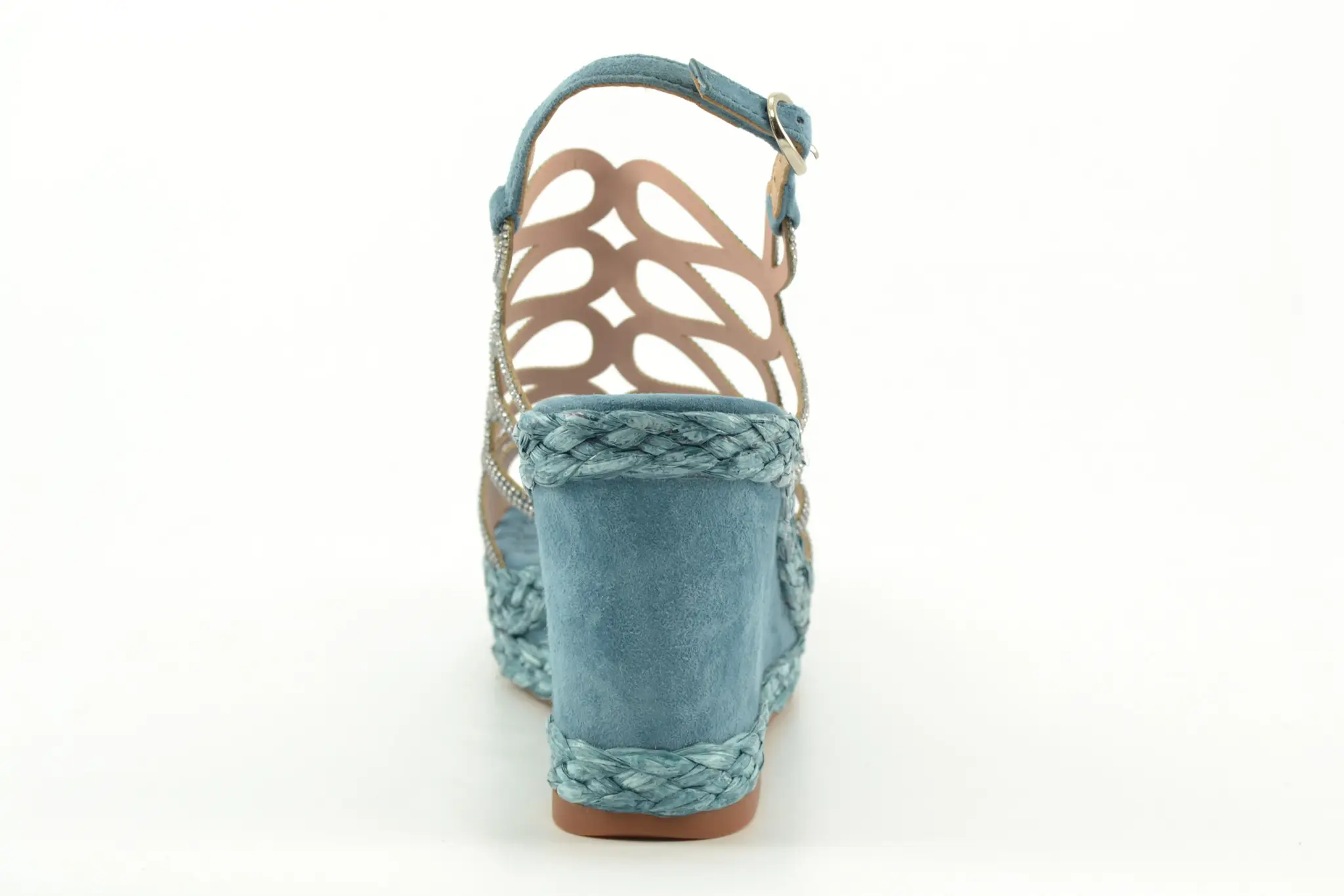 details: deze mooie vrouwelijke sandaal met sleehak van het Spaanse merk Alma en Pena heeft een raffia rand langs de zool en strasssteentjes op de voorvoet.