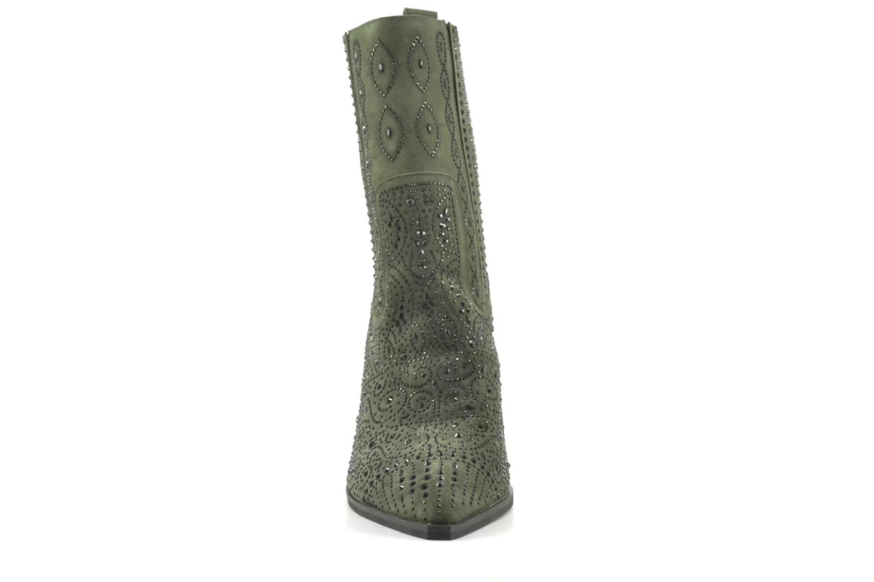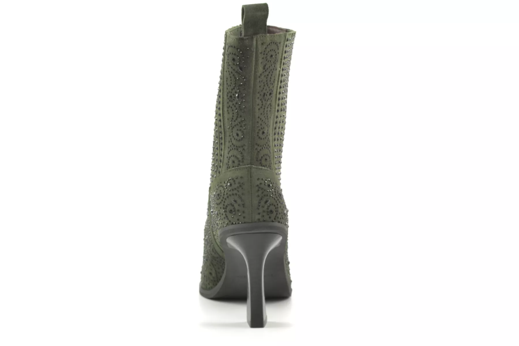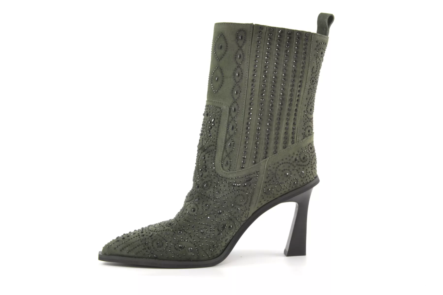 details: groen suede hoge chelseaboots met hak. De enkellaarzen zijn bezet met zwarte strass-steentjes