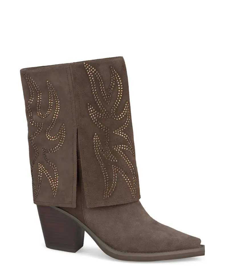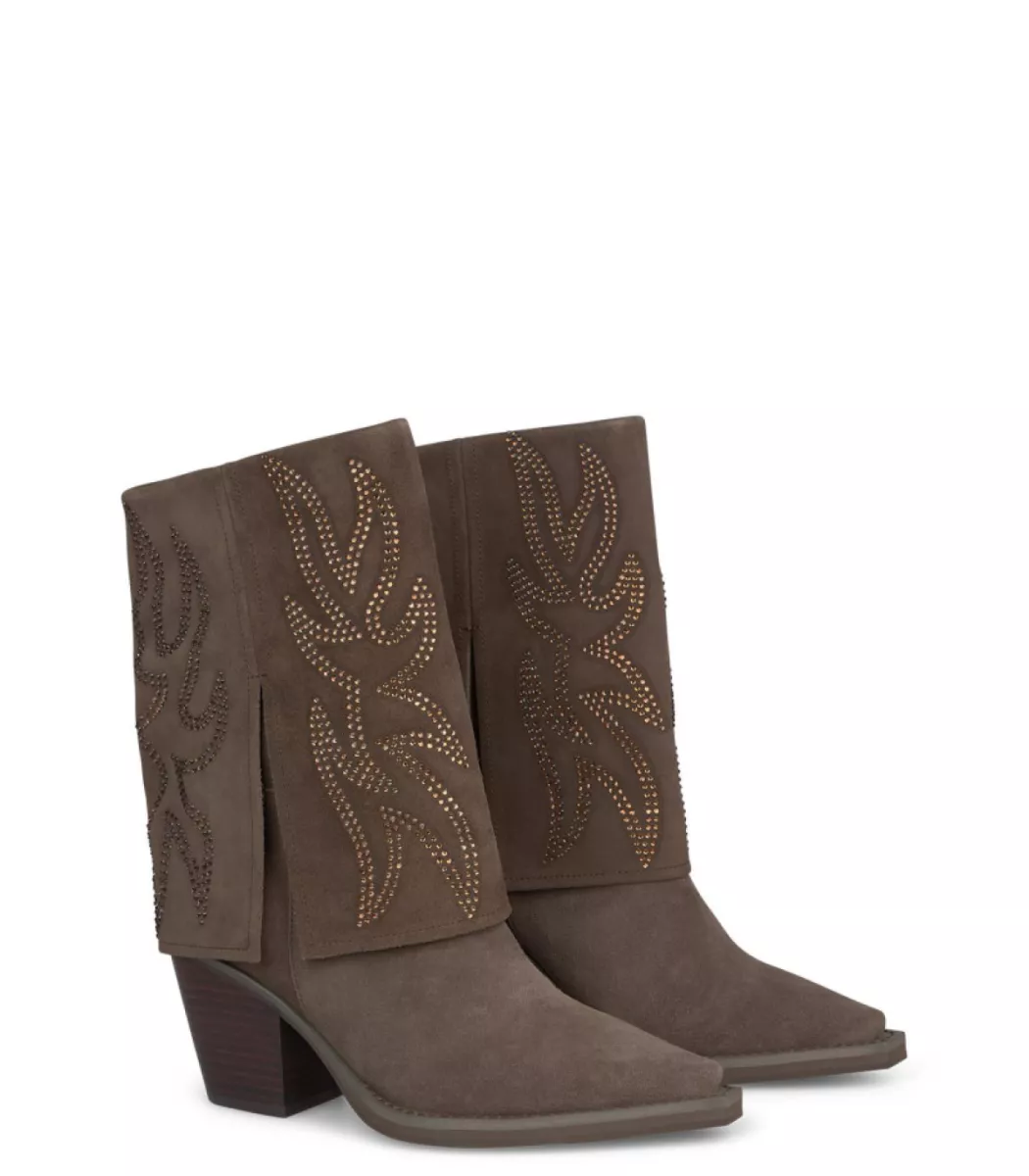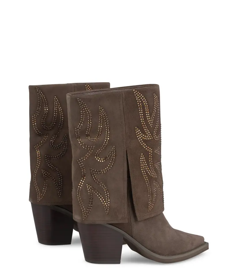 details: bruin suede westernlaars met kap. De kap is bezet met bruine strass- steentjes