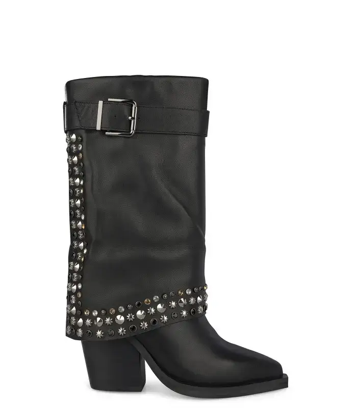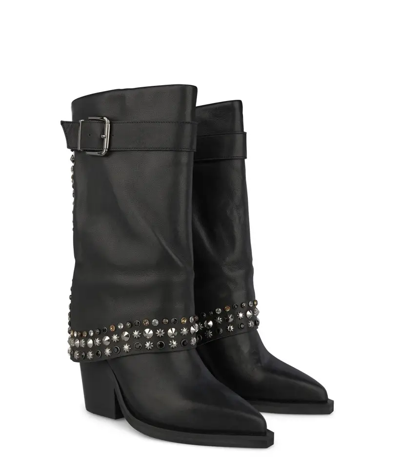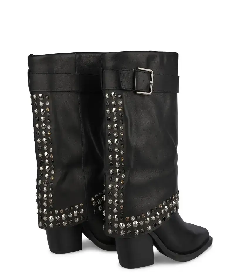 details: zwart leren westernlaars met kap. De omslag is bezet met zilverkleurige studs en zwart-goud-zilveren strass