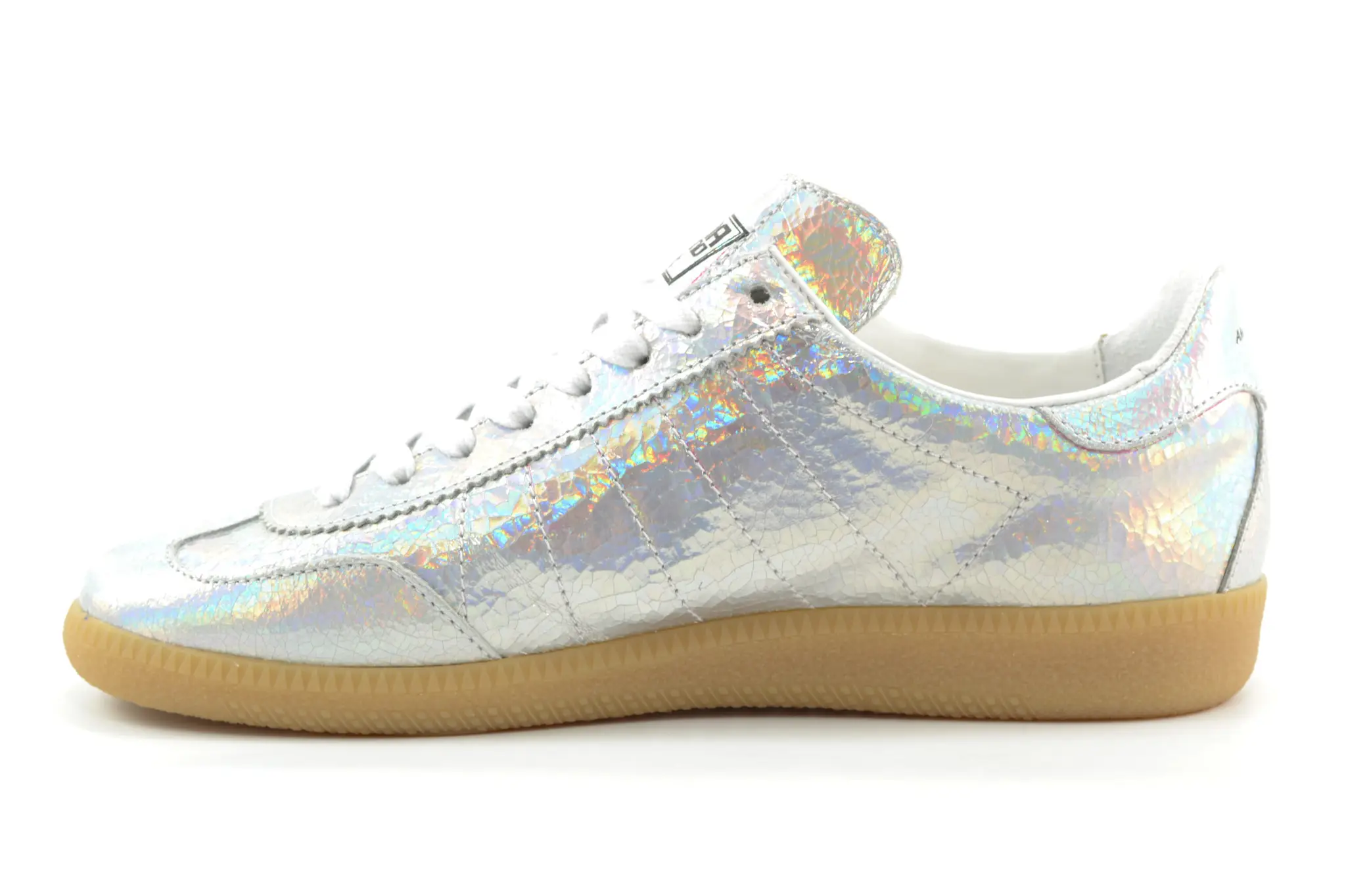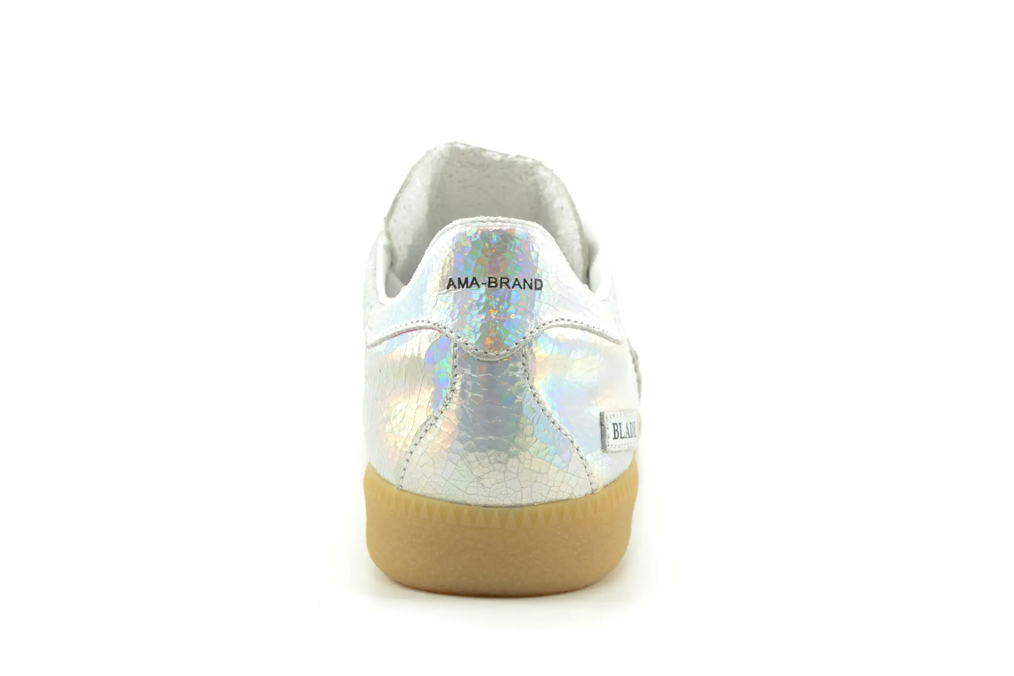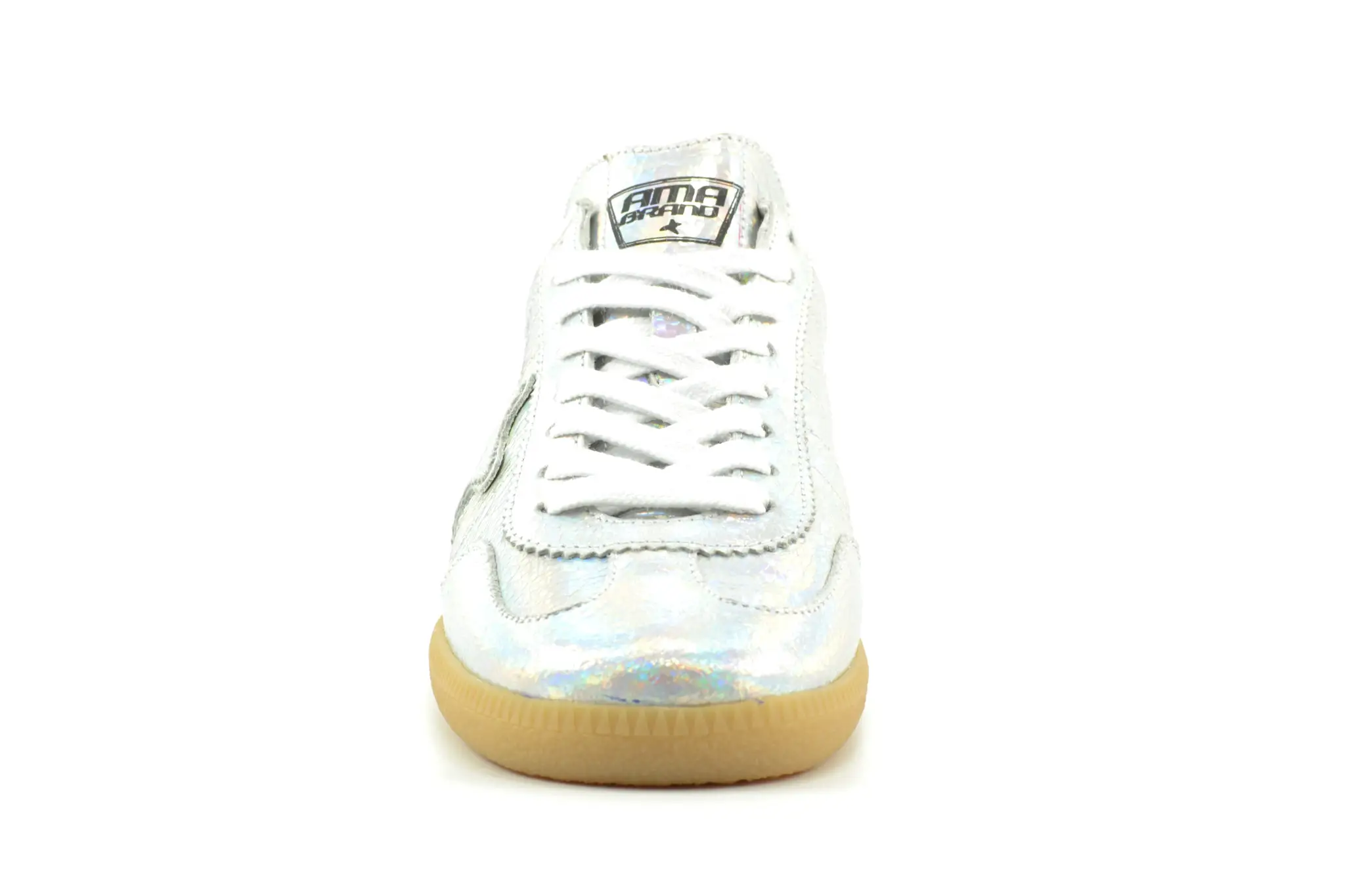 Handmade Italian sneakers with a different point of view. Dat is AMA! Deze luxe damessneakers in metallic zilver leer hebben een lichtbruine rubberen zool en dat geeft deze sneakers net dat beetje extra. Het bekende logo van AMA vindt je op de tong, zij- en achterkant.