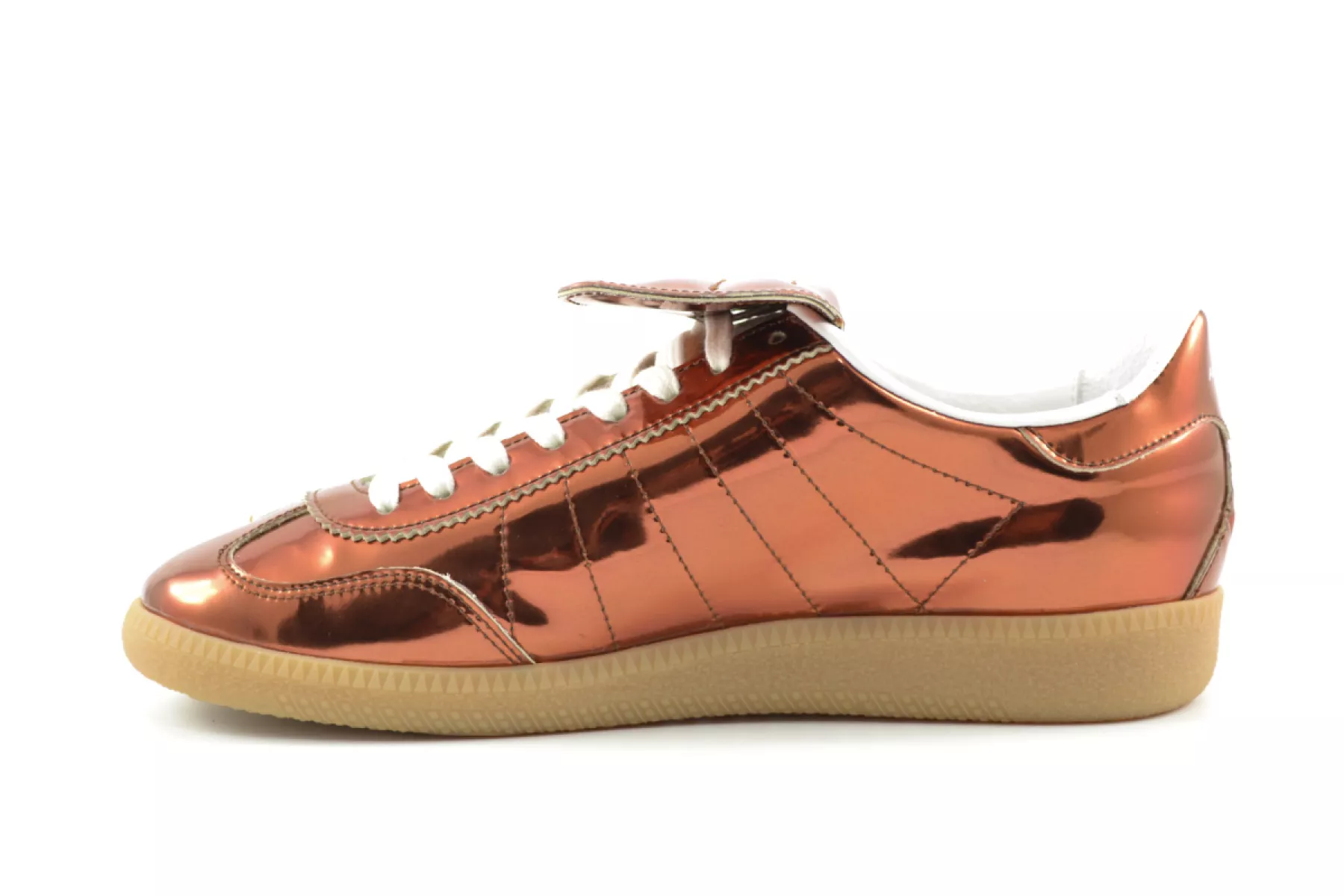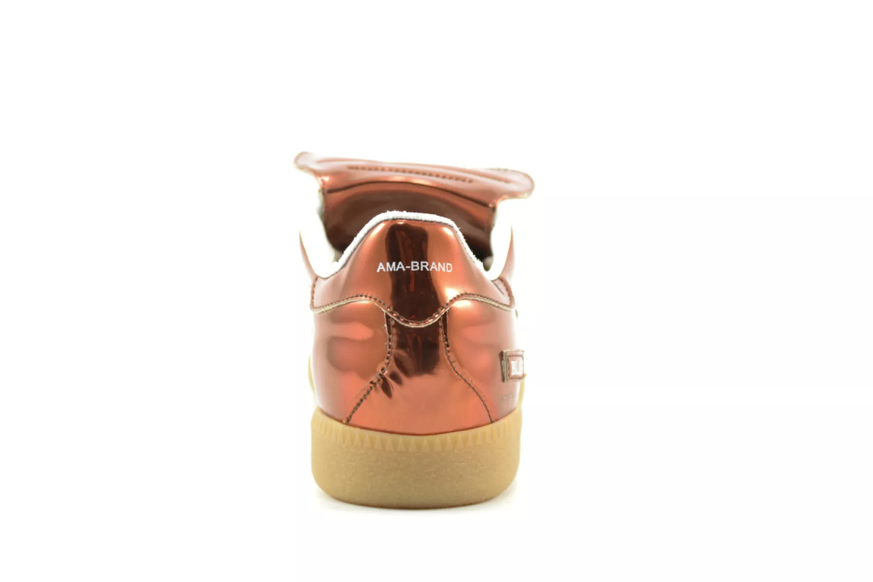 Handmade Italian sneakers with a different point of view. Dat is AMA! Deze luxe damessneakers in brons lak hebben klep. De branding op de tong en zij- en achterkant geven deze sneakers net dat beetje extra.
