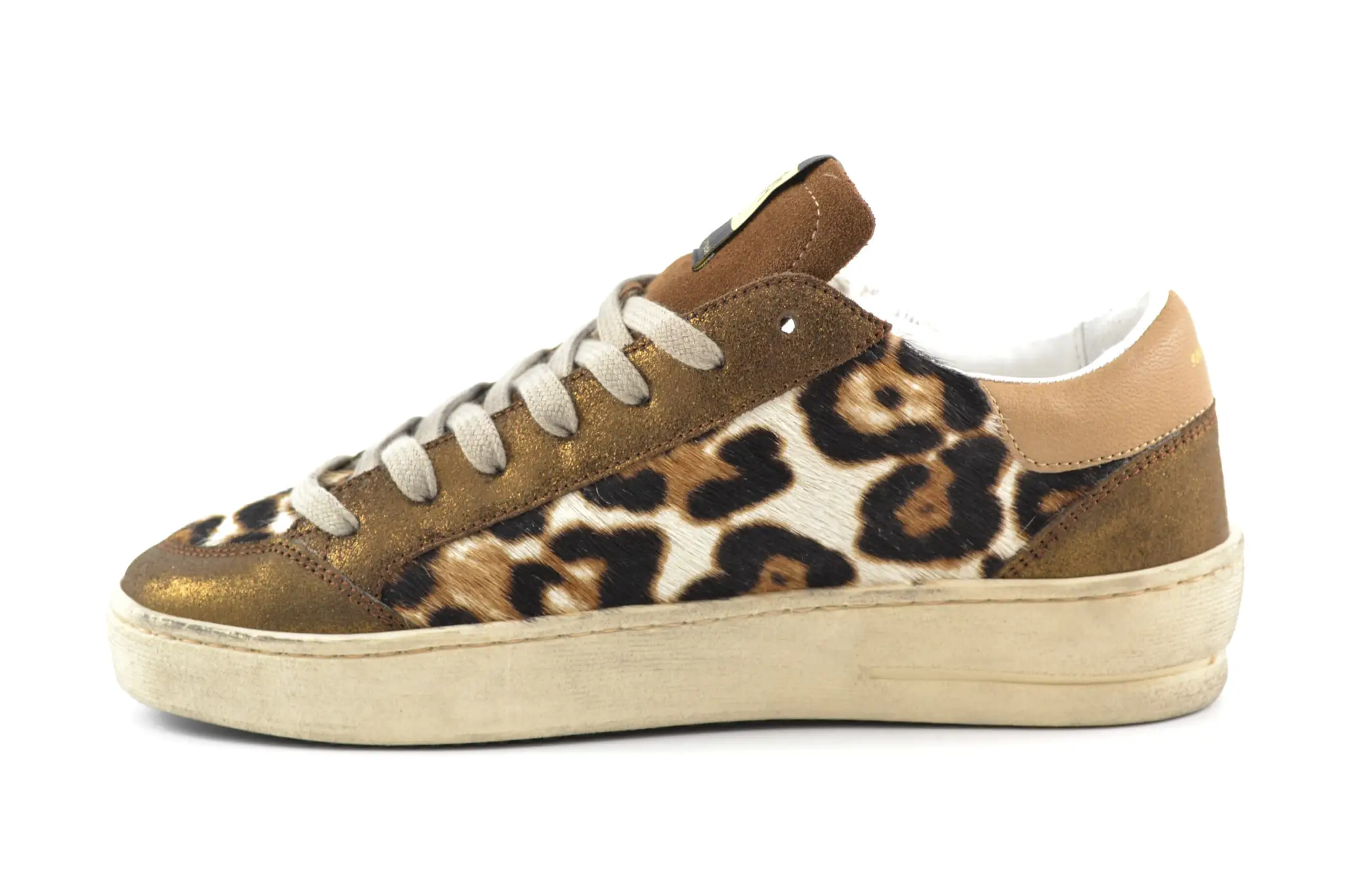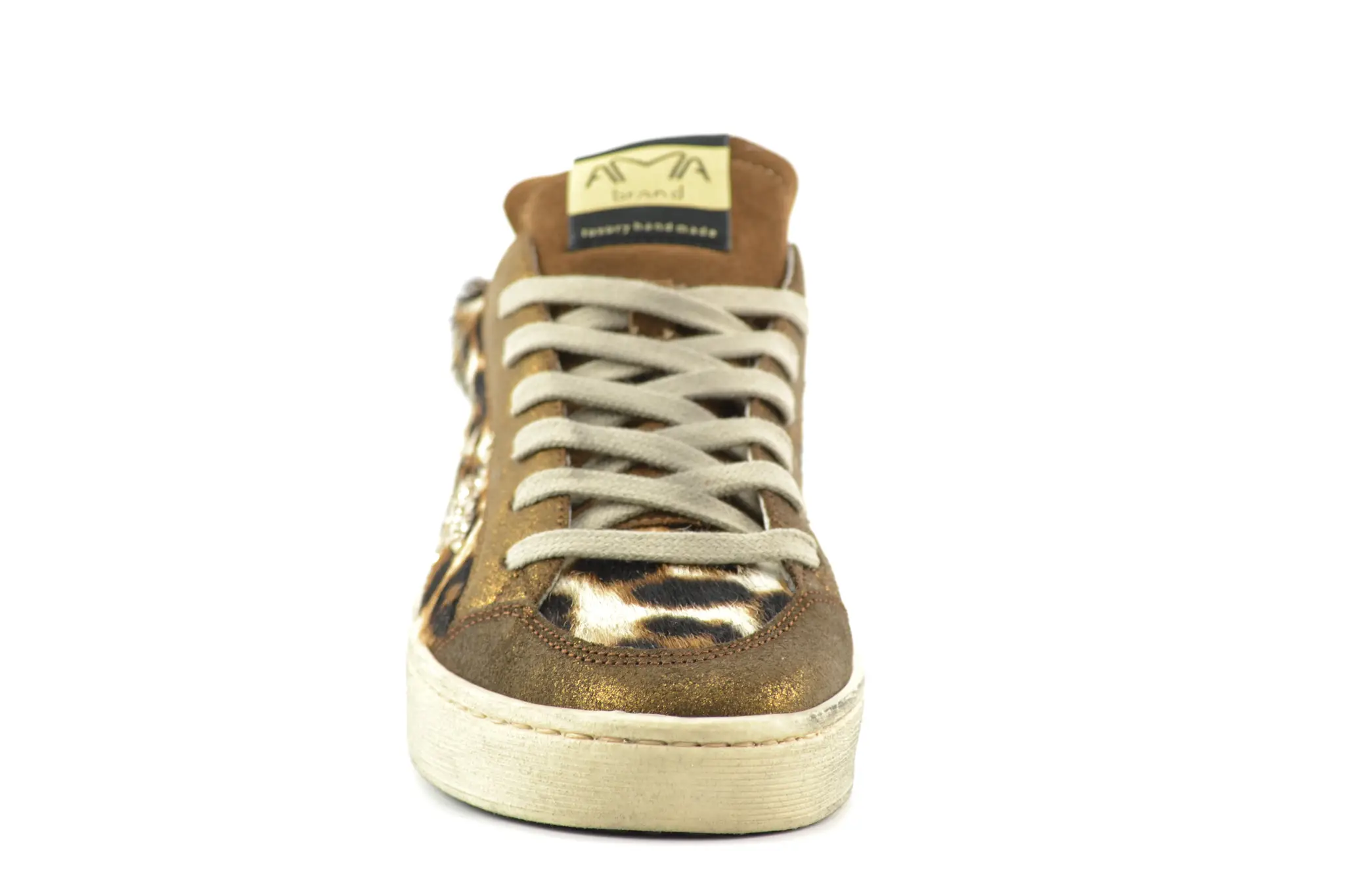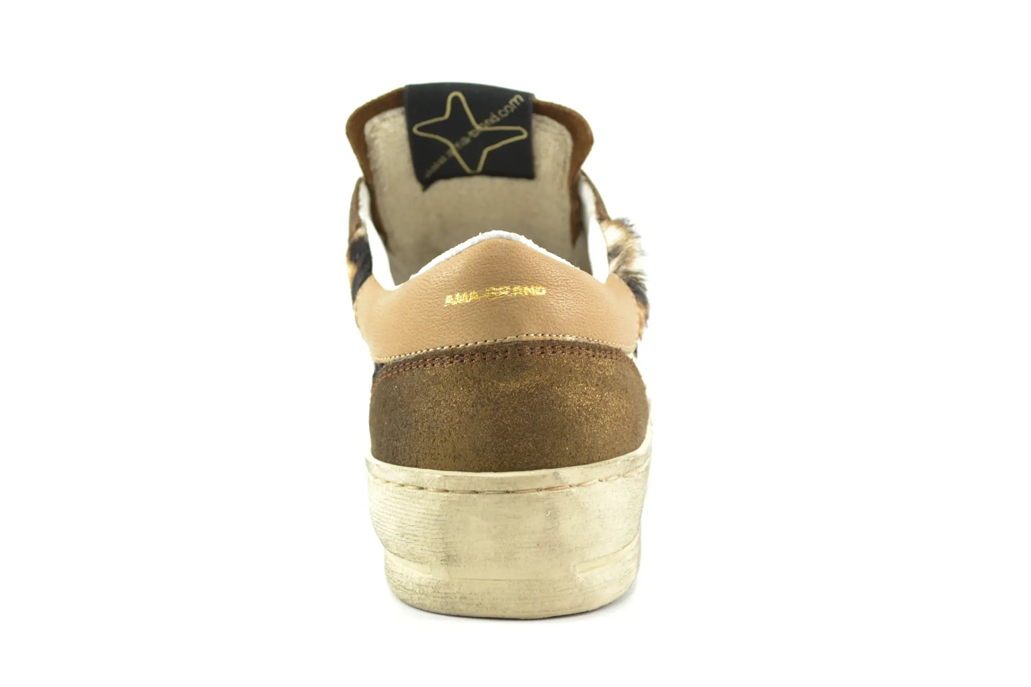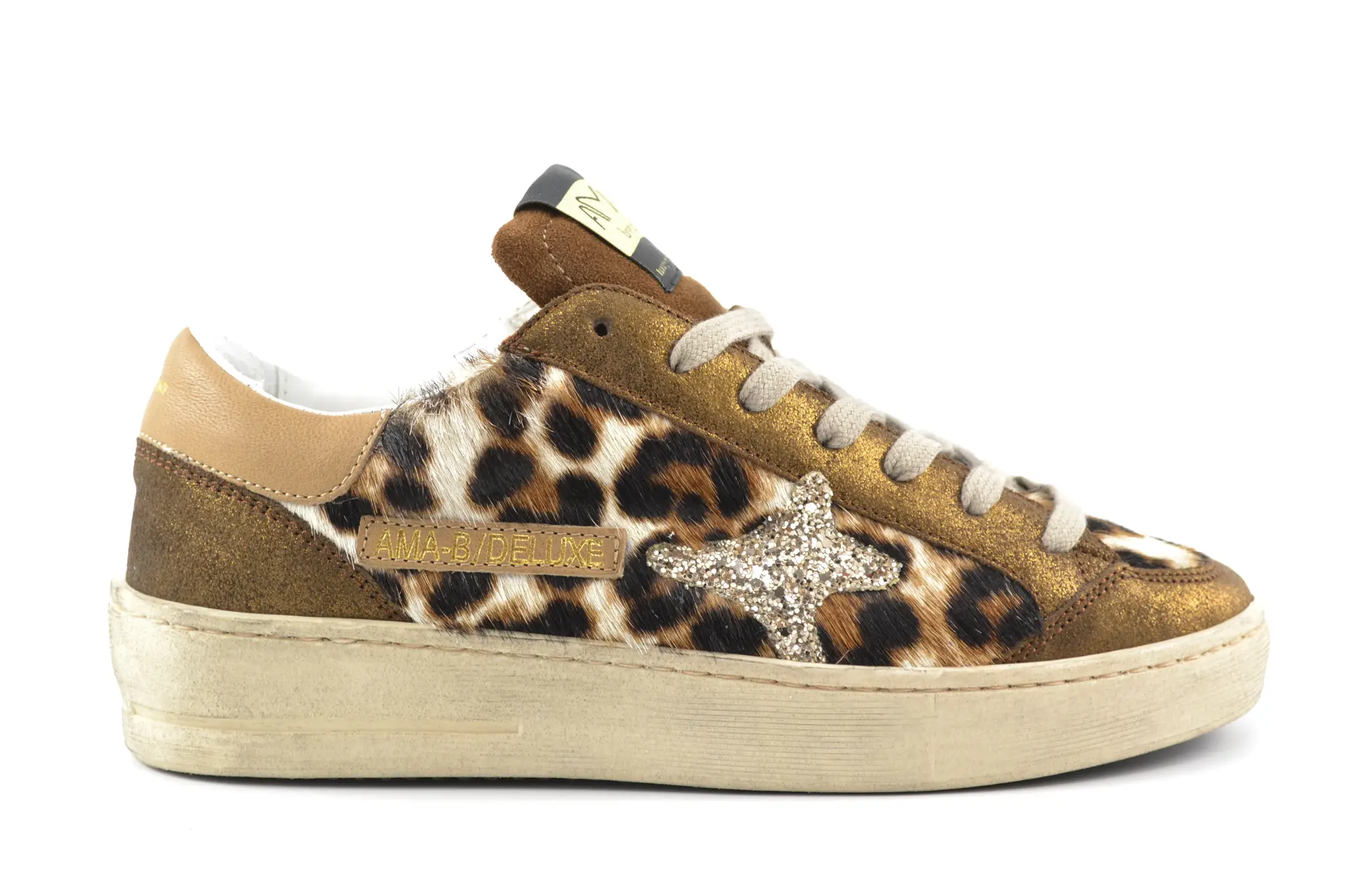 Handmade Italian sneakers with a different point of view. Dat is AMA! Deze luxe damessneakers in brons leer hebben panterprint details. De branding op de tong en zij- en achterkant geven deze sneakers net dat beetje extra.