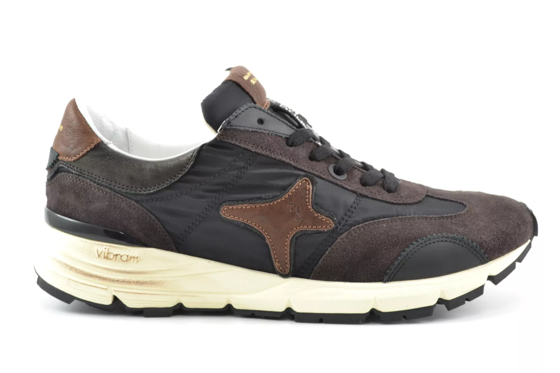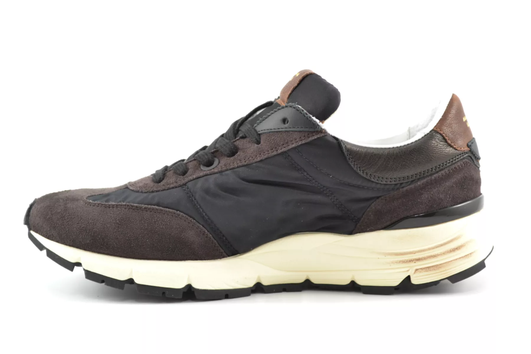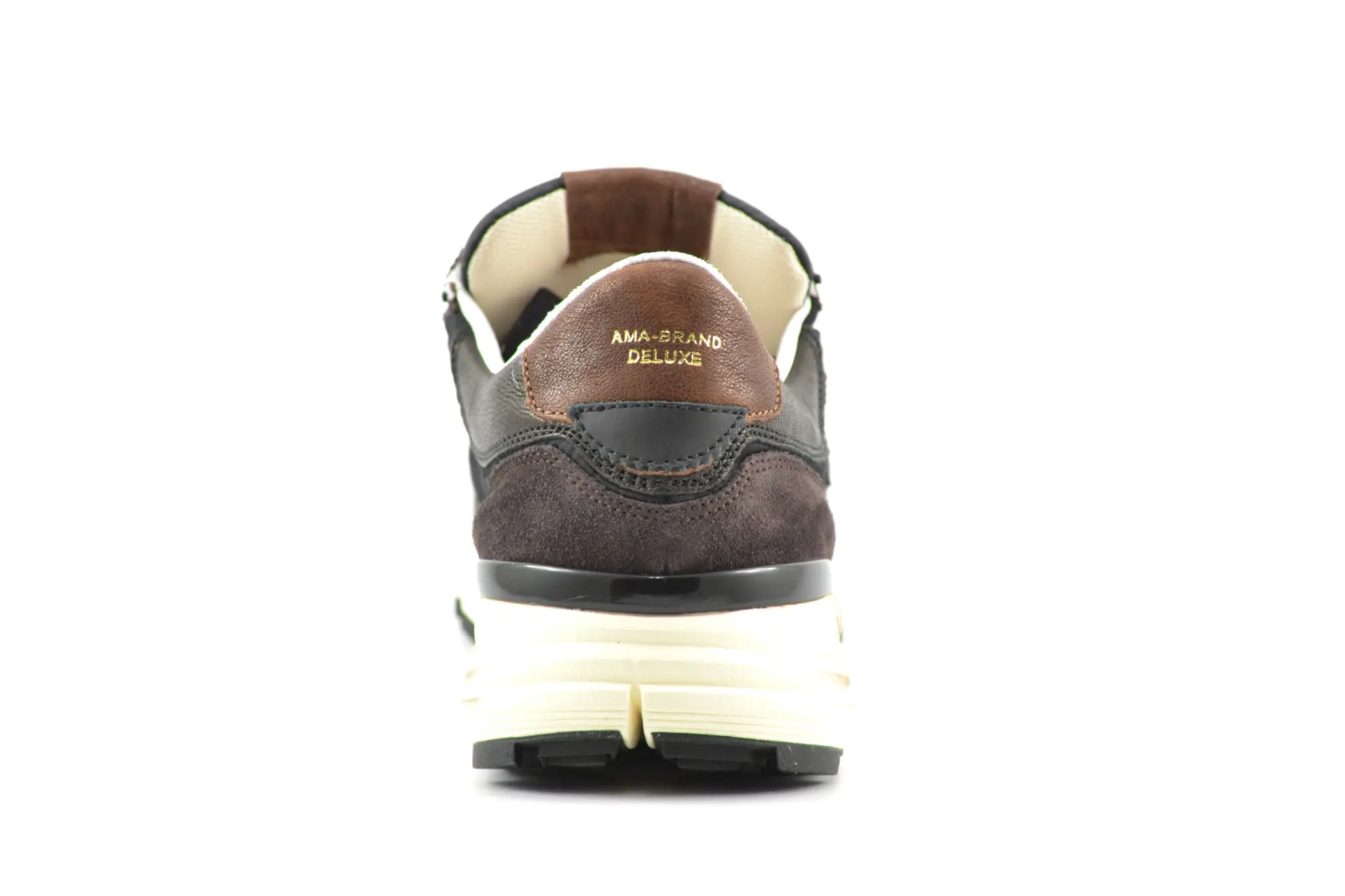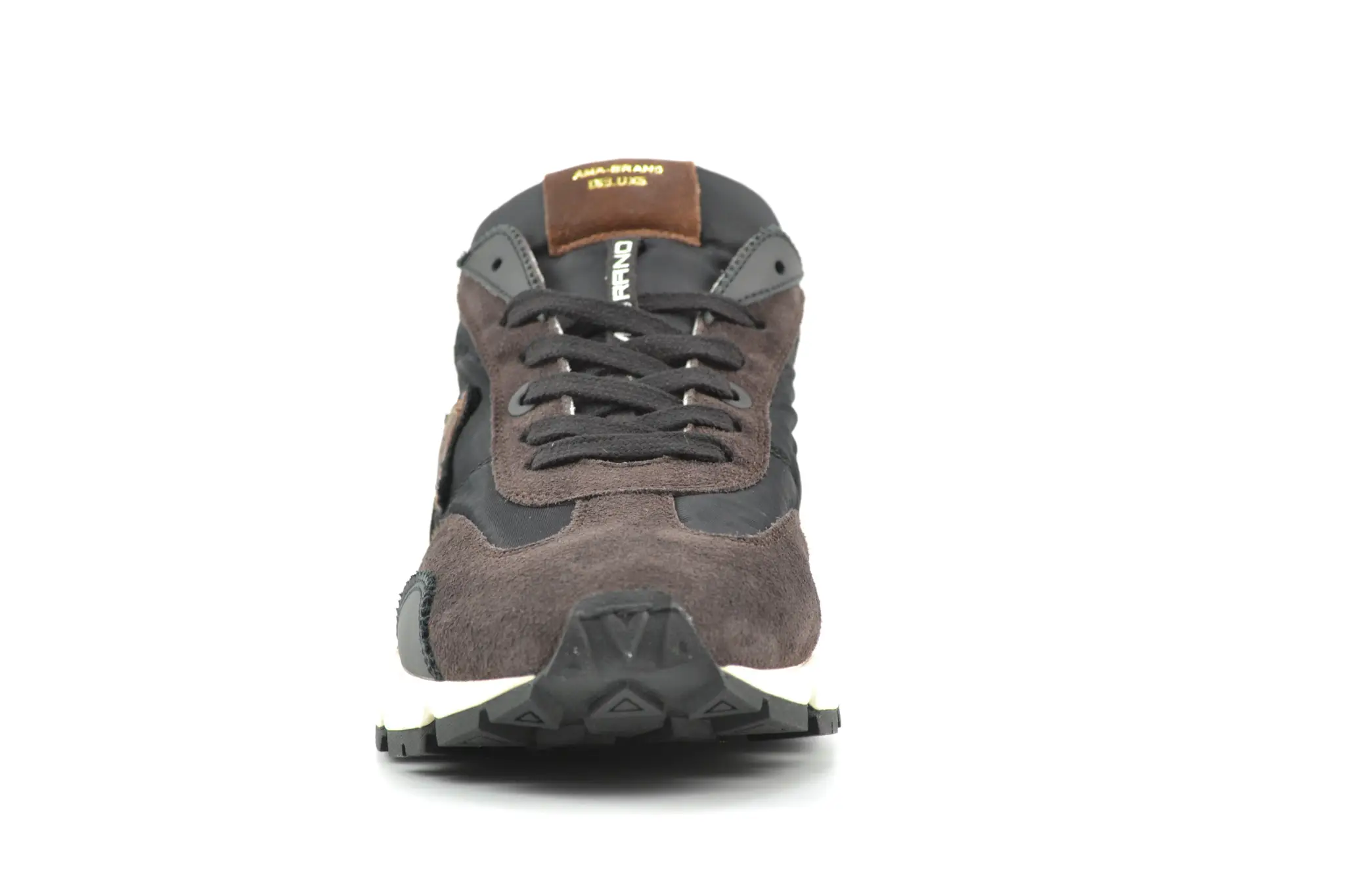 Handmade Italian sneakers with a different point of view. Dat is AMA! Deze luxe herensneakers in zwart nylon hebben bruin leren en suede details. De branding opde tong en zij- en achterkant geven deze sneakers net dat beetje extra.