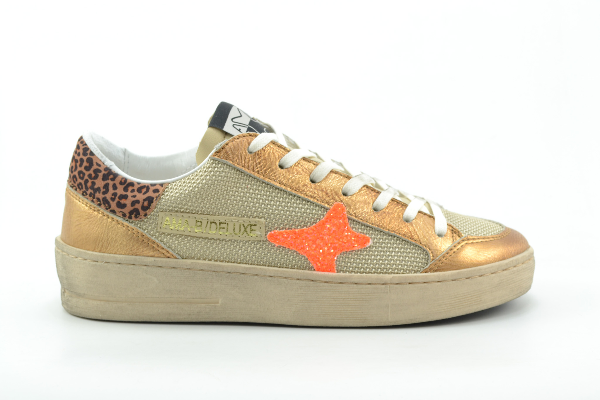 Handmade Italian sneakers with a different point of view. Dat is AMA! Luxe goudkleurige damessneakers met oranje- en panter details. De branding op de tong en zij- en achterkant geven deze sneakers net dat beetje extra.