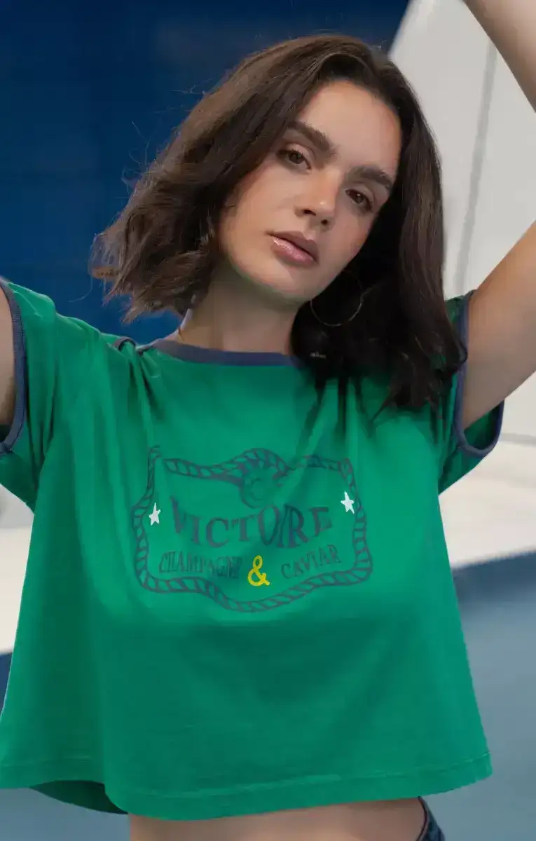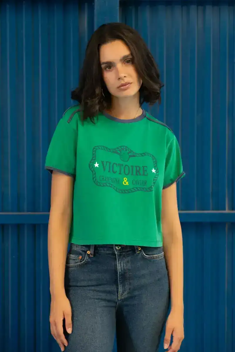 Mooi groen t-shirt met blauwe opdruk. De afbeelding is zo gemaakt dat het nostalgische elementen oproept.