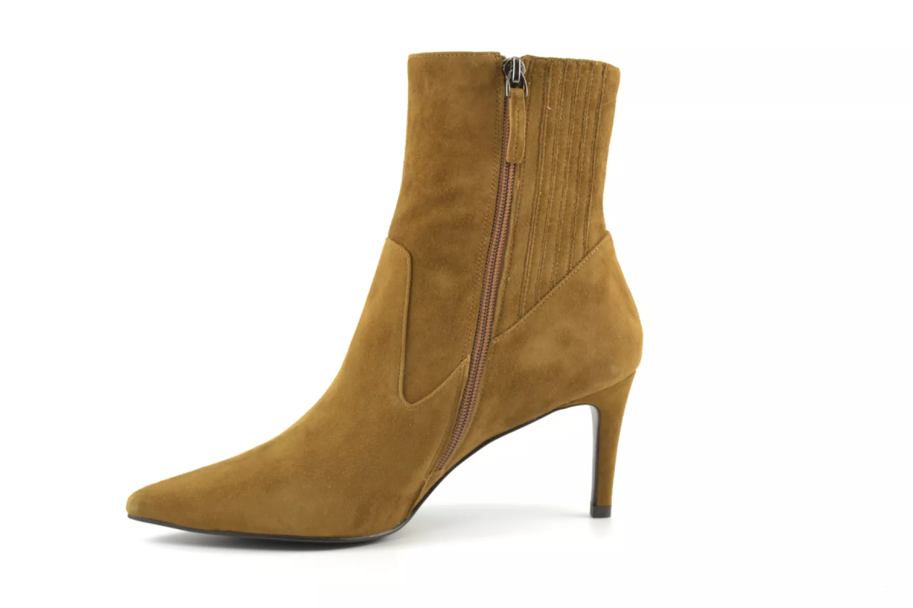details: deze mooie vrouwelijke bruin suede enkellaars heeft een spitse leest en een dun hakje