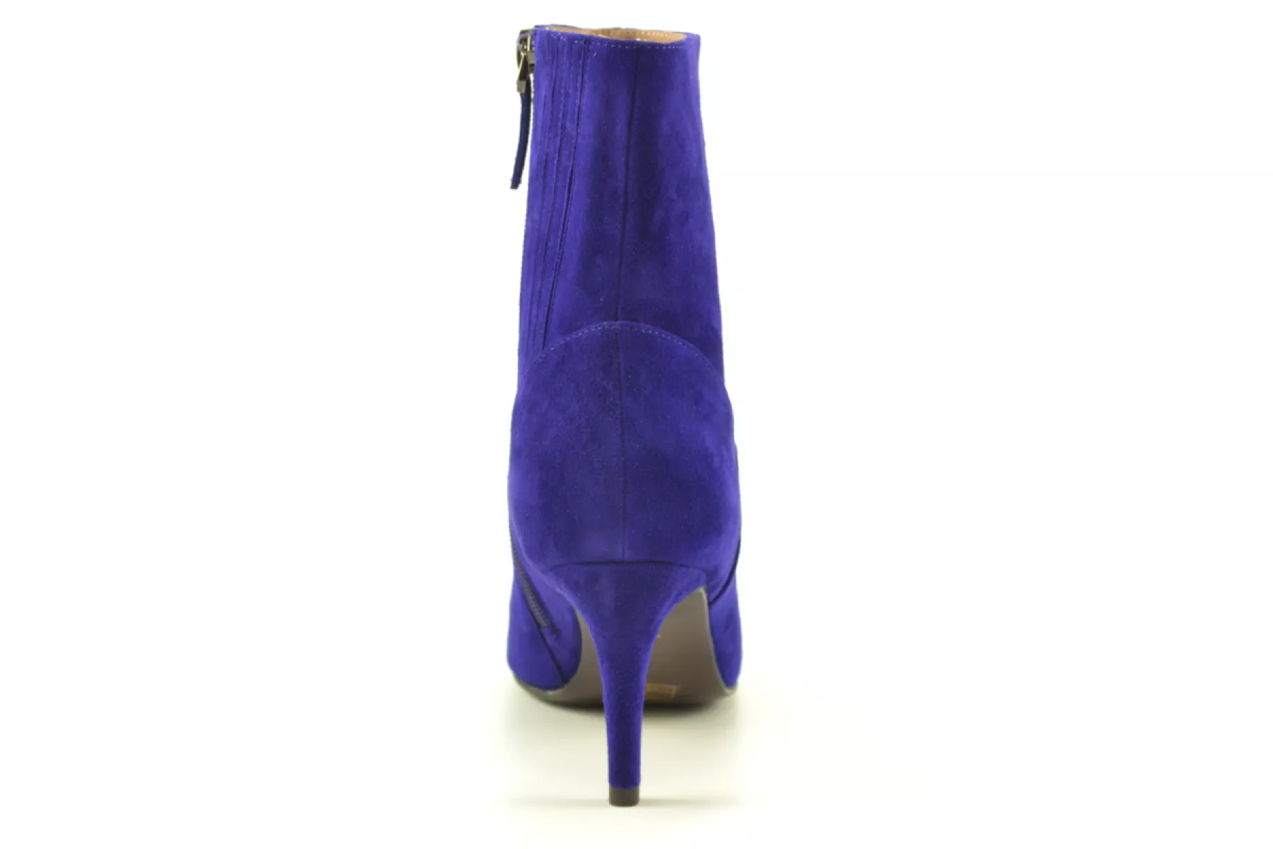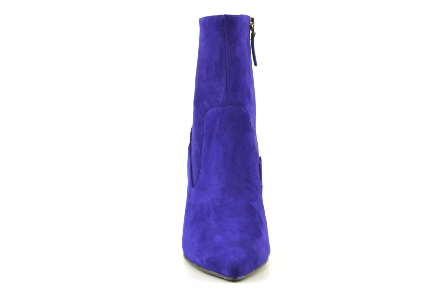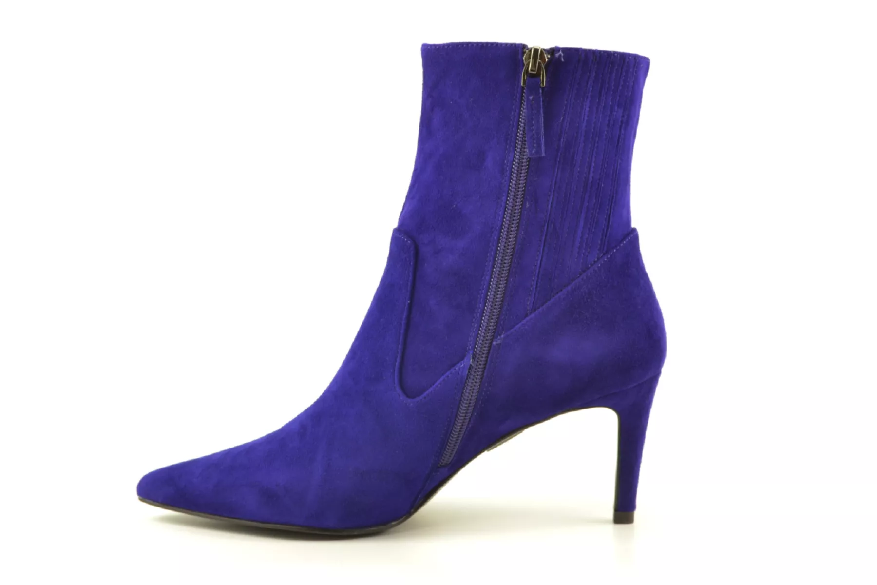 details: deze mooie vrouwelijke paars suede enkellaars heeft een spitse leest en een dun hakje