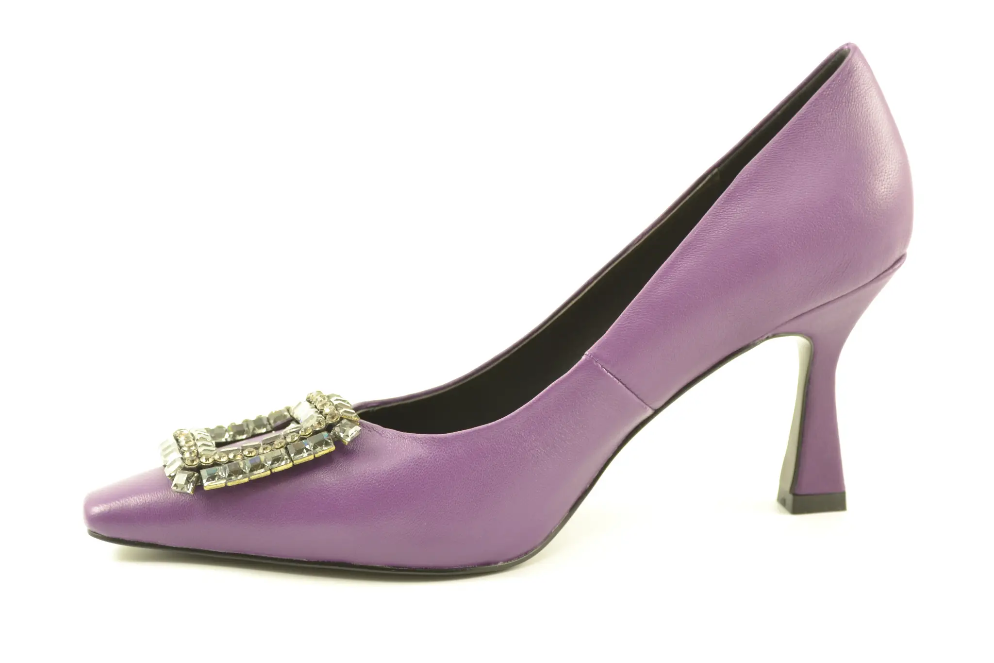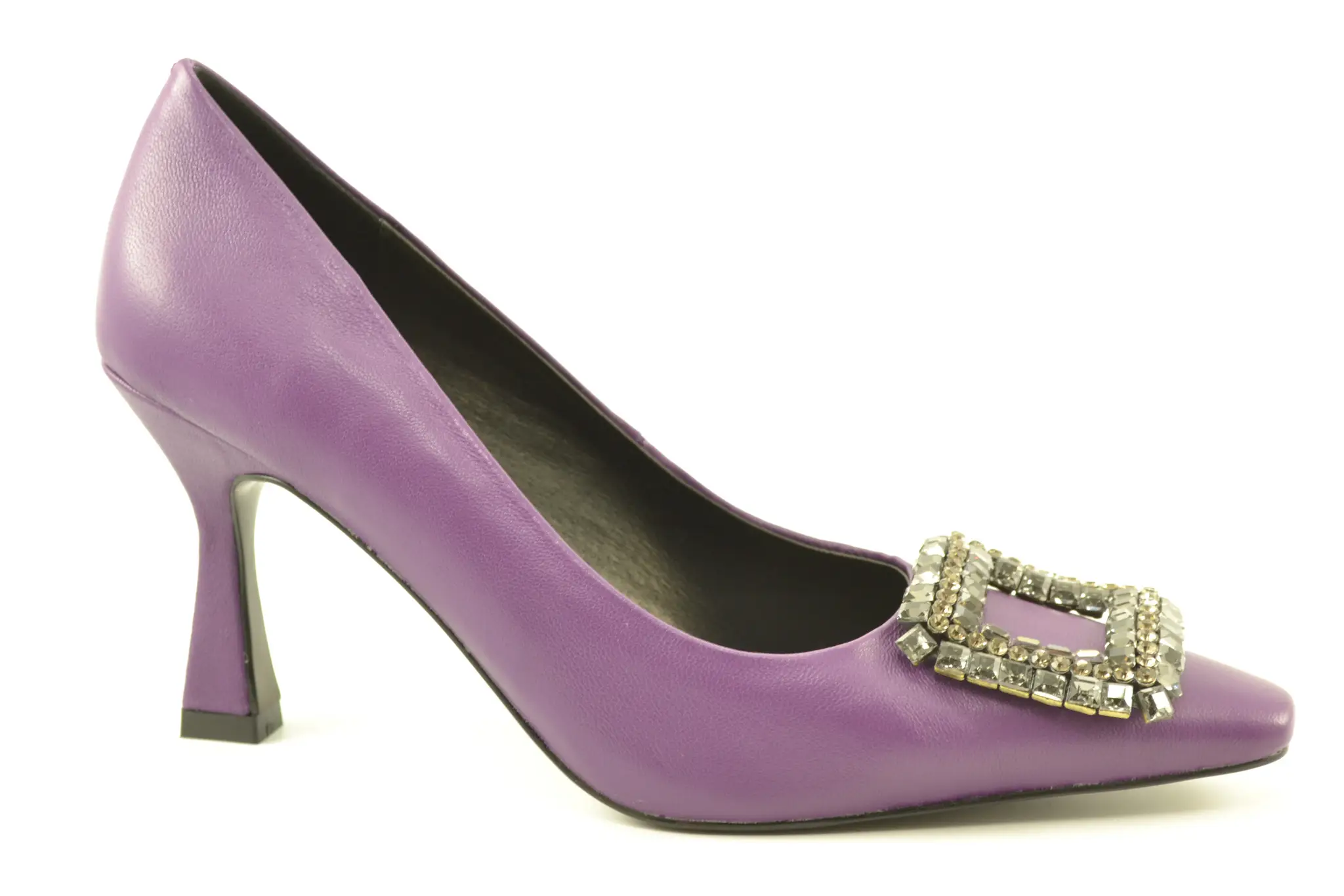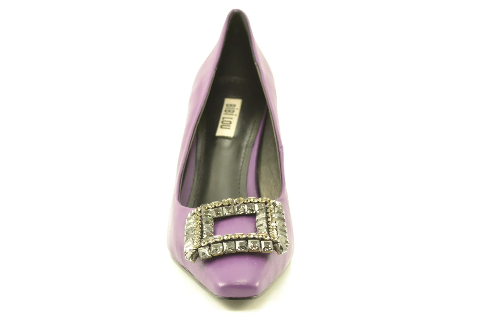 details: Een mooie lila leren pump uit de collectie van Bibi Lou. Deze pump heeft een subtiel carré neusje en een gesp met strass strass op de voorvoet. De queenie hak heeft een hoogte van 8 cm en daardoor voel je je op en top vrouw!