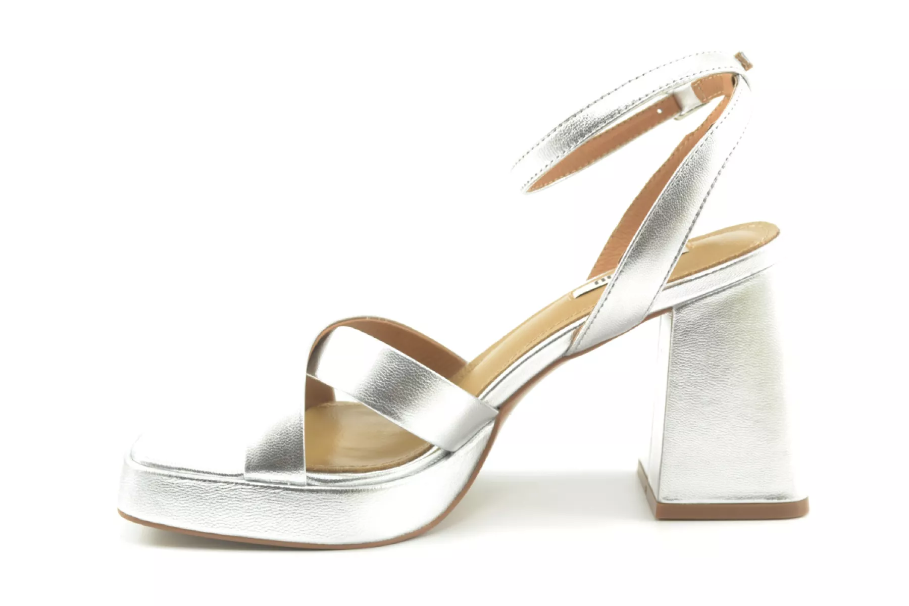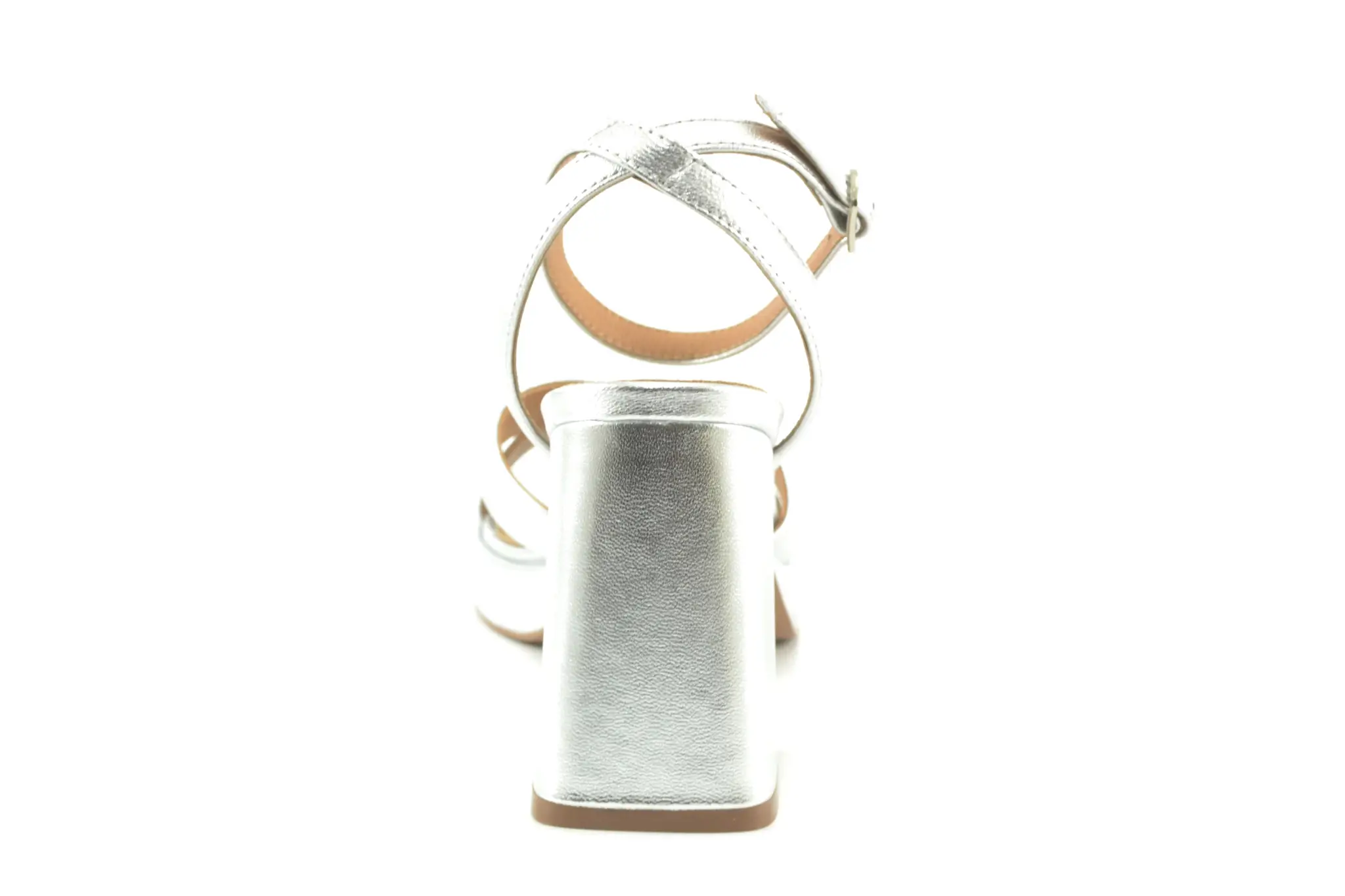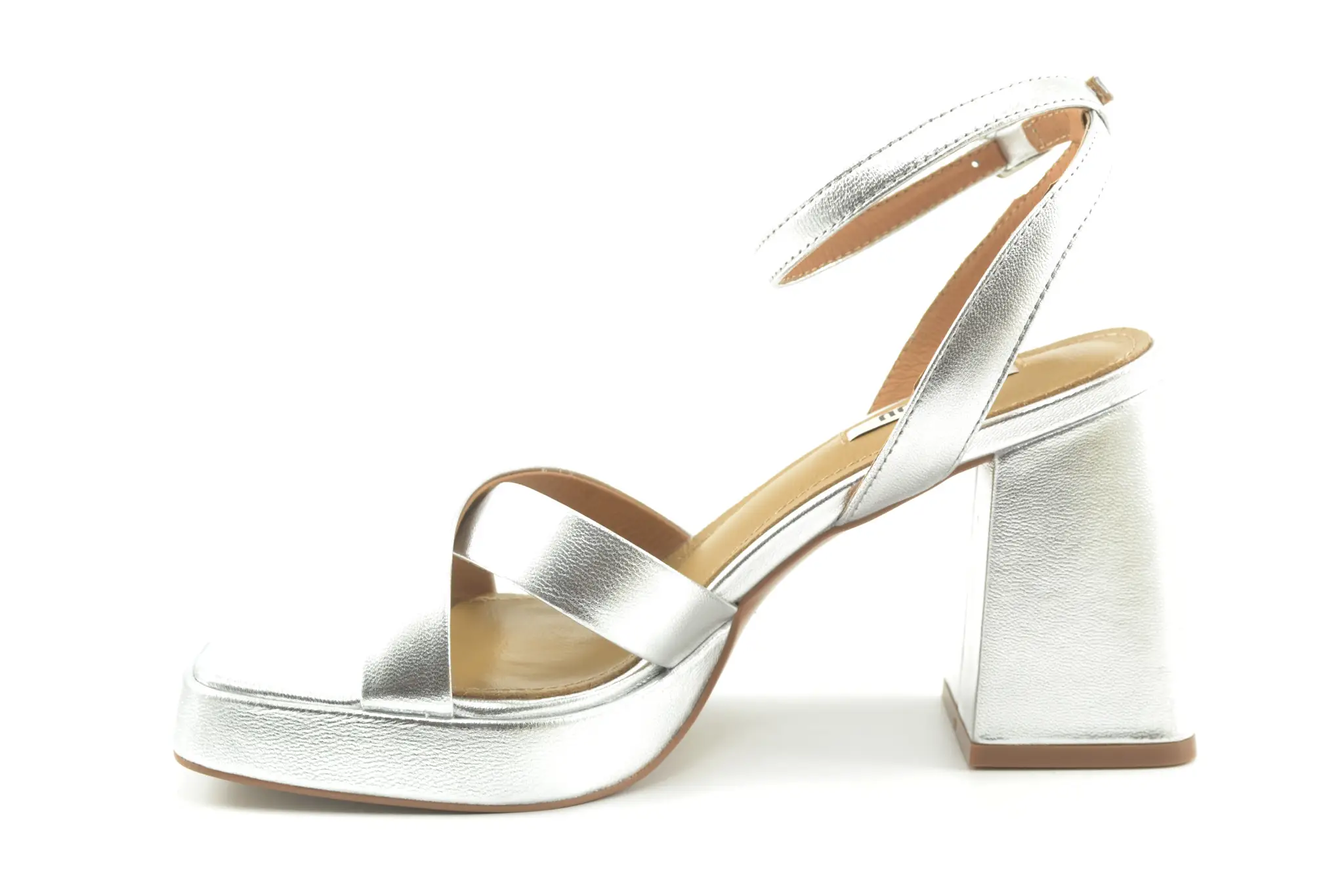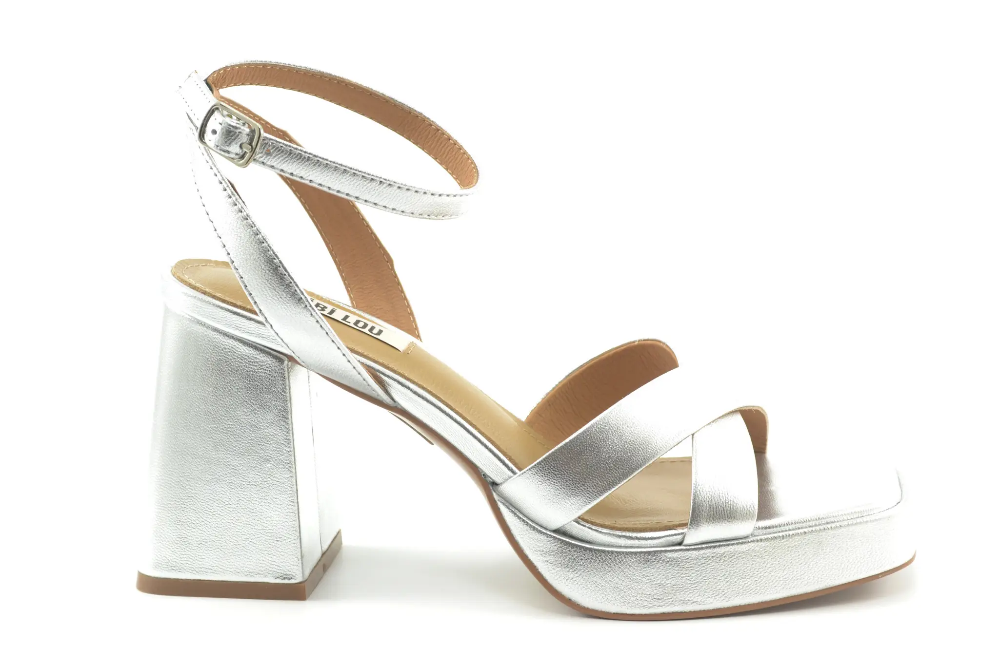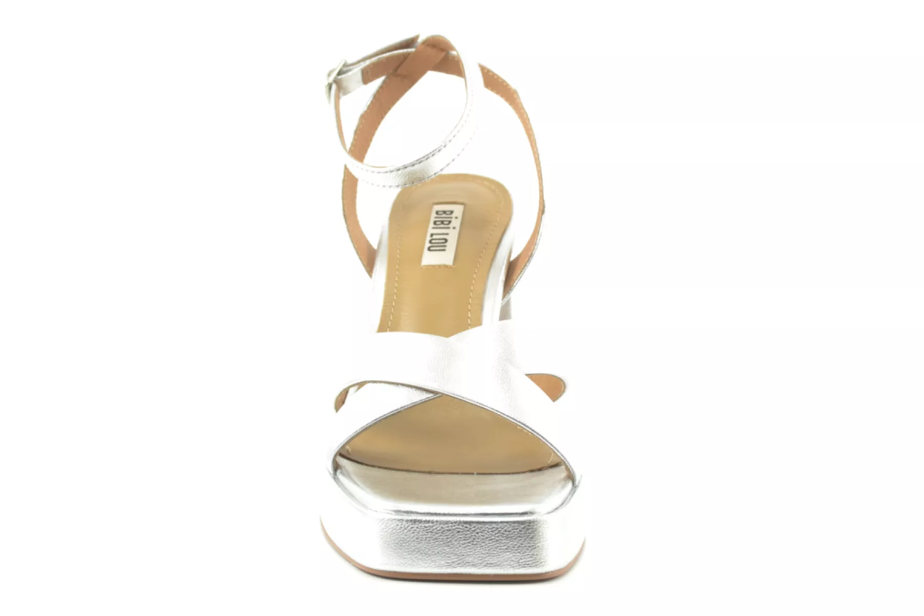 details: Het Spaanse merk Bibi Lou maakt een mooie collectie schoenen met een eigenwijze, vrouwelijke en krachtige uitstraling. Neem nou deze mooie zilver metallic leren sandalen met een platform zool van 2 cm, een carré neus en mooie hak, daar mag je toch mee gezien worden?