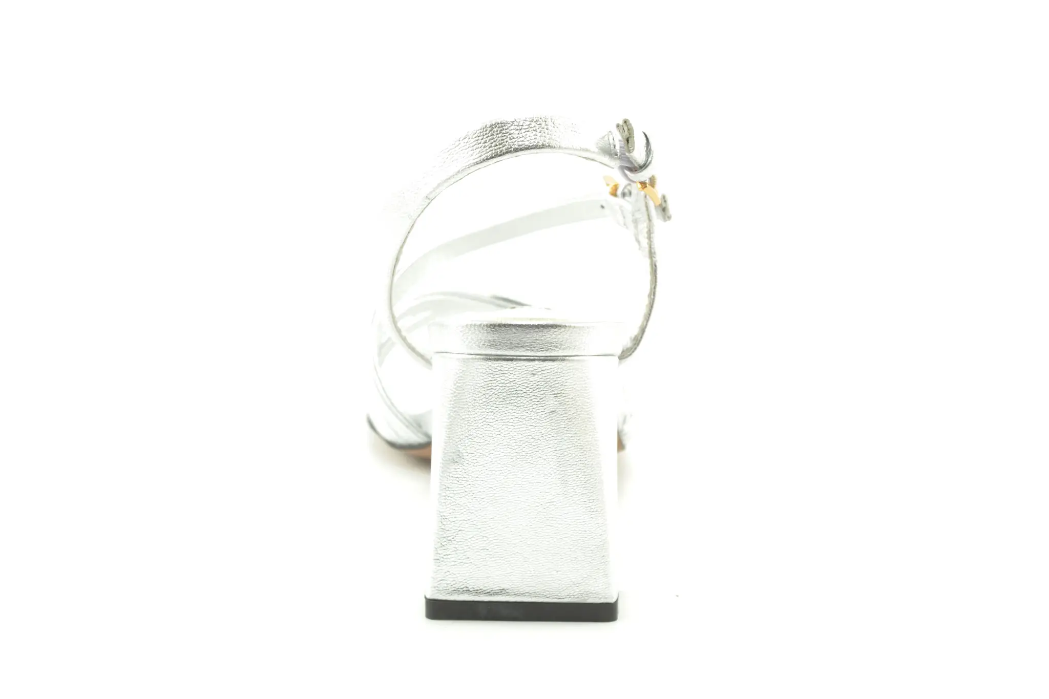 details: Het Spaanse merk Bibi Lou maakt een mooie collectie schoenen met een eigenwijze, vrouwelijke en krachtige uitstraling. Neem nou deze mooie zilverkleurige sandalen met een carré neus en mooie hak, daar mag je toch mee gezien worden?