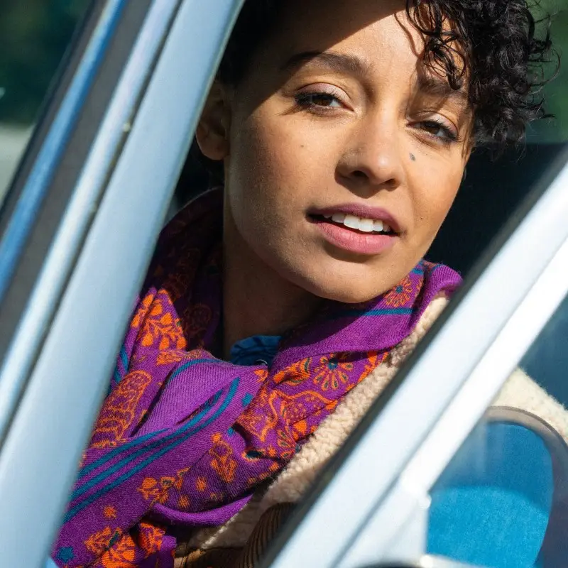 100% wollen damessjaal bloemenprint zacht en warm draag deze sjaal heel het jaar door afmeting 100 x 100 cm paars-oranje