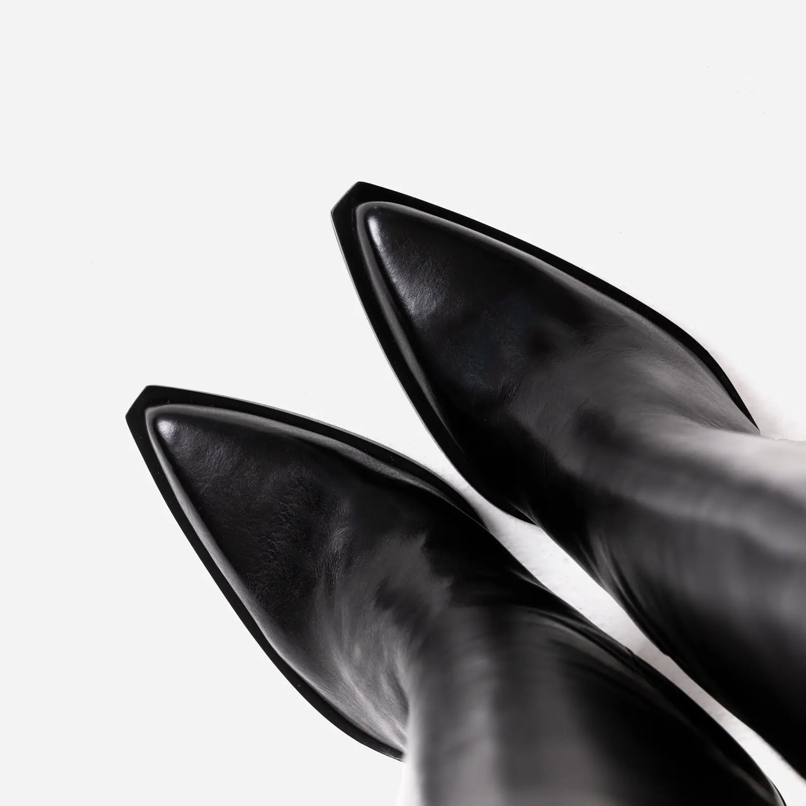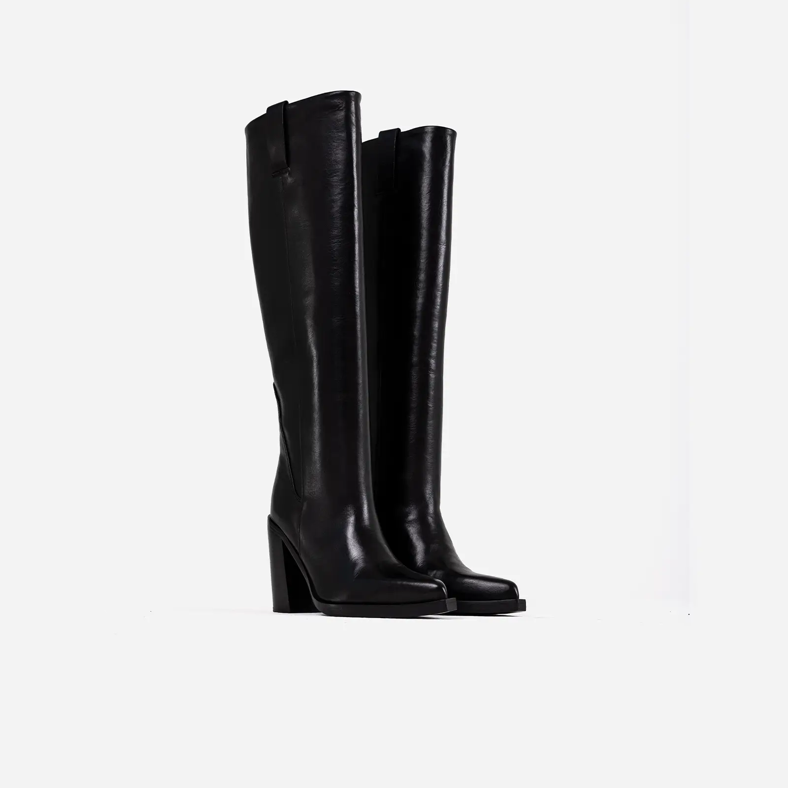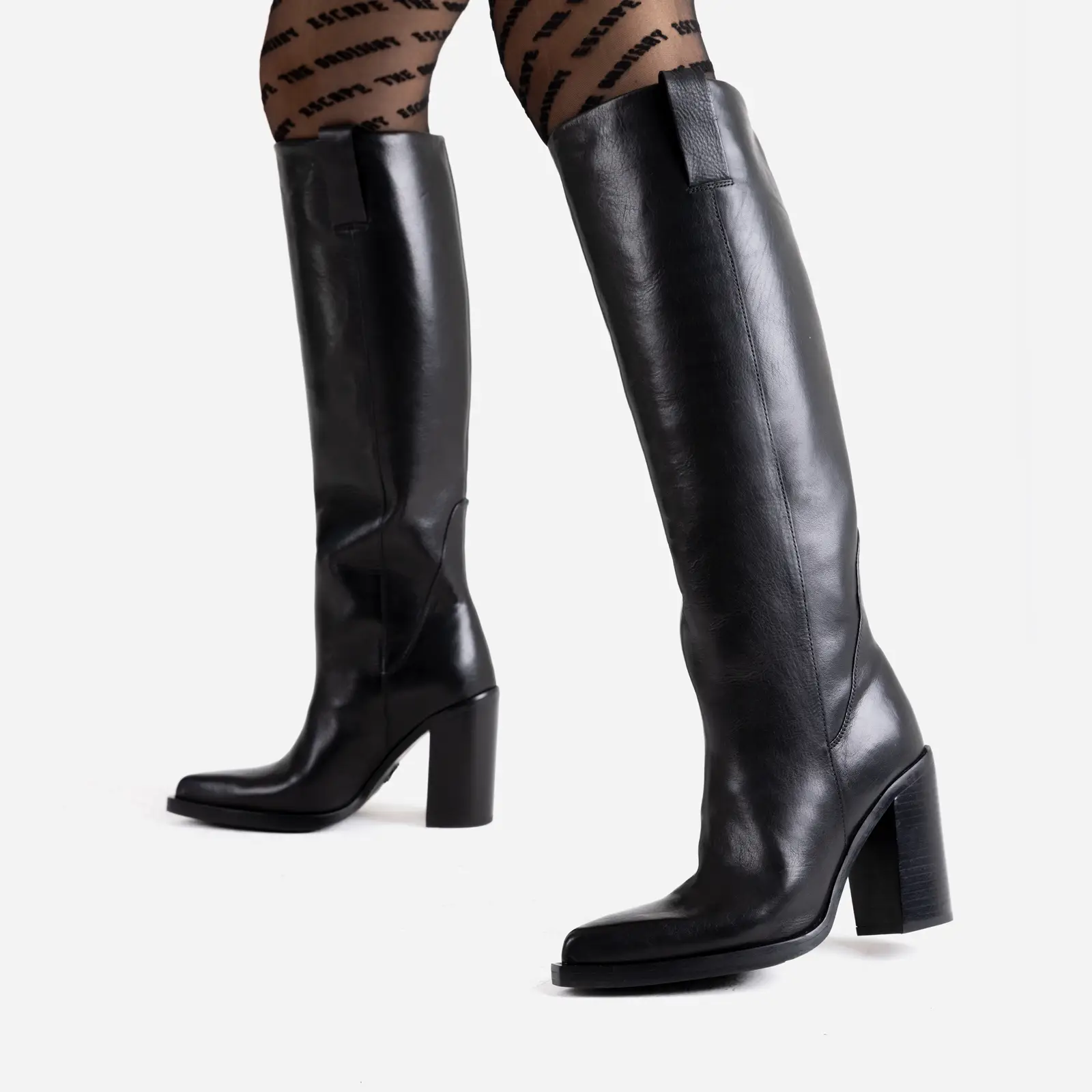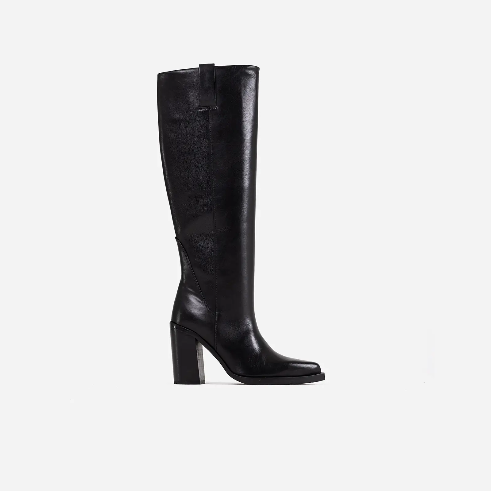 These boots are made for walking! Deze hoge laars is een echte eye-catcher. De laars heeft een hak van 9,5 cm en is glanzend zwart. Deze laars kan wat strakker om de kuit heen zitten. Upgrade your look with these babes!