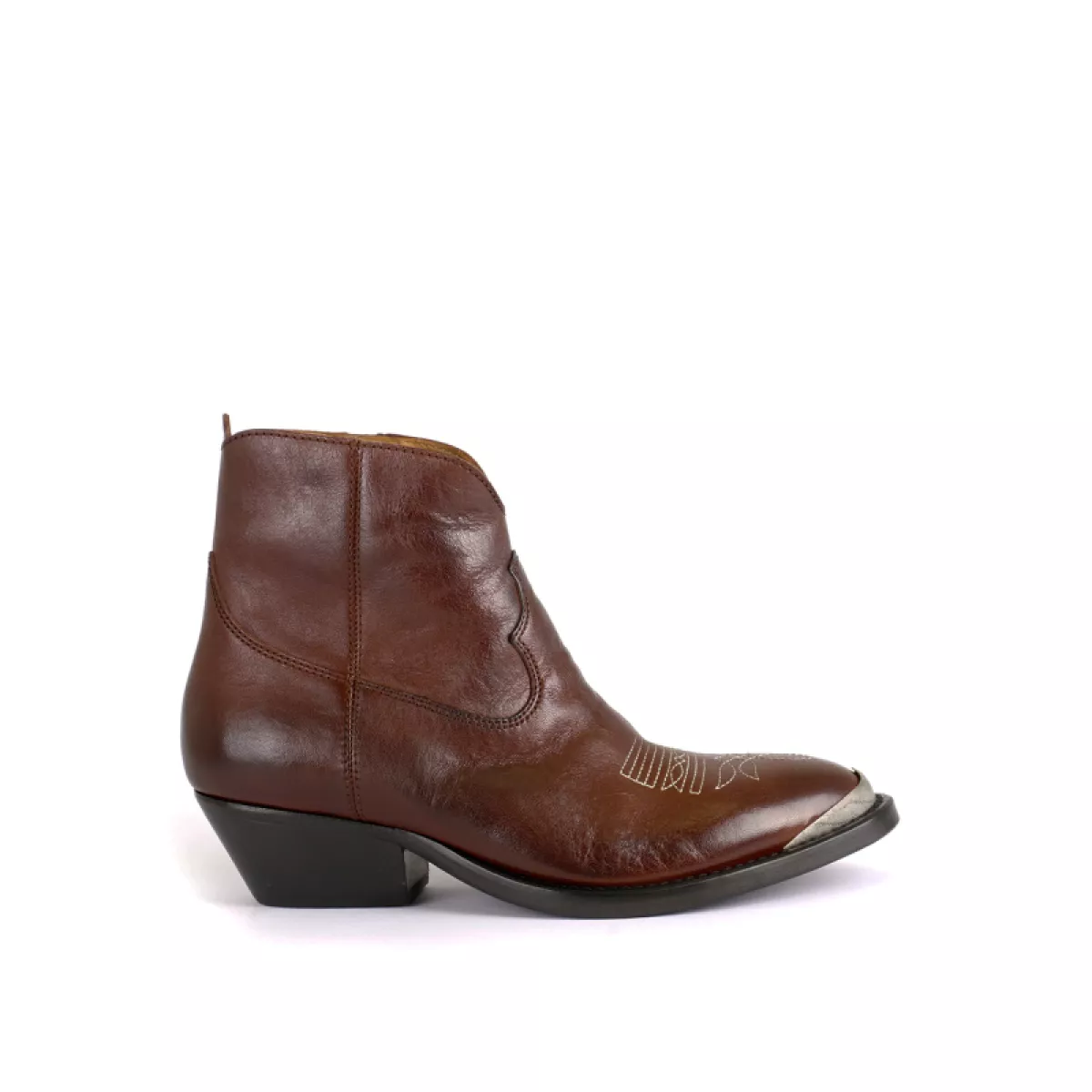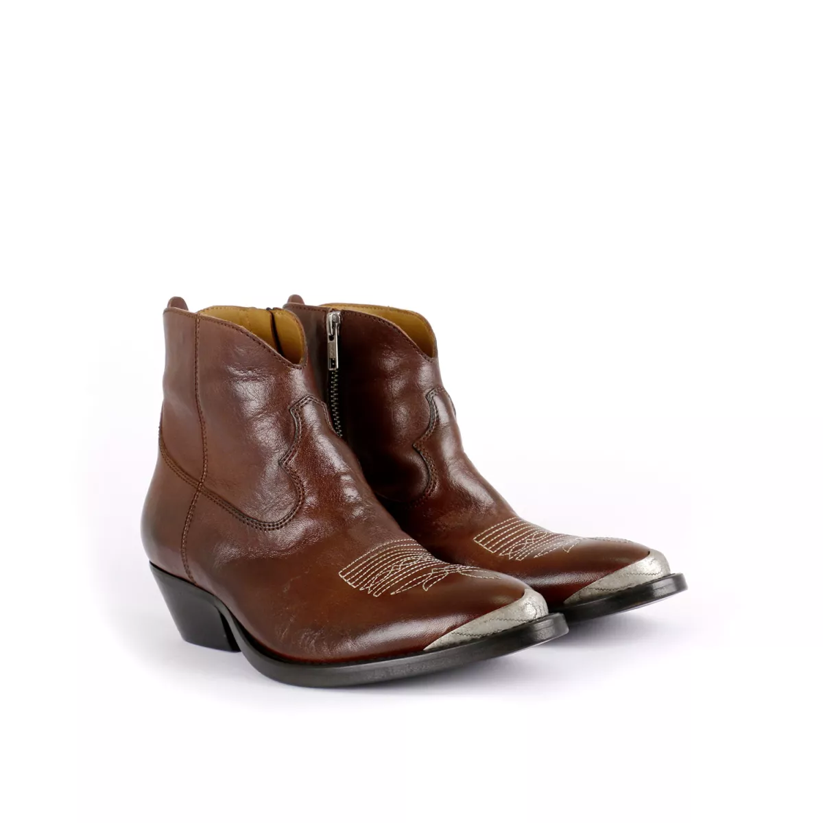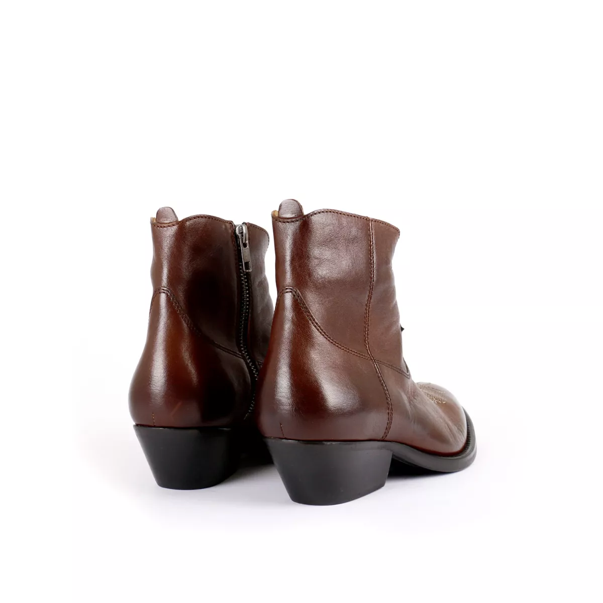 Deze enkelhoge westerboot genaamt Olsen is gemaakt van bruin gewassen leer, heeft een sierstiksel op de voorvoet en een zilverkleurig detail op de neus. Mooier maken ze ze niet.