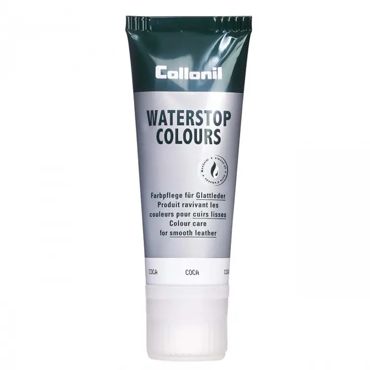 De Waterstop crème bevat amandelolie voor extra voeding aan glad en verrijkt leer. Dit laat het leer extra glanzen en frist de kleuren op. Eenvoudig aan te brengen dankzij de spons op de tube. Deze is als een dop te verwijderen, zodat de crème ook met een borstel aangebracht kan worden. De Waterstop tube is verkrijgbaar in een kleurloze variant en in verschillende kleuren.