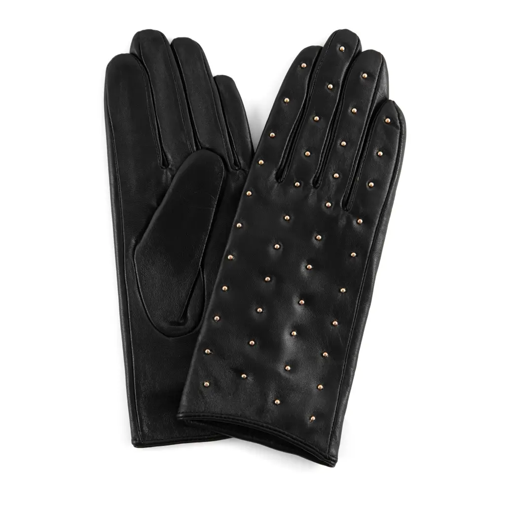 mooie vrouwelijke zwart leren handschoenen met goudkleurige studs