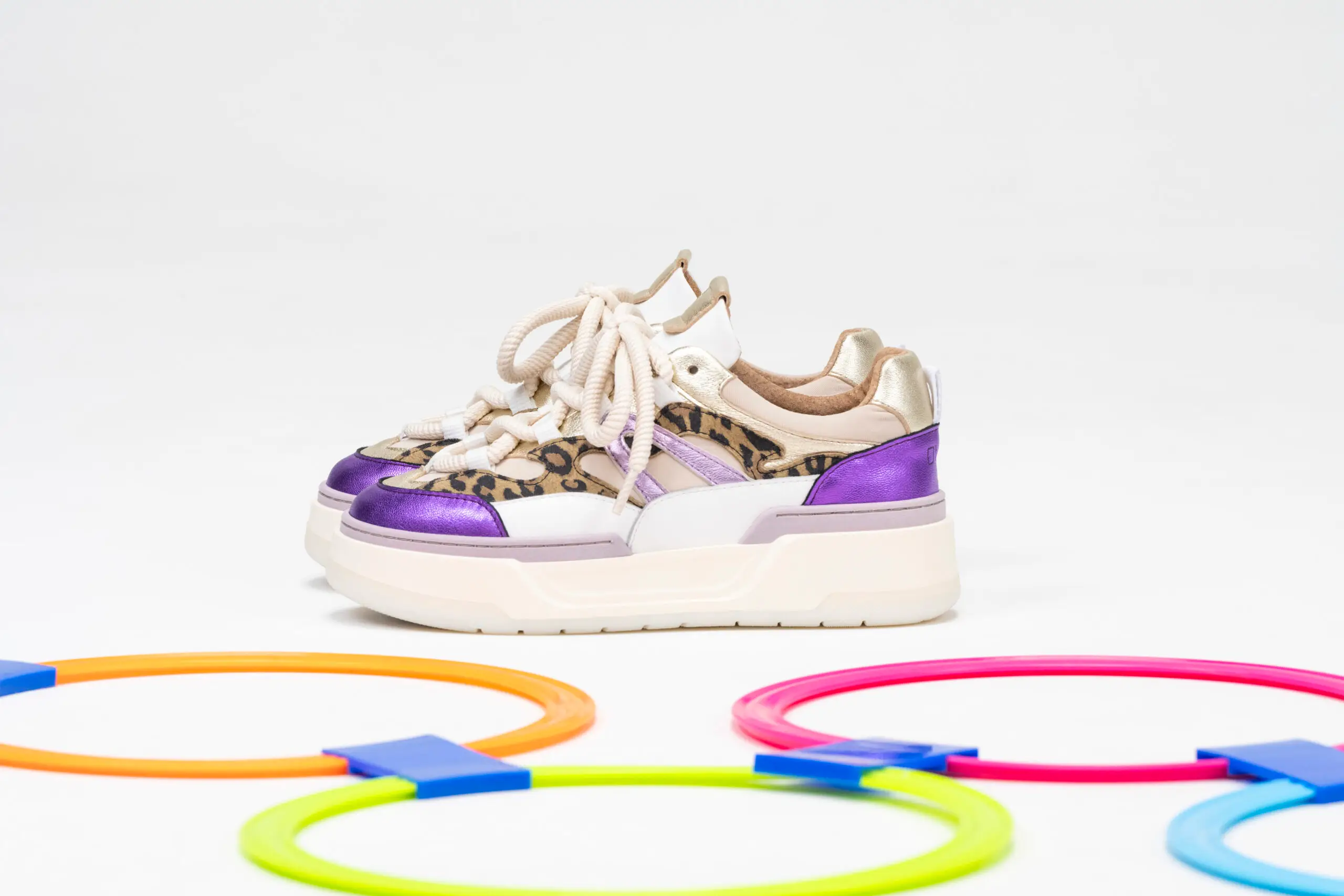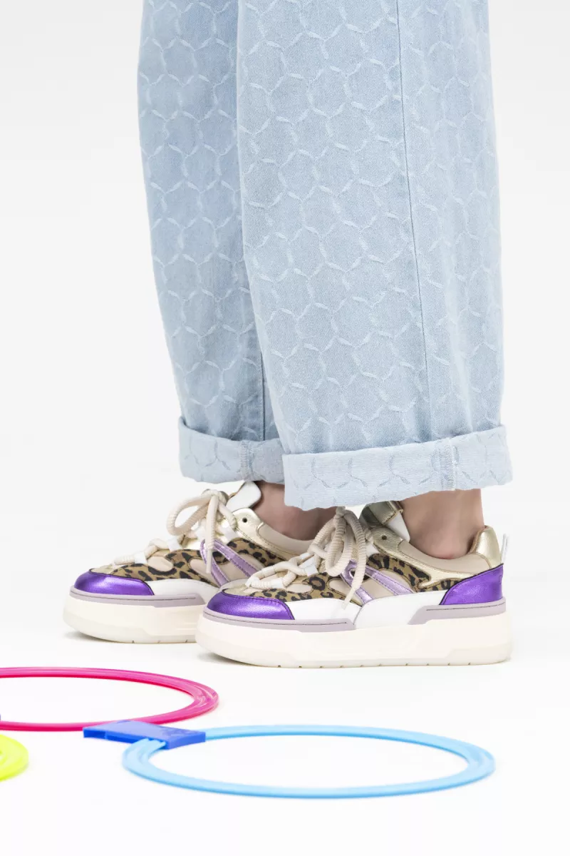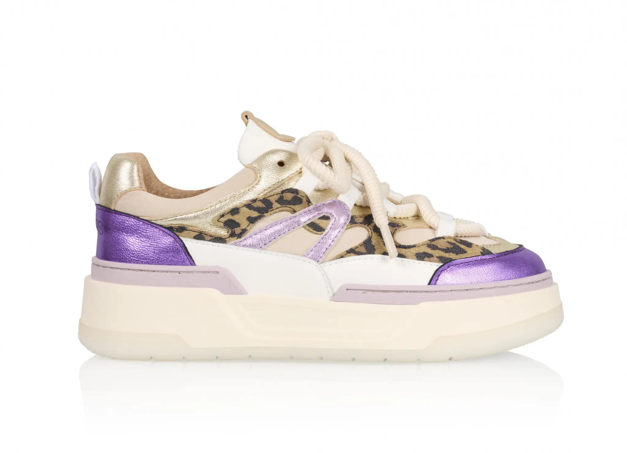 De Walton sneaker is nieuw bij DWRS. Een sneaker met een hoge / dikke zool als dit model is een must in je schoenenkast. Deze sneaker voor dames is aan de buitenzijde van metallic en leopard stof en de binnenzijde is volledig van leer. Met de dikke veters door de schoen val je zeker op! Doe jij mee met de trend?