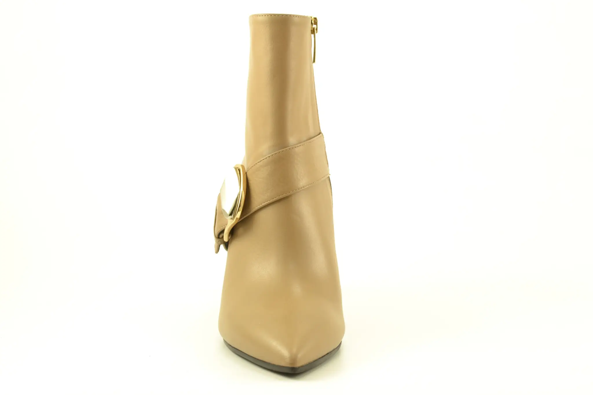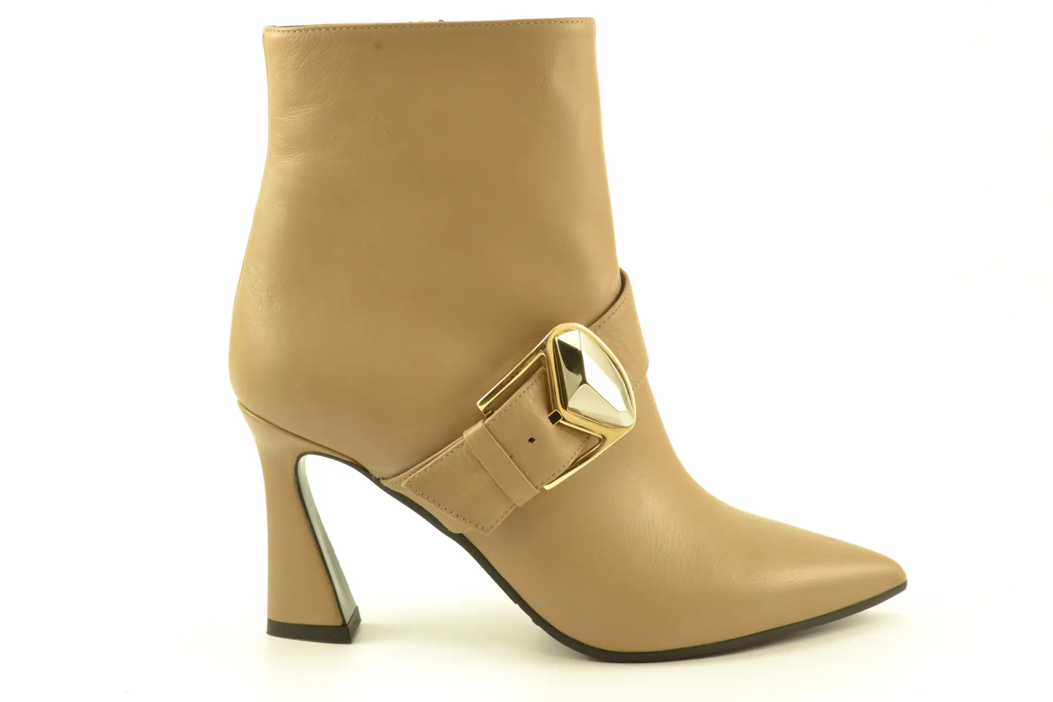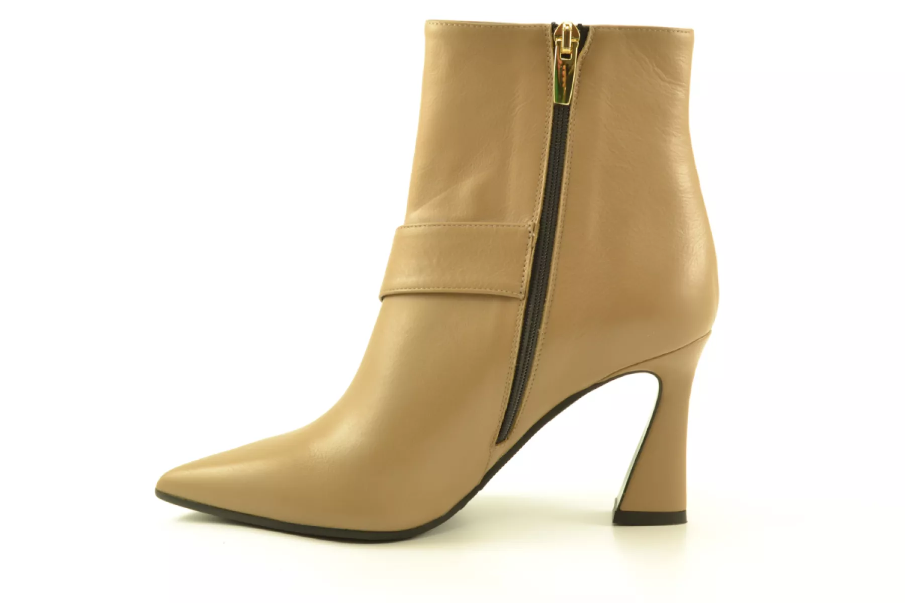 details: met deze mooie beige leren enkellaars in versie van een hak ben je helemaal on trend dit seizoen. De spitse leest en band met goudkleurig detail op de wreef maakt dit laarsje helemaal af! Mooi door zijn eenvoud…