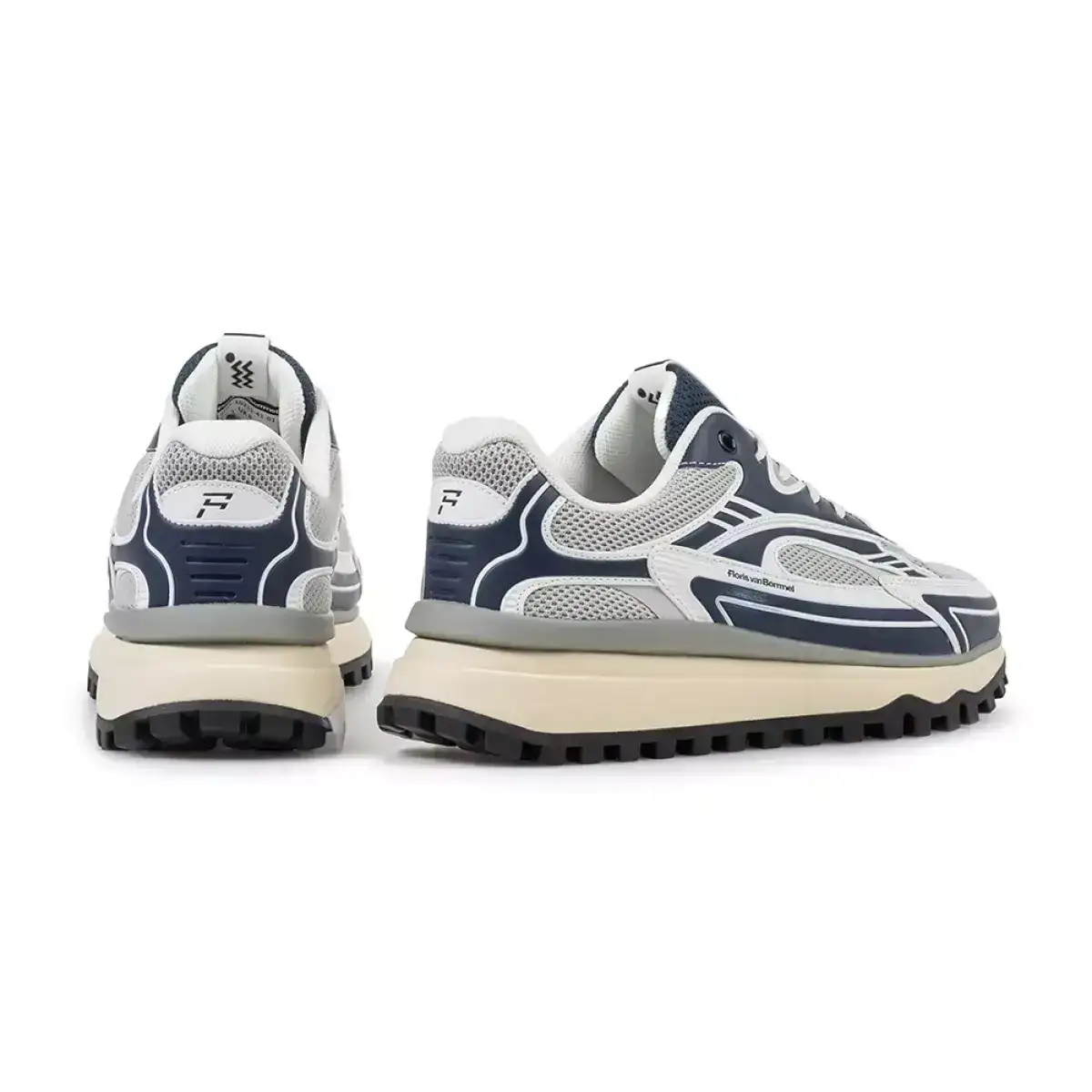 Dit is De Gripper, een sneaker op een robuuste runnerzool met bij de hiel een langgerekte stabilizer. De sneaker is uitgevoerd in een technische materiaalmix van high frequency panelen van polyurethaan en verschillende types mesh. De mesh heeft als detaillering op enkele plaatsen reflecterende heatseals. De voering is gemaakt van sportief, kwalitatief hoogwaardig mesh materiaal. Het voetbed is volledig uitneembaar en kan, indien gewenst, vervangen worden door een eigen inlegzool of steunzool. Met een leest in wijdte G1/2 biedt deze sneaker een comfortabele en ruime pasvorm. Op tong is een rubberen label aangebracht met het Floris van Bommel logo.