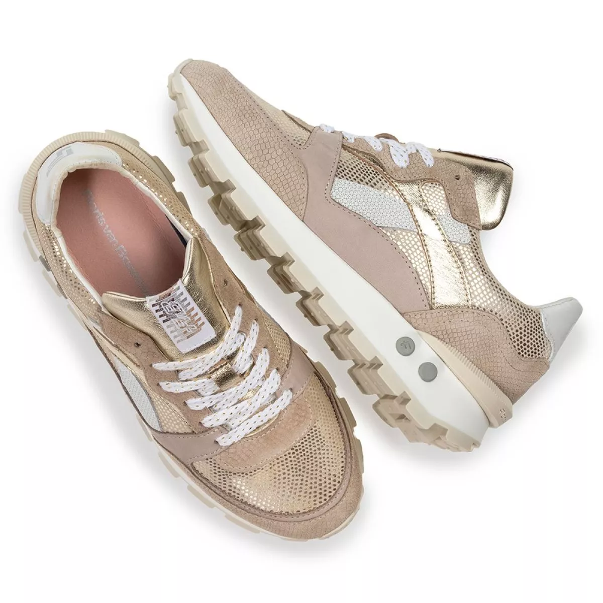 Deze sportieve runner is uitgevoerd met een markante zool. Het loopvlak bestaat uit stevige blokjes die goed zichtbaar zijn vanaf de zijkant. Op de zijkant van de zool zijn 2 ronde plugs aangebracht en bij de hiel is een robuuste stabilizer op de zool gemonteerd. Op de lekkere zachte tong is een label gestikt met op de voorkant een FvB logo en op de achterkant een levensinzicht van Floris. In zijn totaliteit is dit een lekkere vlotte trendy sneaker waar je uren aan een stuk op kunt lopen. Deze variant is uitgevoerd in suède, wit geprint leer en goud geprint leer.