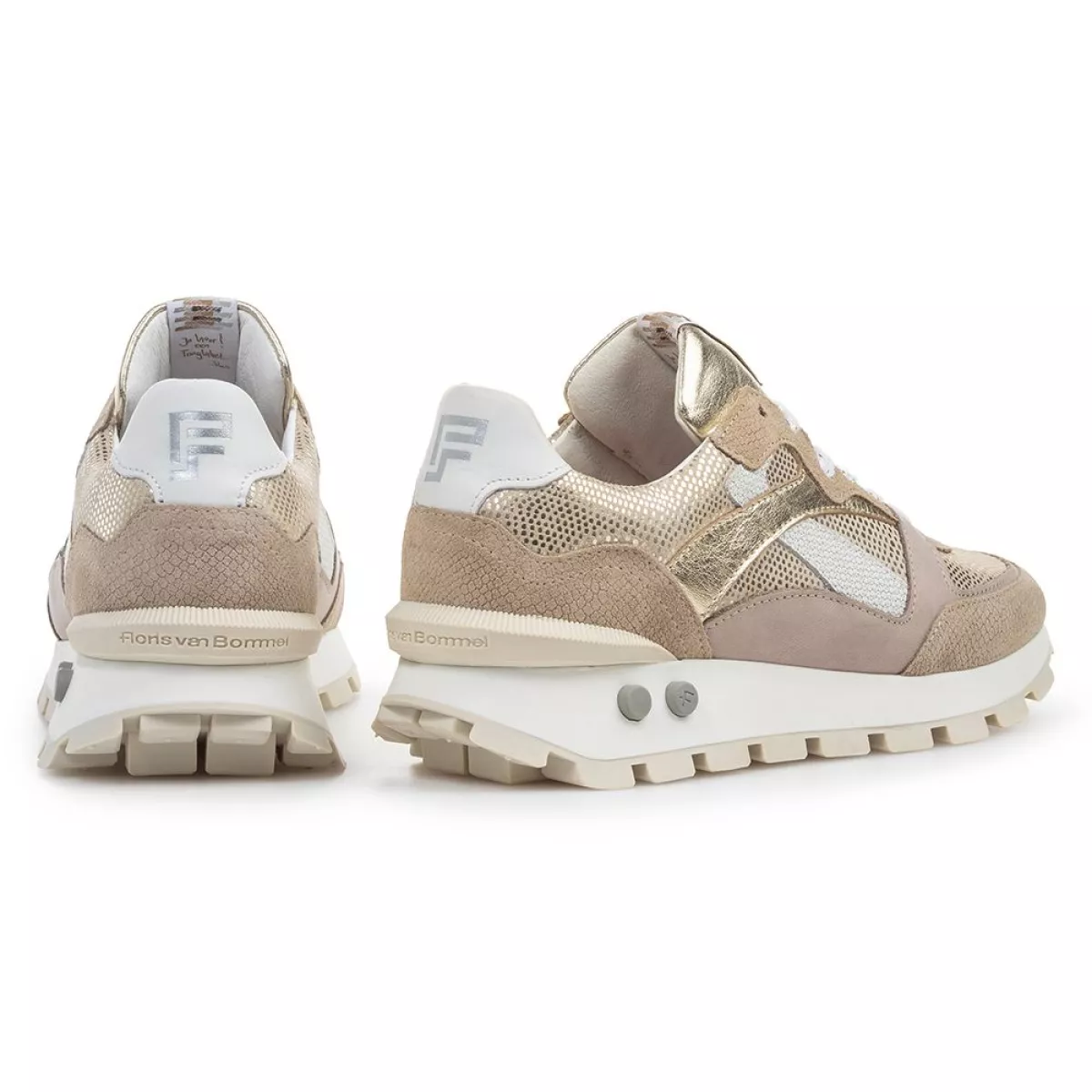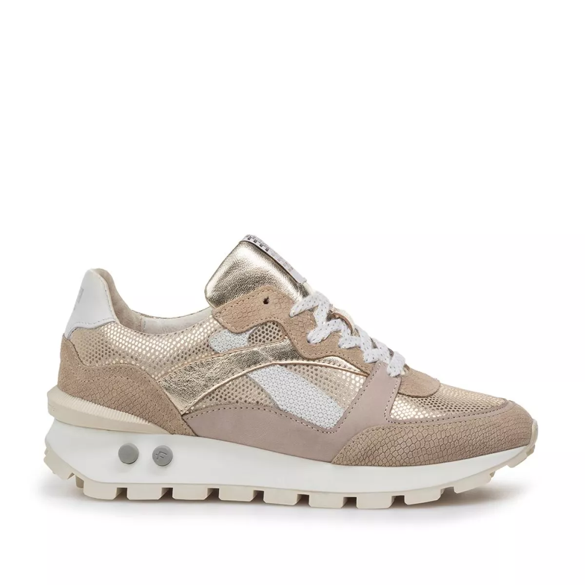 Deze sportieve runner is voorzien van een opvallende zool. Het loopvlak bestaat uit stevige blokjes die goed zichtbaar zijn vanaf de zijkant. Aan de zijkant van de zool zijn twee ronde plugs aangebracht, en bij de hiel is een robuuste stabilizer gemonteerd. Op de zachte tong is een metallic label gestikt, met aan de binnenkant een grappige tekst. De schoen is gevoerd met hoogwaardig leer, wat aanzienlijk bijdraagt aan het draagcomfort. Het voetbed, dat ook met leer bekleed is, is uitneembaar en kan eventueel worden vervangen door een eigen voetbed of steunzool. Deze variant is uitgevoerd in een taupekleurige mix van verschillende materialen.