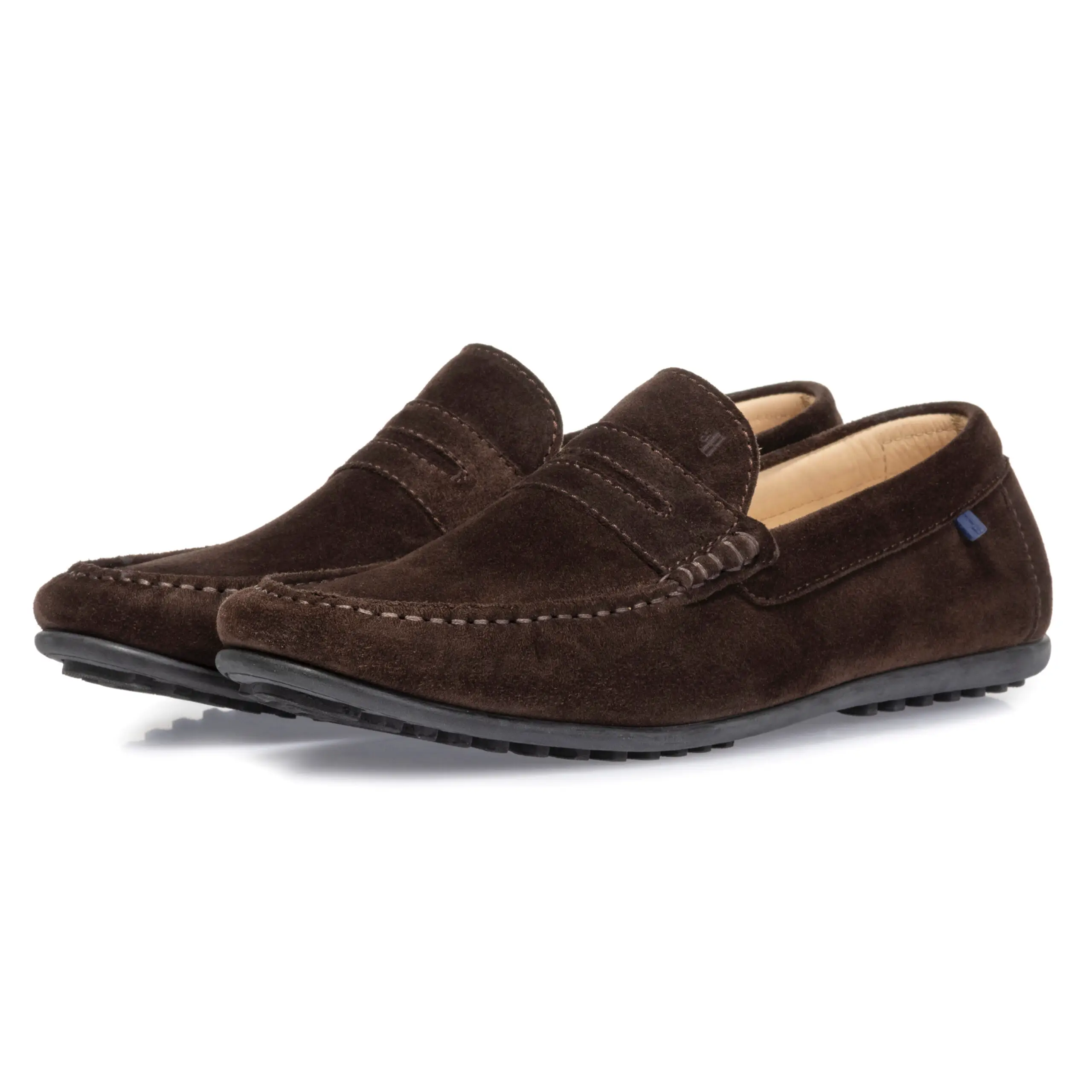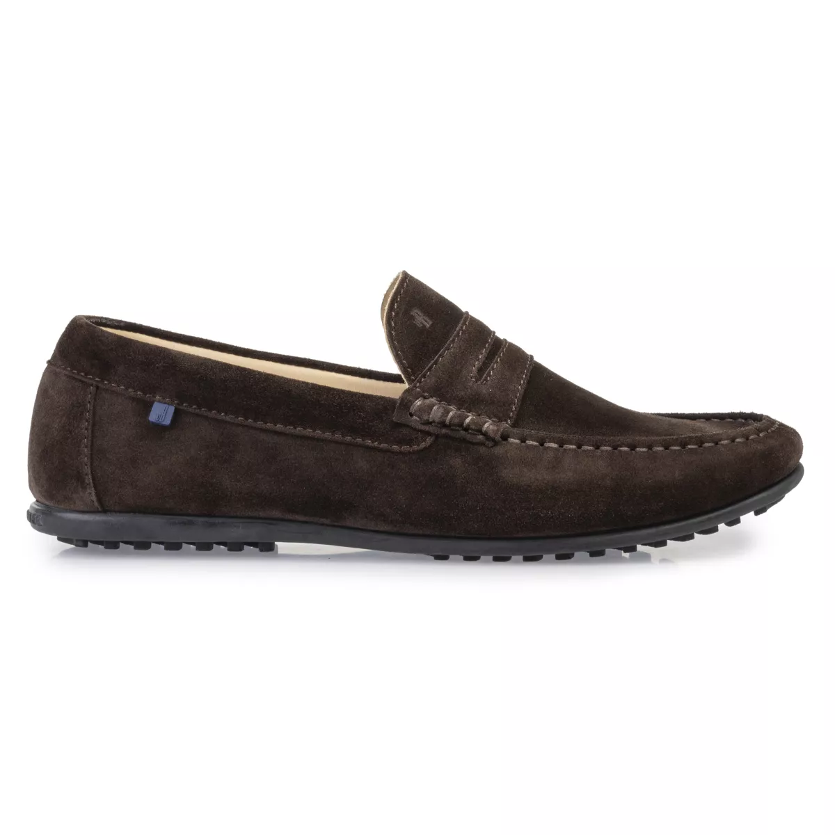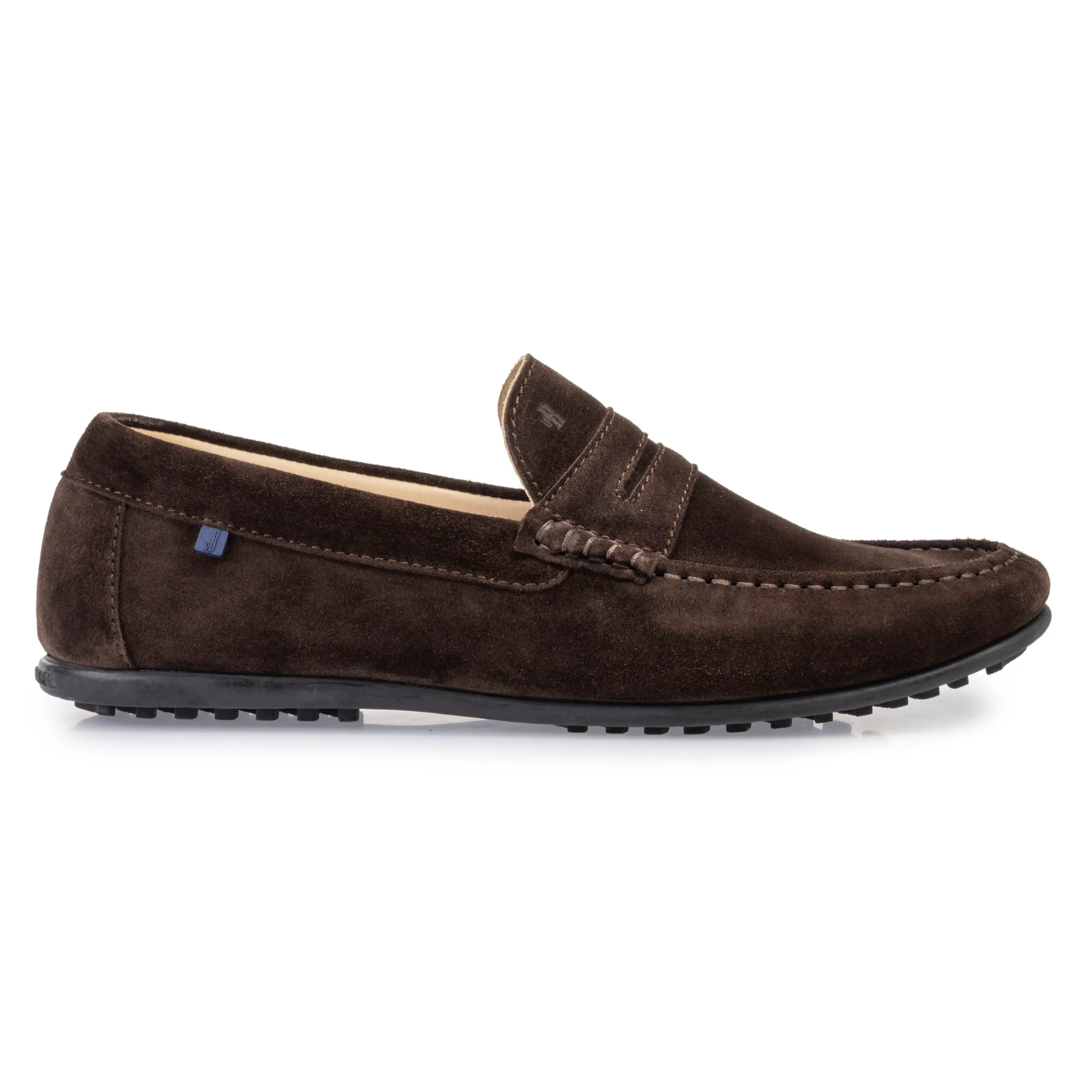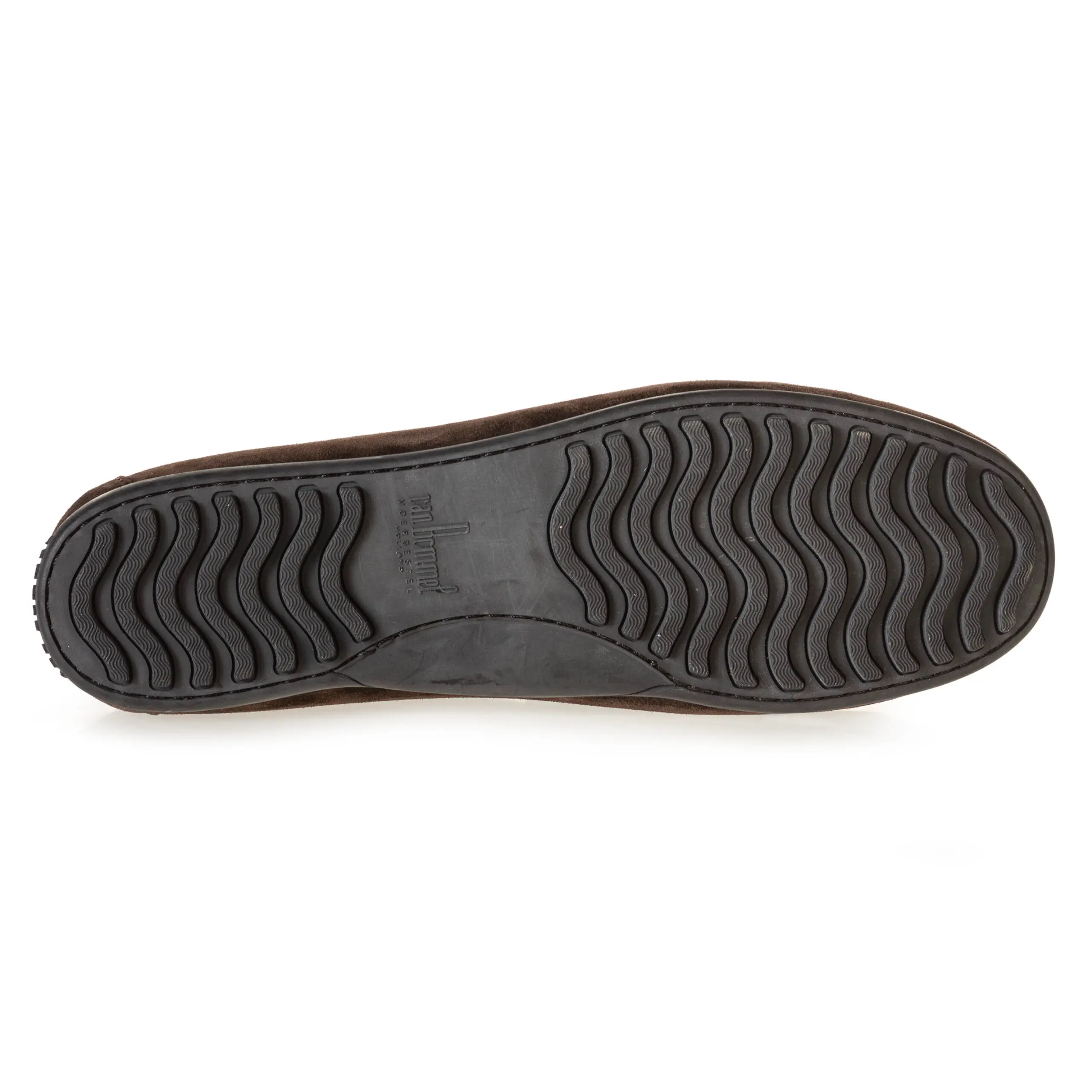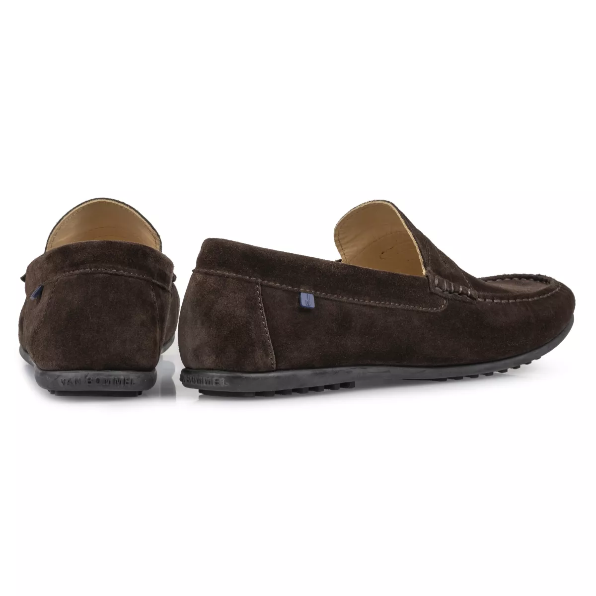Ook dit jaar mag een leren mocassin met een casual twist niet ontbreken in de Van Bommel collectie. De uitvoering in donkerbruin suède en de penny op de upper geven dit model zijn klassiek tintje. De zwarte rubberen loopzool, de sierstiksels en de blauwe Van Bommel tag daarentegen zorgen voor het sportieve, zomerse uiterlijk. De donkerbruine kleur is gemakkelijk te combineren en de ook de voering is volledig van leer.