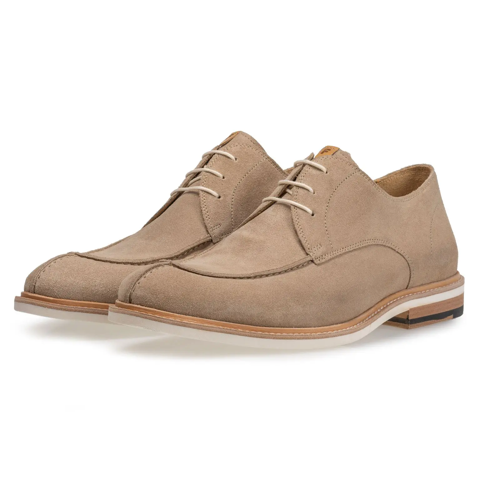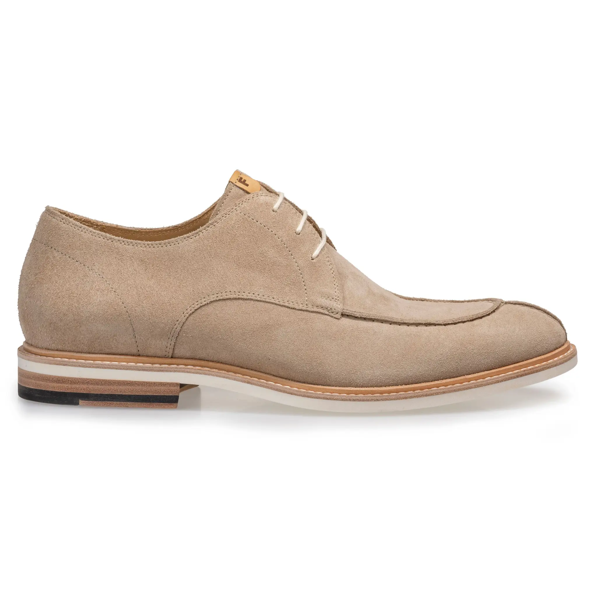 details: Een mix aan luchtige maar toch luxe materialen zorgt ervoor dat dit model zijn eigen casual karakter neerzet. Het lichtbruine suede wordt gecombineerd met witte accenten in de veter en zool. Ook de lichtere sierstiksels geven deze schoen zijn casual uitstraling. Maak je outfit compleet met de bijpassende riem van Floris.