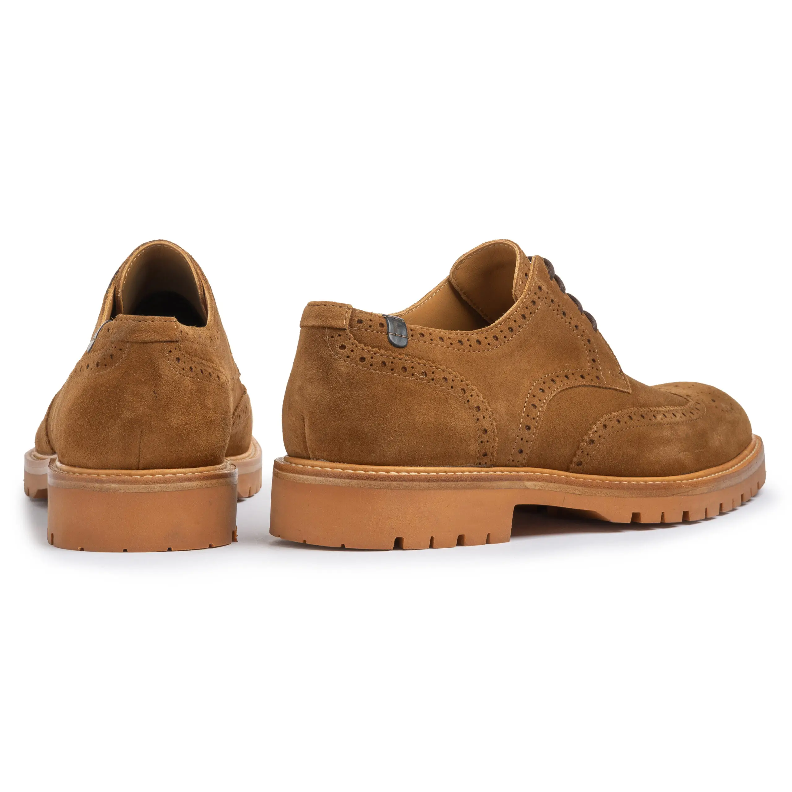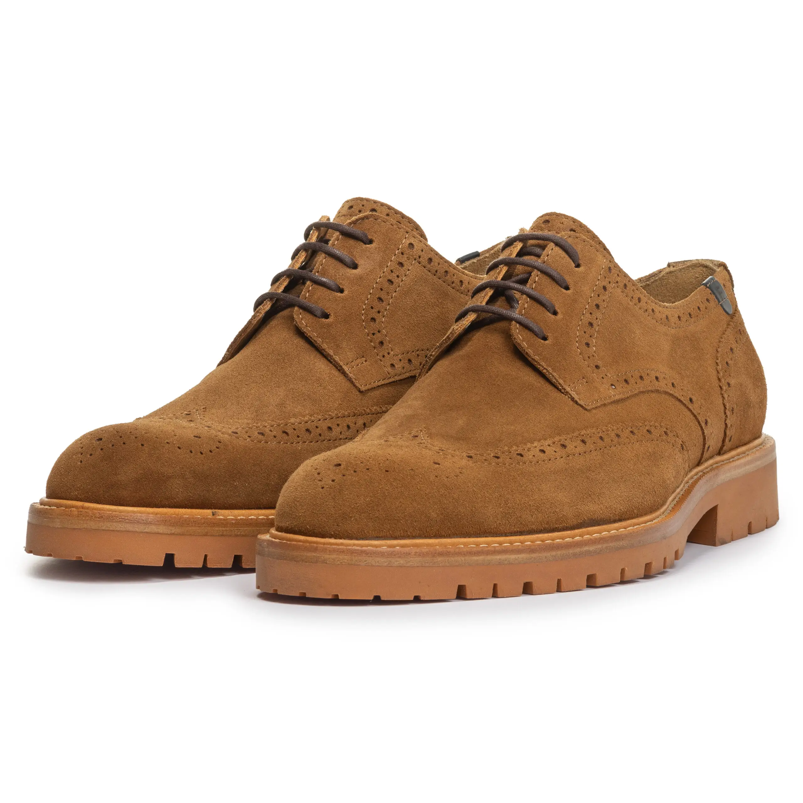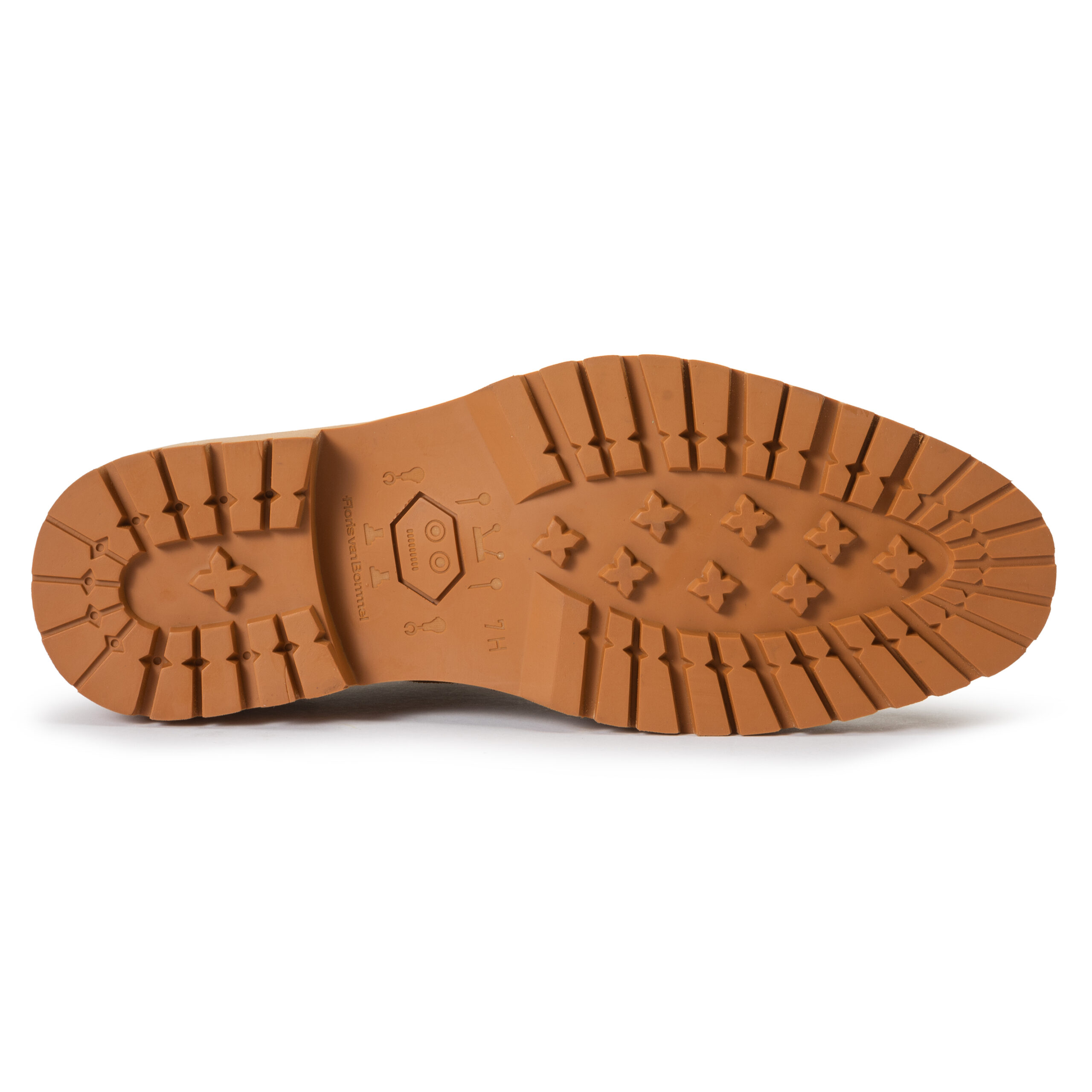 Deze schoen valt op door zijn warme brique kleurige profielzool. De zool is luxe afgewerkt met een dubbele lederen zoolrand. De schoen is gemaakt op een leest met een H-wijdte. Dit betekent dat de schoen een wat ruimer pasbereik heeft. Dankzij de derbysluiting is er eventueel ook ruimte voor een net wat hogere wreef of bredere voet. Het derby broguemodel geeft de schoen een jong klassieke uitstraling. De schoen is uitgevoerd met een voering van kwalitatief hoogwaardig kalfsleer. Het volledige voetbed is uitneembaar en eventueel te verwisselen met een eigen voetbed of steunzool. Achter op de hiel is een klein lederen labeltje geplaatst met daarop de letter F. Het bovenwerk is uitgevoerd in cognac getint Italiaanse suéde met een mooie rijke vleug.