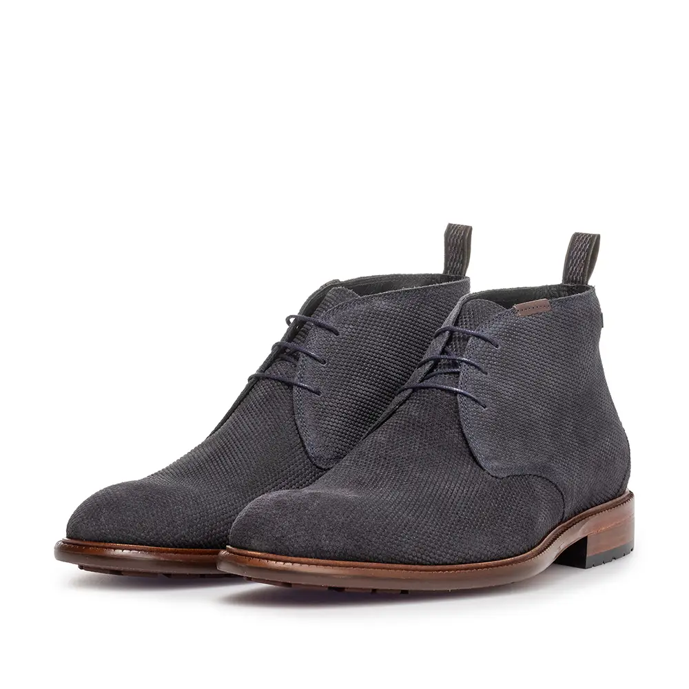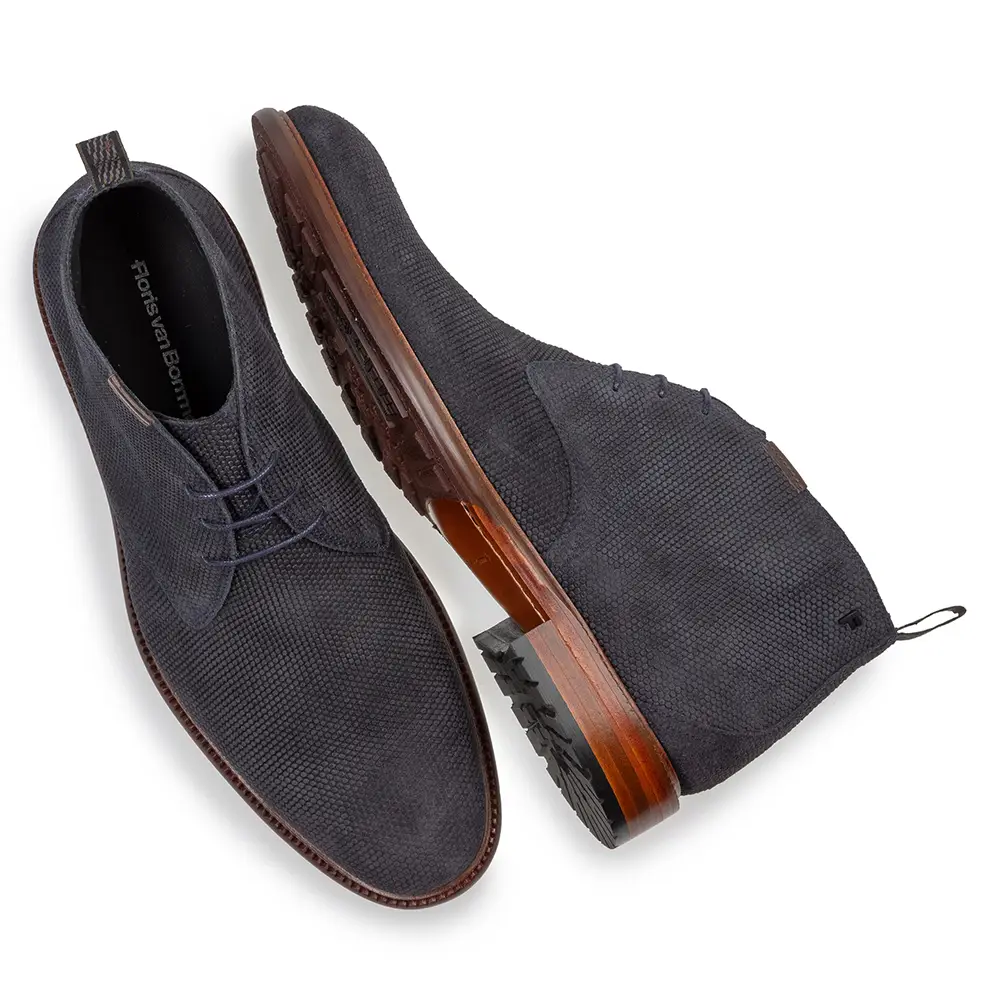 Deze nette boot is uitgevoerd met een stevige rubberzool die afgewerkt is met een luxe lederen zoolrand. Het lichte profiel onder op het loopvlak geeft de boot een verzorgde informele uitstraling. De boot is van binnen afgewerkt met grijze kalfsvoering van de hoogste kwaliteit. De binnenzool is voorzien van een volledig uitneembaar voetbed dat eventueel verwisseld kan worden voor een eigen voetbed of steunzool. De boot is gemaakt op een H-leest. Dit garandeert een breed pasbereik met ook ruimte voor de net wat bredere voet. Achter bij de hiel is in het bovenwerk een rubberen logo in de vorm van een ‘F’ verwerkt. Het donkerblauwe suède van deze boot heeft een informele uitstraling. Het is na het looiproces in het looivat gewassen en daarna voorzien van een stijlvolle geometrische print.