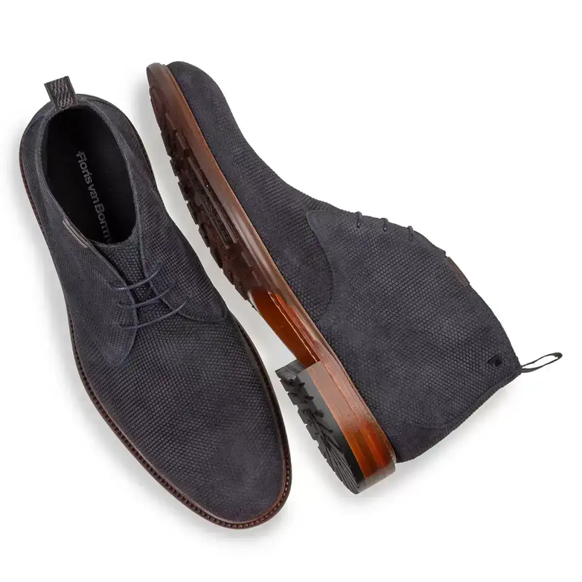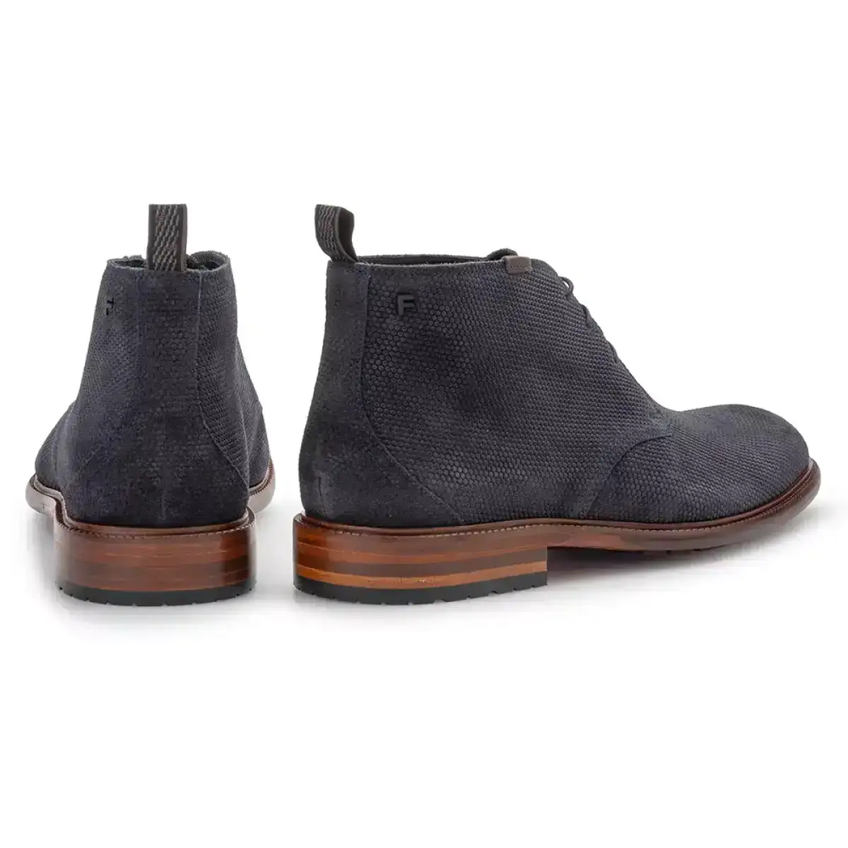 Deze nette boot is uitgevoerd met een stevige rubberzool die afgewerkt is met een luxe lederen zoolrand. Het lichte profiel onder op het loopvlak geeft de boot een verzorgde informele uitstraling. De boot is van binnen afgewerkt met grijze kalfsvoering van de hoogste kwaliteit. De binnenzool is voorzien van een volledig uitneembaar voetbed dat eventueel verwisseld kan worden voor een eigen voetbed of steunzool. De boot is gemaakt op een H-leest. Dit garandeert een breed pasbereik met ook ruimte voor de net wat bredere voet. Achter bij de hiel is in het bovenwerk een rubberen logo in de vorm van een F verwerkt. Het donkerblauwe suède van deze boot heeft een informele uitstraling. Het is na het looiproces in het looivat gewassen en daarna voorzien van een stijlvolle geometrische print.