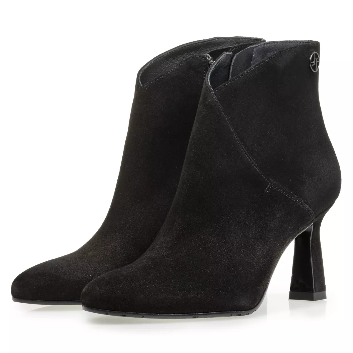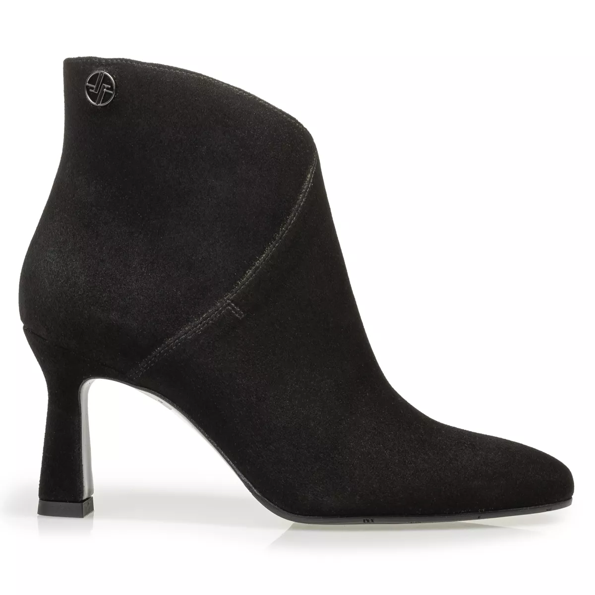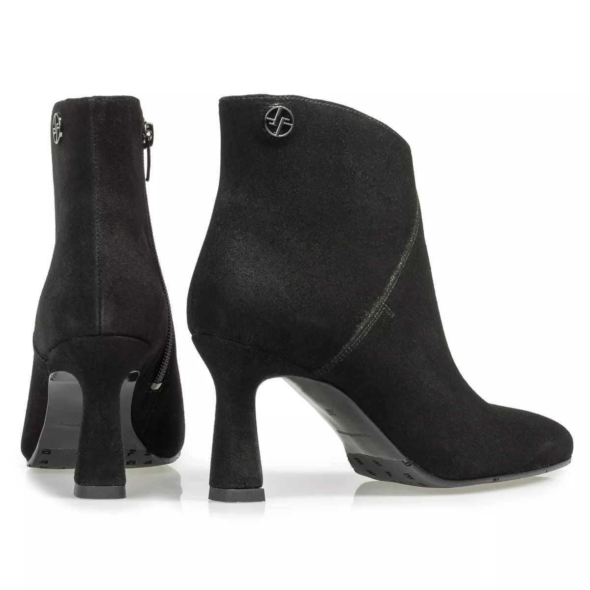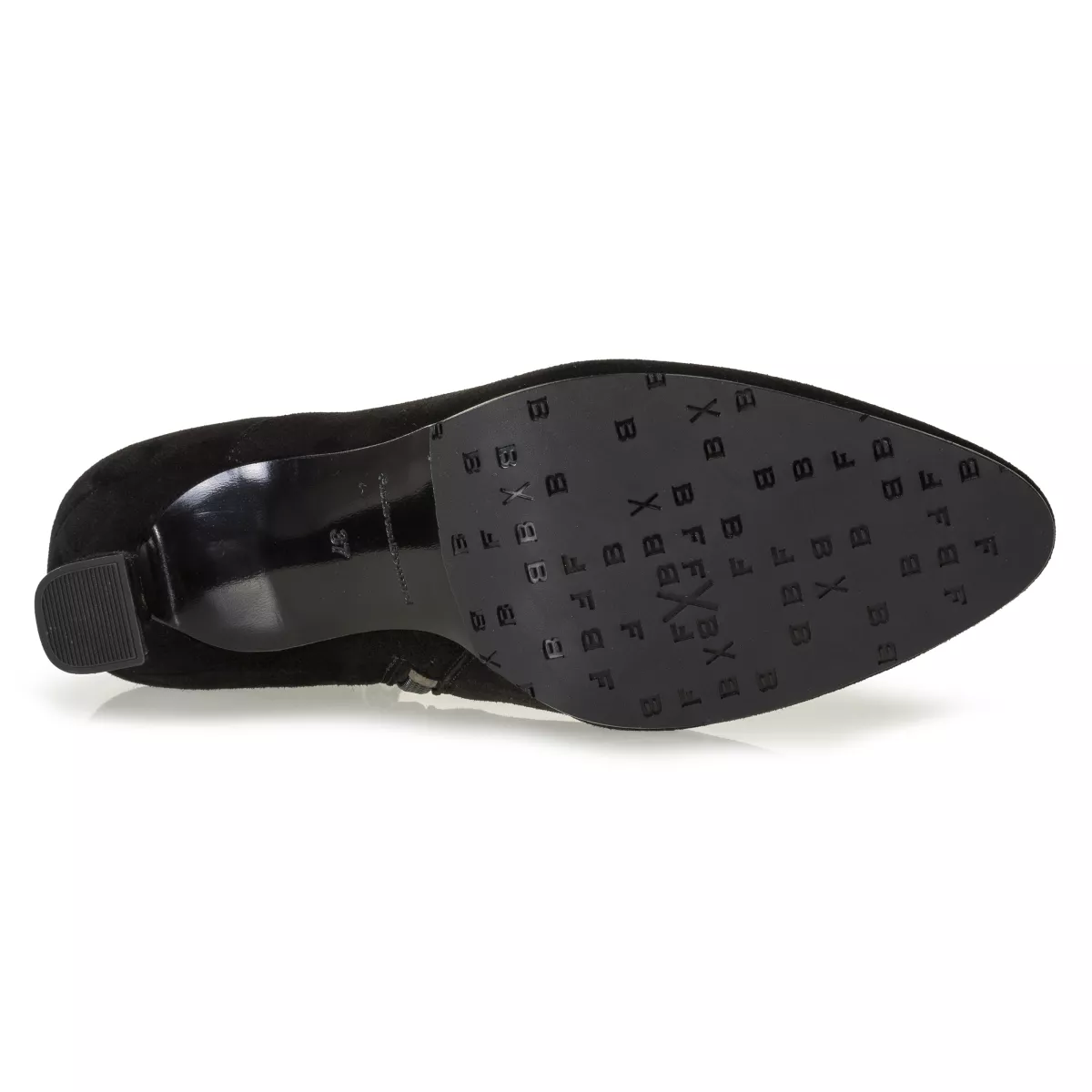 De elegante hak van deze ritsboot is bekleed met hetzelfde materiaal als waarvan de boot zelf is gemaakt. Deze variant is uitgevoerd in zwart suède. Bovenaan de schacht is een metalen stud in het leer geslagen. In de stud is op grafische wijze twee maal de letter F verwerkt. Het loopvlak van de zool is van aangenaam TPU materiaal. De laars is voorzien van een hoogwaardige, kalfslederen voering. Op de binnenzool is onder het lederen inlegzooltje een dun foamlaagje aangebracht voor extra draagcomfort.