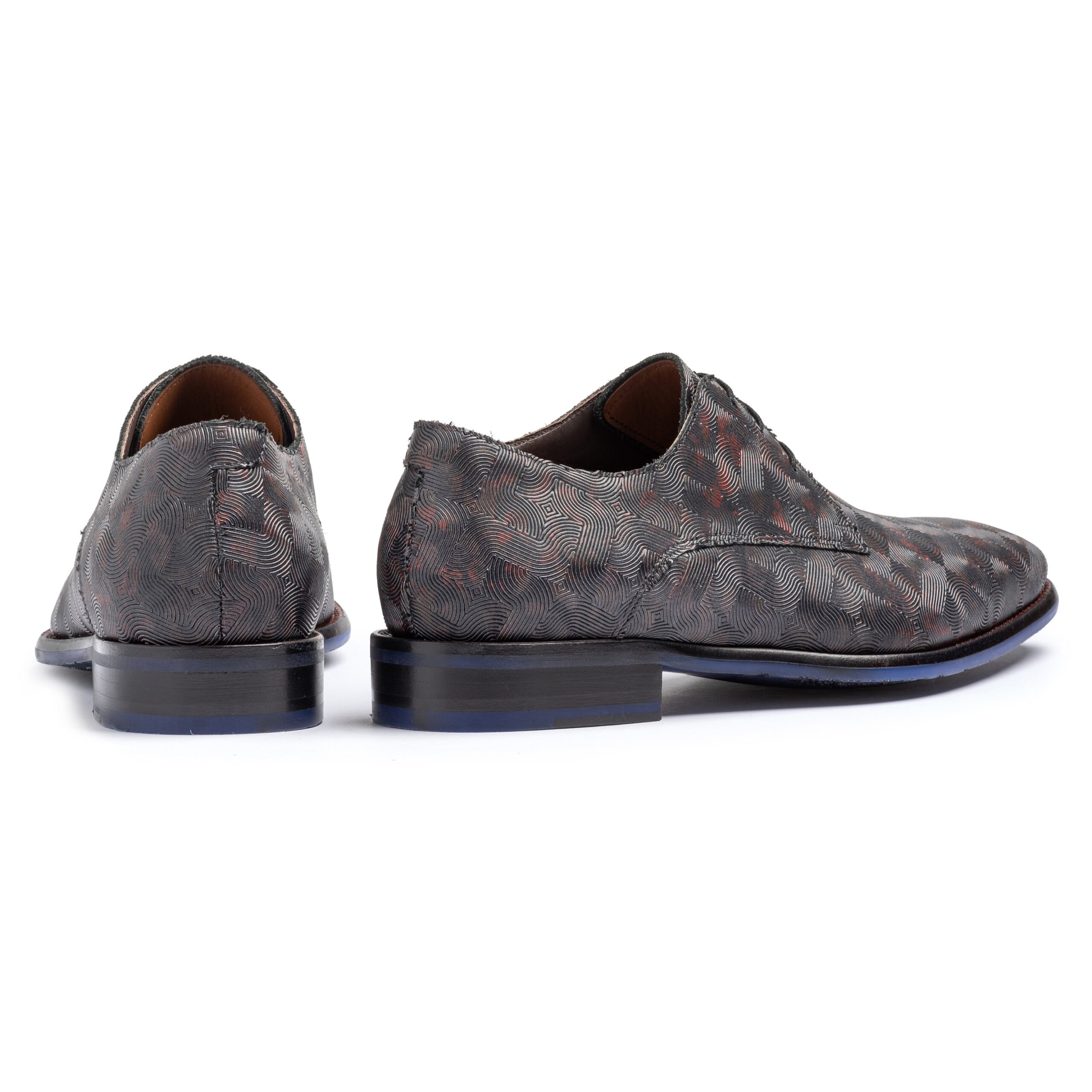Deze schoen valt op door zijn patroon van metallic vlekken. Dit gladblad derby model is uitgevoerd met een slijtvaste TPU loopzool. De hak is middels een zwaluwstaartverbinding opgedeeld in een dempend TPU deel en een luxe lederen deel dat afgewerkt is met 6 koperen spijkertjes. De binnenkant van de schoen is afgewerkt met hoogwaardige kalfslederen voering. De schoen is doorgenaaid volgens de Blake maakwijze.