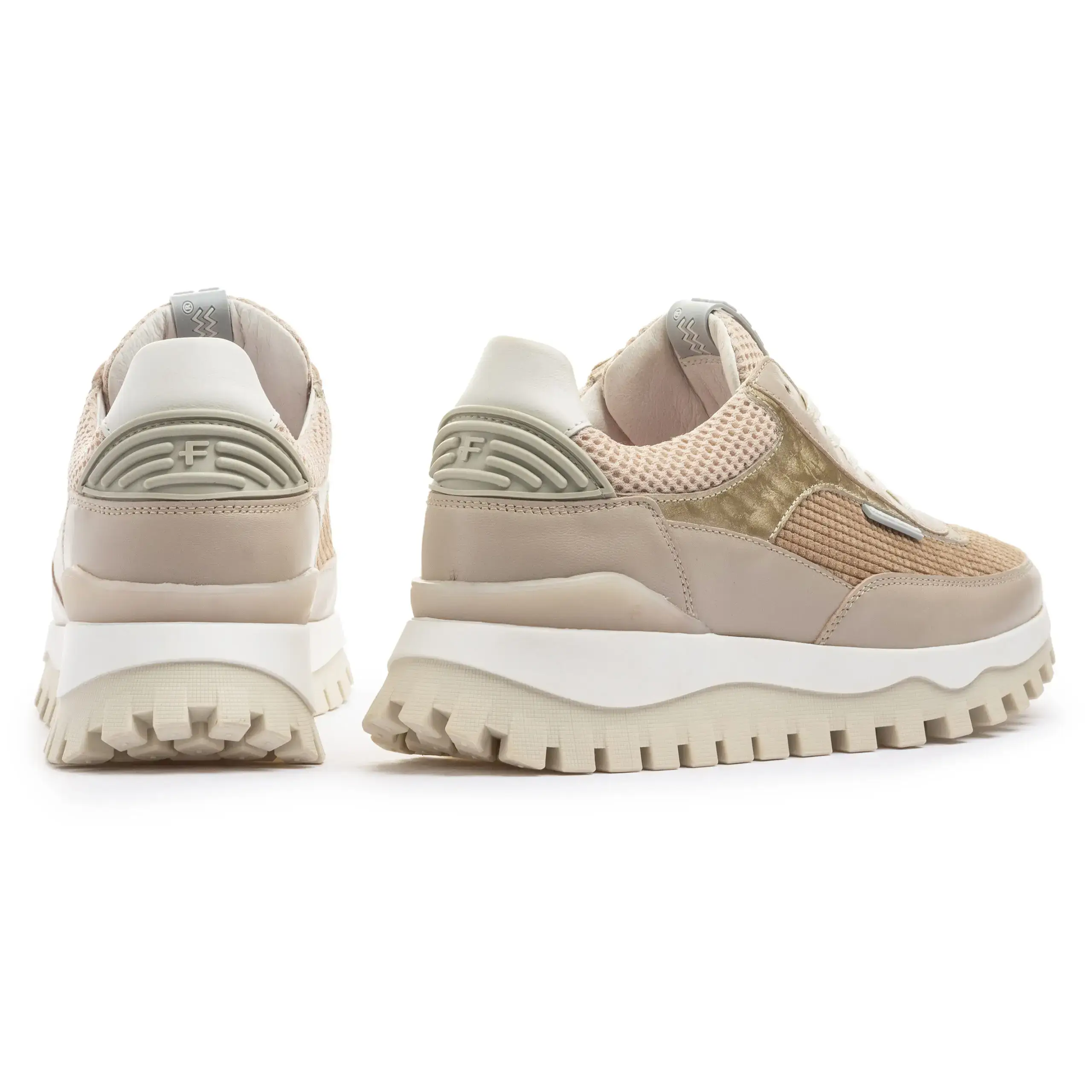 Deze sneaker staat op een sportieve zool met een karakteristiek blokjes patroon in het loopvlak. Op de hiel en tong zijn rubberen inzetten aangebracht met kleine Floris van Bommel logoÂ’s. De sneaker is voorzien van kwalitatief hoogwaardige lederen voering en een comfortabel uitneembaar voetbed. Dit voetbed is eventueel te vervangen voor een eigen voetbed of steunzool. Het bovenwerk is gemaakt van verschillende grijs kleurige materialen.