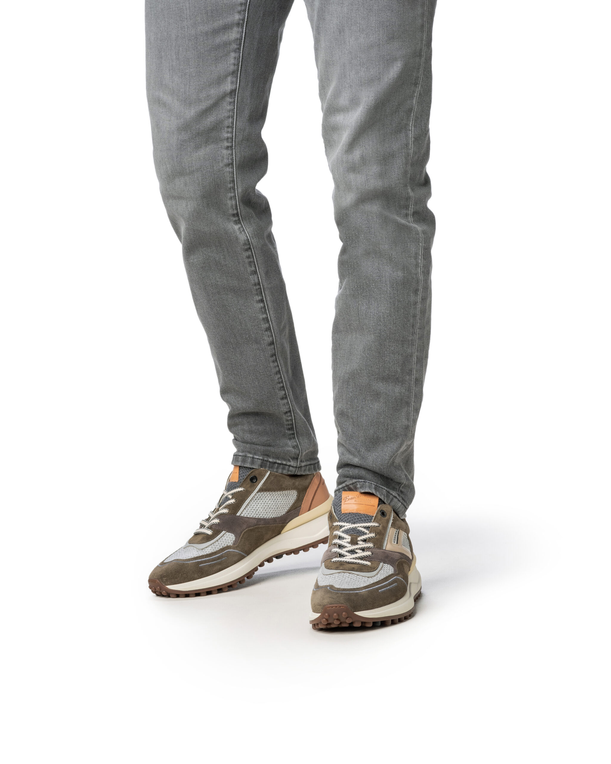 Deze nieuwe uitvoering van onze Noppi sneaker bestaat uit een rijke mix van materialen en kleuren. Verschillende kleuren groen, grijs en bruin smelten samen tot een stijlvol geheel. Op de tong is een sportieve mesh verwerkt. Het off- white deel van de noppenzool is vervaardigd uit lichtgewicht EVA materiaal. Het loopvlak is gemaakt van slijtvast TPU materiaal. De stabilizer achter bij de hiel is voorzien van het Floris van Bommel logo. De binnenkant van de schoen is afgewerkt met een kwalitatief hoogwaardige lederen voering en een uitneembaar voetbed.
