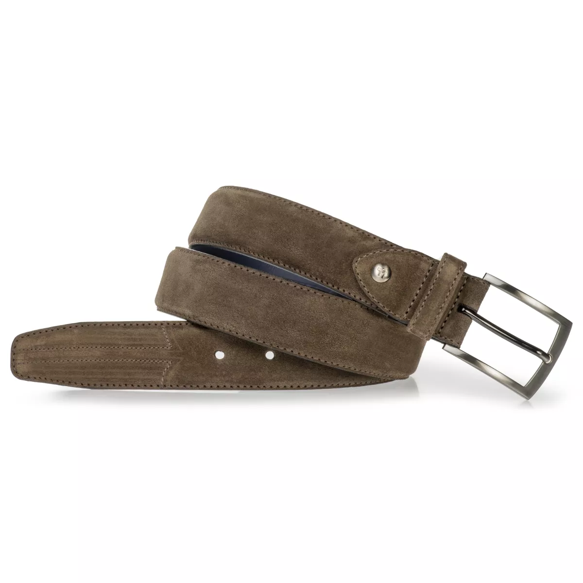 details: het ontwerpen van unieke laserprints is een terugkerend element in de Floris van Bommel collectie. Aan het uiteinde van deze taupekleurige suede riem is een nieuw ontworpen print aangebracht dmv. een speciale techniek. De zichtbare stiksels zorgen voor een casual toevoeging