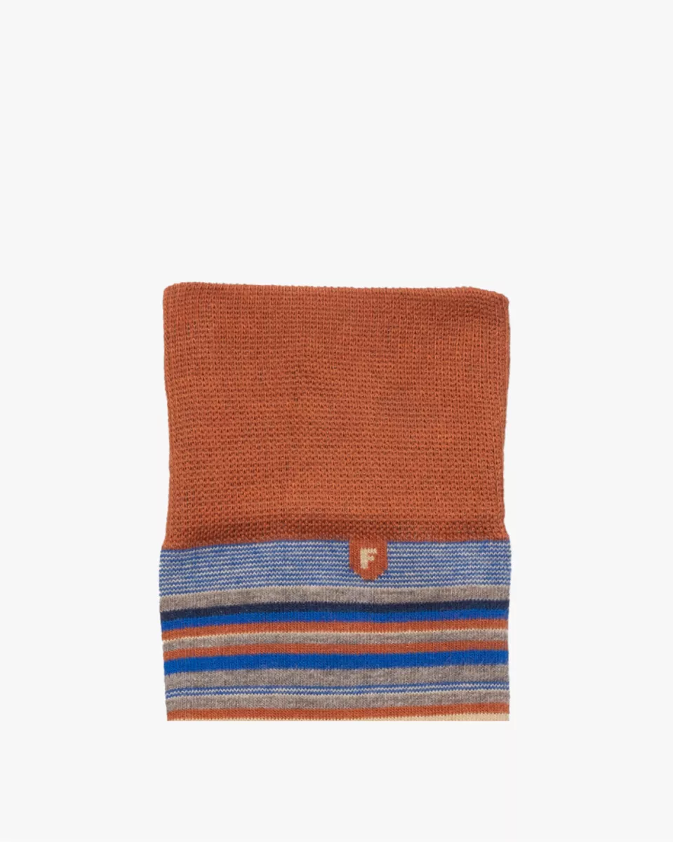Dit is een katoenen sok. De garens van het breisel zijn in de spinnerij gegaseerd. Een gasvlam brandt hierbij alle pluizige vezeltjes weg. Dit geeft de uiteindelijke sok een net wat luxere uitstraling dan een doorsnee sok. Voor het breisel zijn geavanceerde breimachines gebruikt. Waar een doorsnee sok wordt geproduceerd in een ver oord op eenvoudige breimachines met 160 naalden, is deze sok gebreid met 200 naalden. Het resultaat is een luxe sok van hoge kwaliteit. Op elke sok is onder de boord een logootje met de letter F ingebreid. De sokken zijn gemaakt met een flat toe seam en non binding top. Dit betekent dat er bij de tenen geen voelbare naad zit en dat de boord niet knelt rond de kuit.