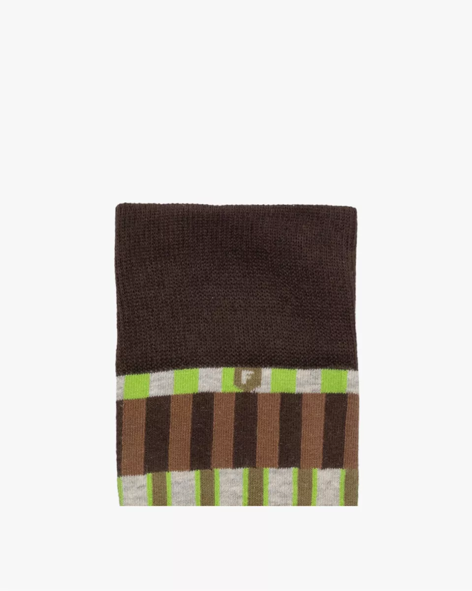 Dit is een katoenen sok. De garens van het breisel zijn in de spinnerij gegaseerd. Een gasvlam brandt hierbij alle pluizige vezeltjes weg. Dit geeft de uiteindelijke sok een net wat luxere uitstraling dan een doorsnee sok. Voor het breisel zijn geavanceerde breimachines gebruikt. Waar een doorsnee sok wordt geproduceerd in een ver oord op eenvoudige breimachines met 160 naalden, is deze sok gebreid met 200 naalden. Het resultaat is een luxe sok van hoge kwaliteit. Op elke sok is onder de boord een logootje met de letter F ingebreid. De sokken zijn gemaakt met een flat toe seam en non binding top. Dit betekent dat er bij de tenen geen voelbare naad zit en dat de boord niet knelt rond de kuit.