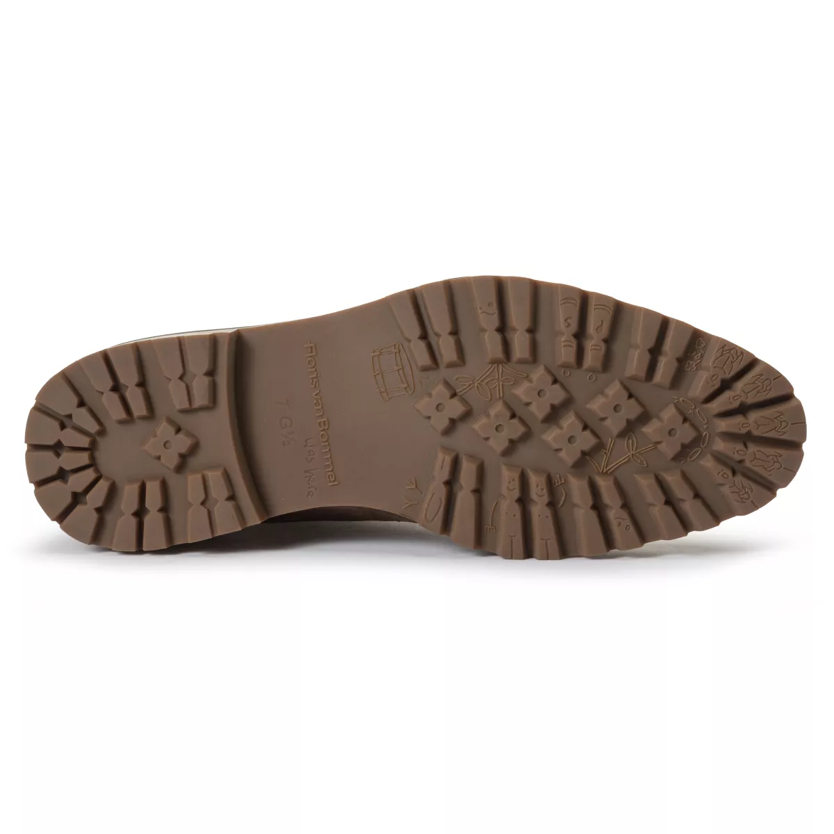 Deze tijdloze winterse derbyboot is uitgevoerd in licht geolied taupe suède. De profielzool is gemaakt van soepel rubber en is zowel binnen als buiten praktisch in het gebruik. De slanke ronde leest oogt jong klasiek aan de voet. Het interieur van de boot is uitgevoerd in kwalitatief hoogwaardig kalfsleer. Floris heeft op een druilerige middag het klassieke comando profiel van de loopzool voorzien van kleine doodles en schetsjes die als reliëf op het rubber aangebracht zijn.