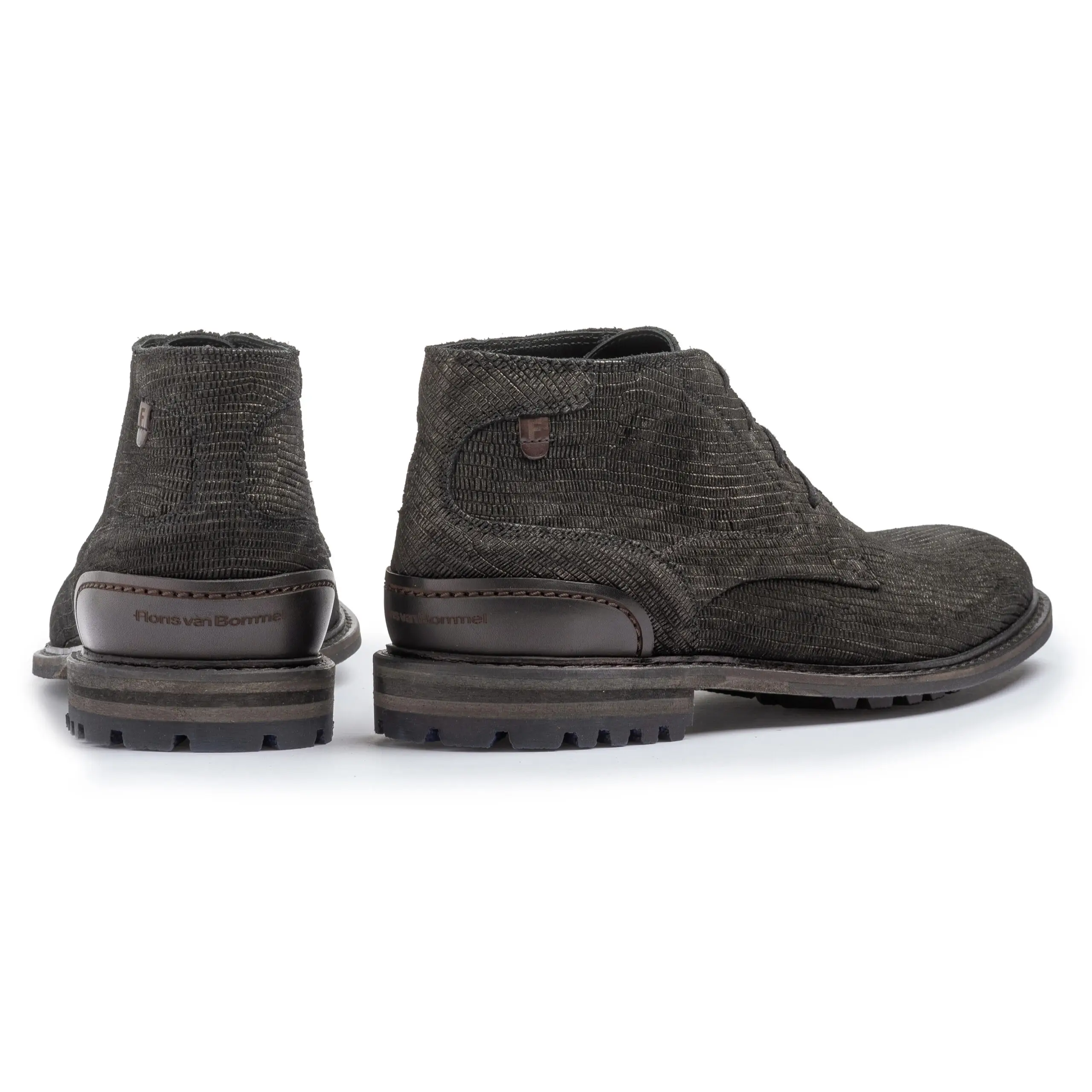 Deze allround casual boot is netjes en sportief tegelijkertijd. De leest oogt slank maar biedt met zijn H-wijdte ruimte aan een volle voet. Het leer van de zoolrand en hak heeft een matte finish. Het loopvlak is voorzien van een stevig commando profiel dat bij de voorvoet wat terugvalt onder de schoen. Achter op de boot is een hielcup aangebracht van stevig plantaardig gelooid kuipleer. Op de cup is met laser het Floris van Bommel logo aangebacht. Het interieur van de boot is afgewerkt met een voering van hoogwaardig kalfsleer. Deze variant is uitgevoerd in zwart leer met nubuck print.