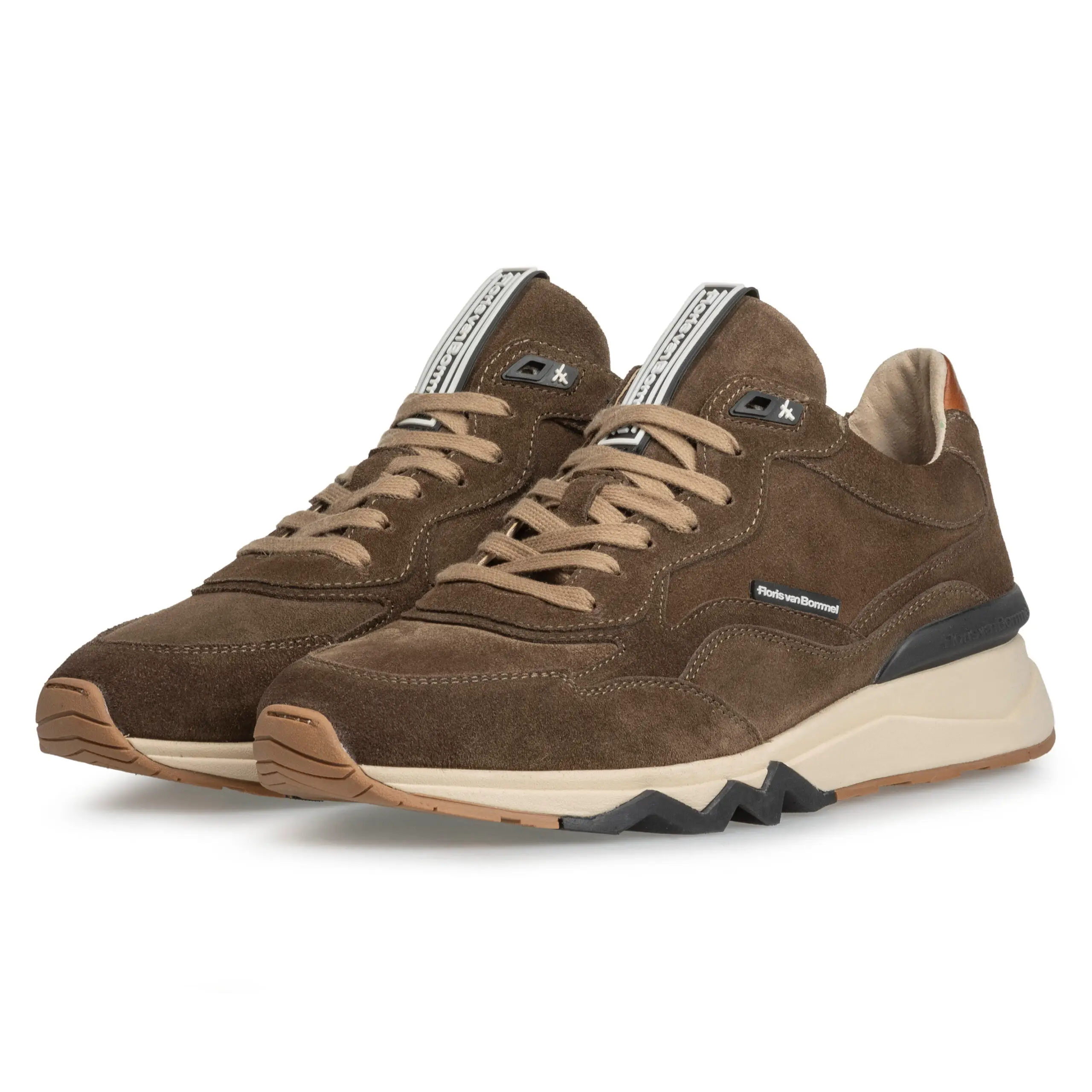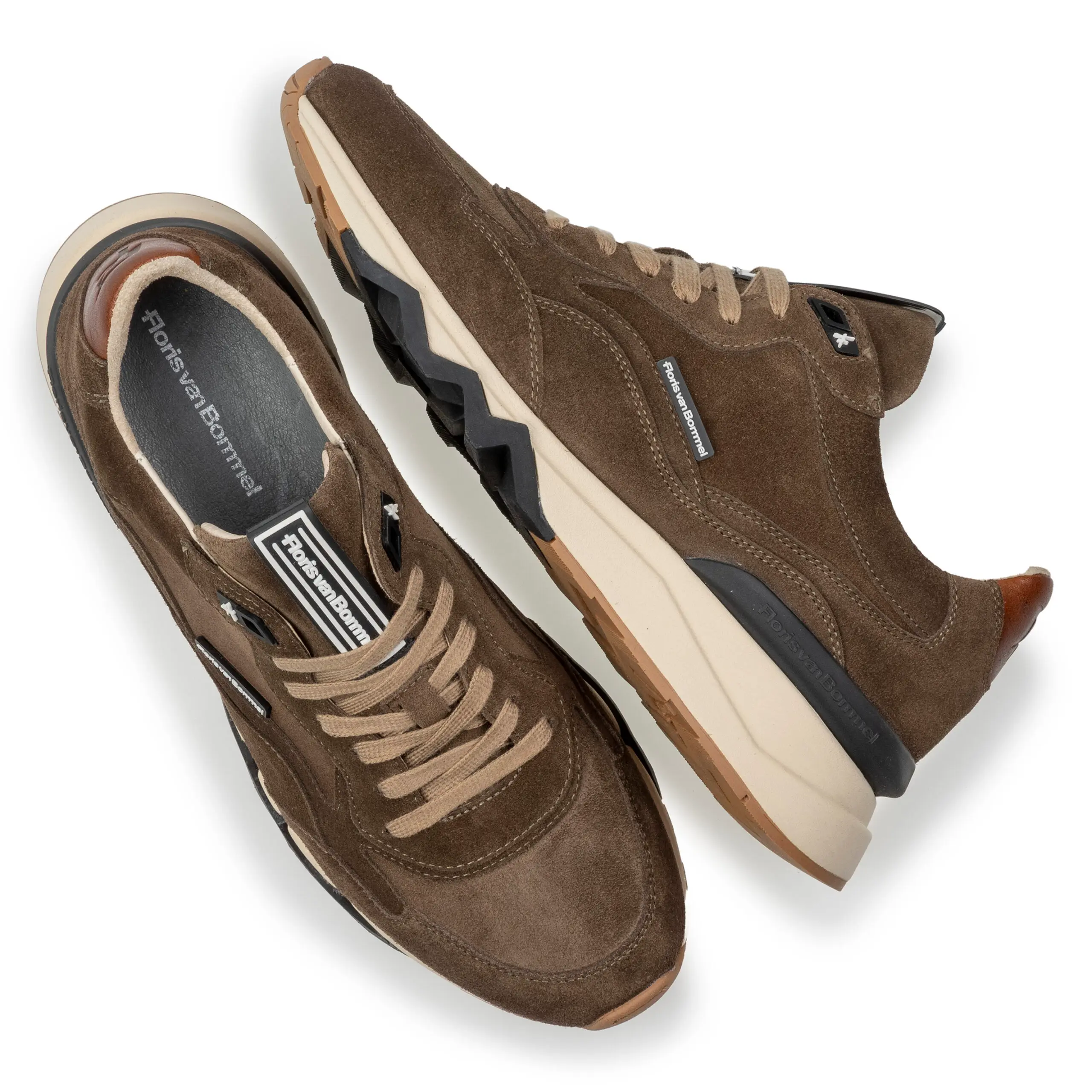 flink volume en krijgt mooi snelheid door richting de voorvoet laag weg te duiken. De zool is gemaakt van cremekleurig, extreem licht, Phylon materiaal. Het loopvlak is van slijtvast TPU. Het loopvlak is voorzien van een typische Floris van Bommel zigzaglijn. De binnenkant van de sneaker is afgewerkt met hoogwaardige lederen voering en een uitneembaar voetbed. Het ontwerp is rijk uitgewerkt met o.a. een custom vetertunnel, zwarte stabilizer met Floris van Bommel logo, een zwart rubberen tonglabel met logo en een cognac lederen hielstuk. Deze variant is uitgevoerd in stijlvol uni midbruin suède. Artikelnummer SFM-10136-34-01 Kleur Taupe / middenbruin Materiaal Suède Voering Kalfsleer Zooltype Beige rubberen loopzool Leest & wijdte 781 G½ Maakwijze AGO Uitneembaar voetbed Ja