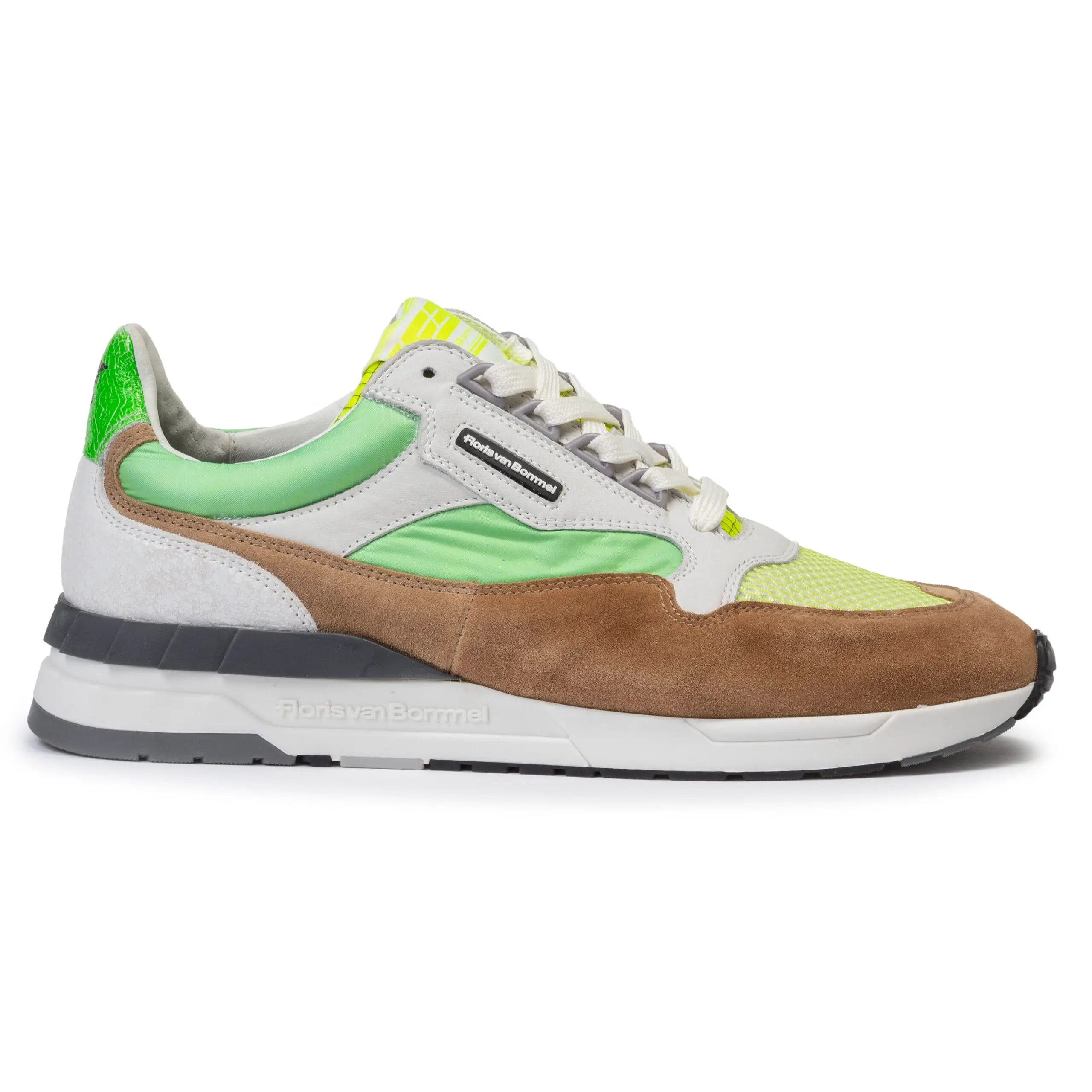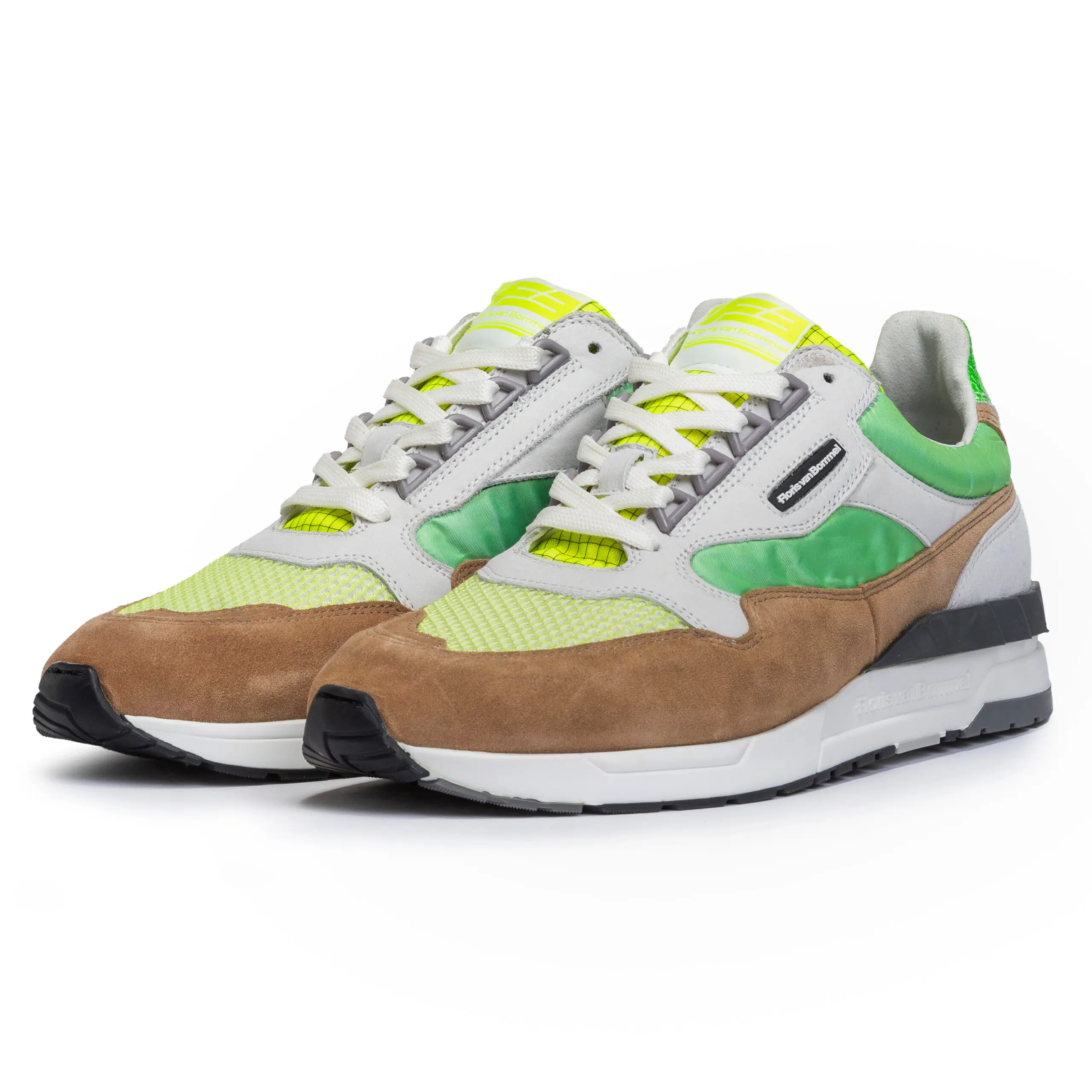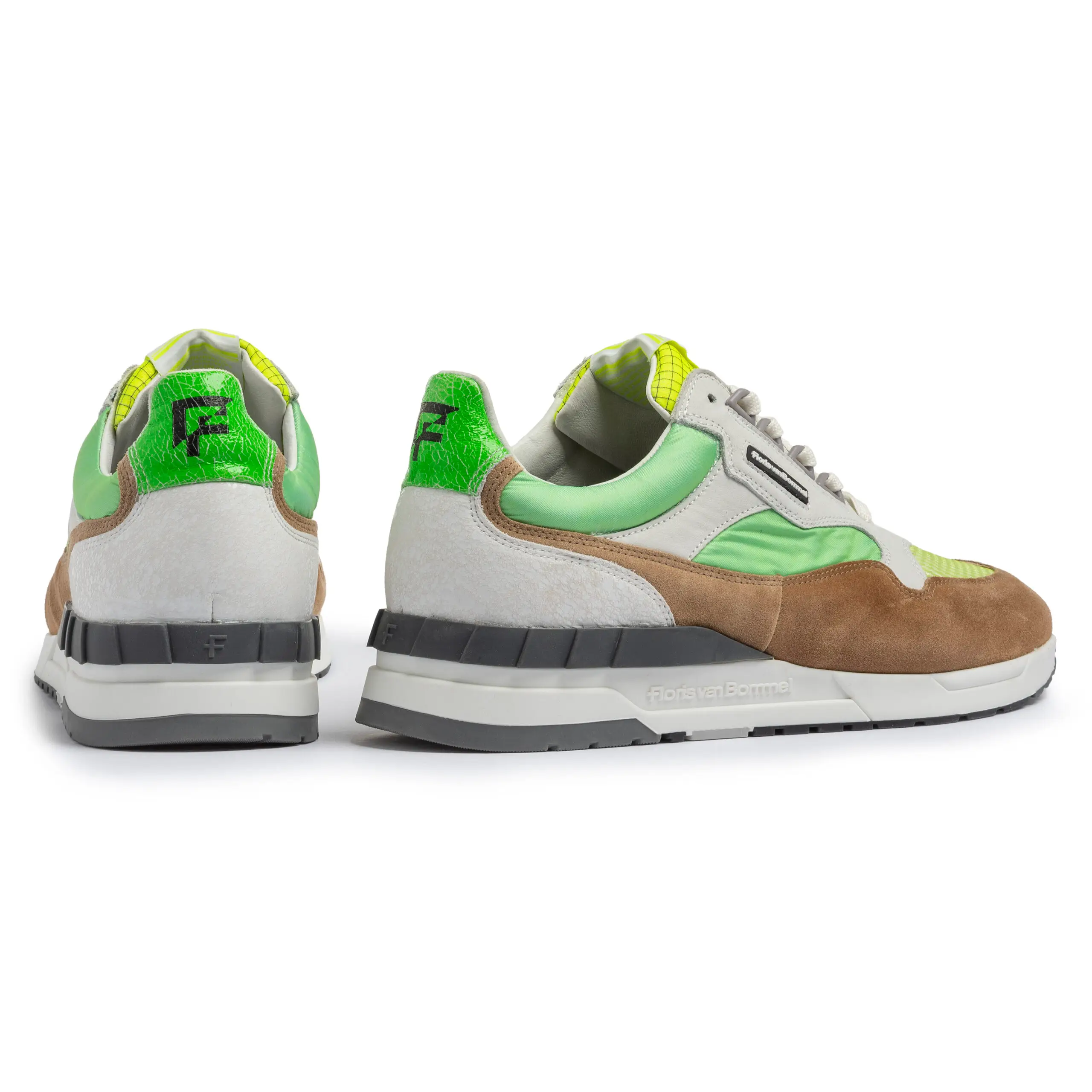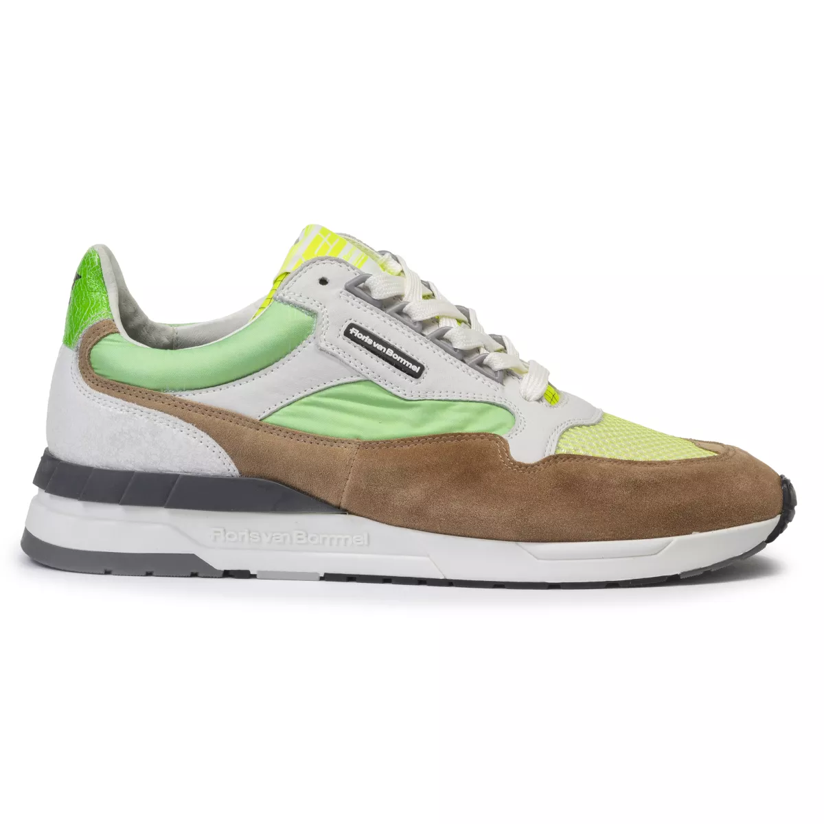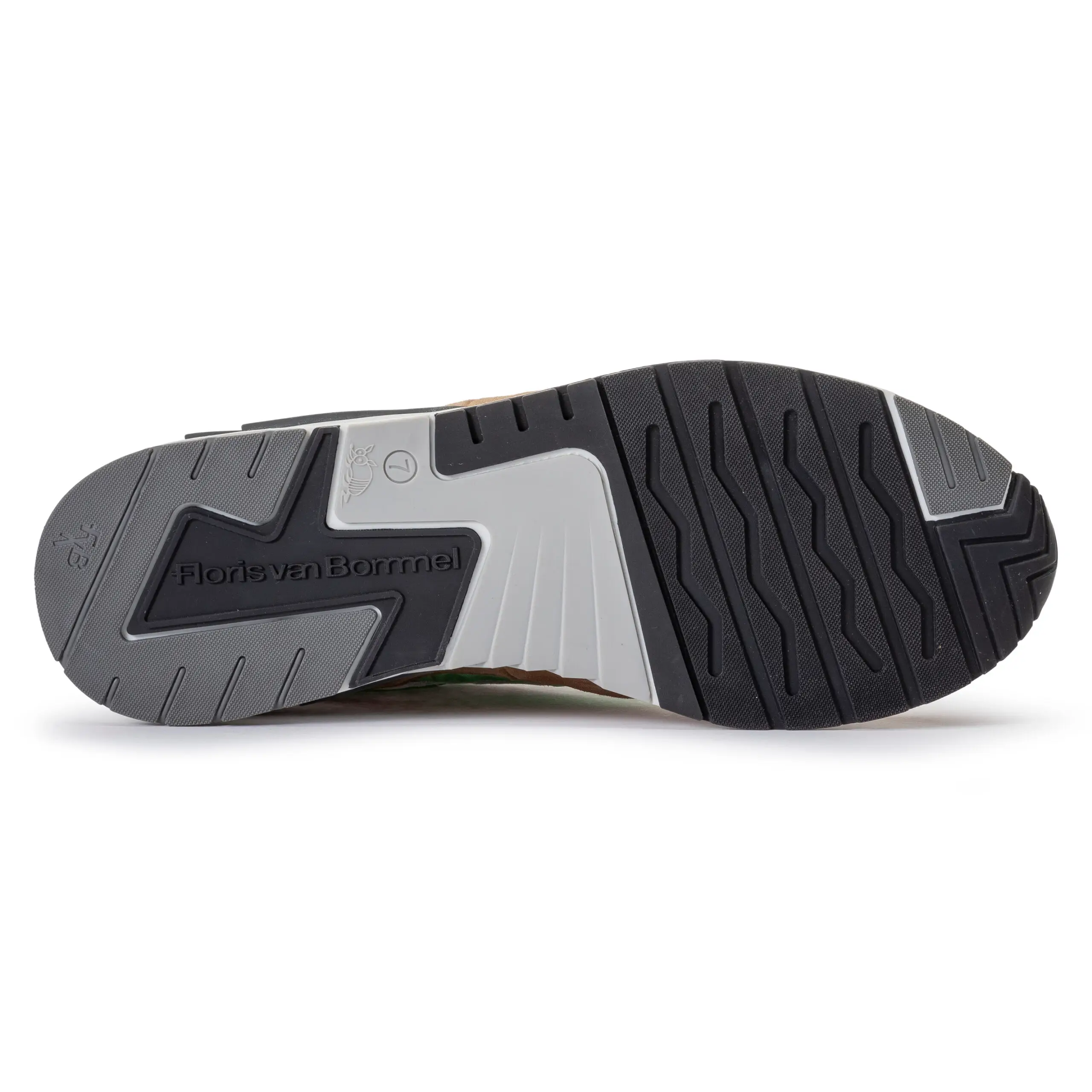 De zool van deze sneaker uit de De Runner lijn is geïnspireerd op sportschoenen uit de jaren ’80. De zool is gemaakt van soepel TR met een slijtvast loopvlak. De stabilizer bij de hak draagt bij aan de sportieve uitstraling van de schoen en zorgt tegelijkertijd voor een comfortabele ondersteuning van de hiel. De binnenkant van de sneaker is afgewerkt met lederen voering en een uitneembaar voetbed dat eventueel te vervangen is voor een eigen voetbed of steunzool. Deze schoen heeft Floris van Bommel logos op de zijkant van de zool, op het rubberen vetertunneltje, het hielstuk en het tonglabel.