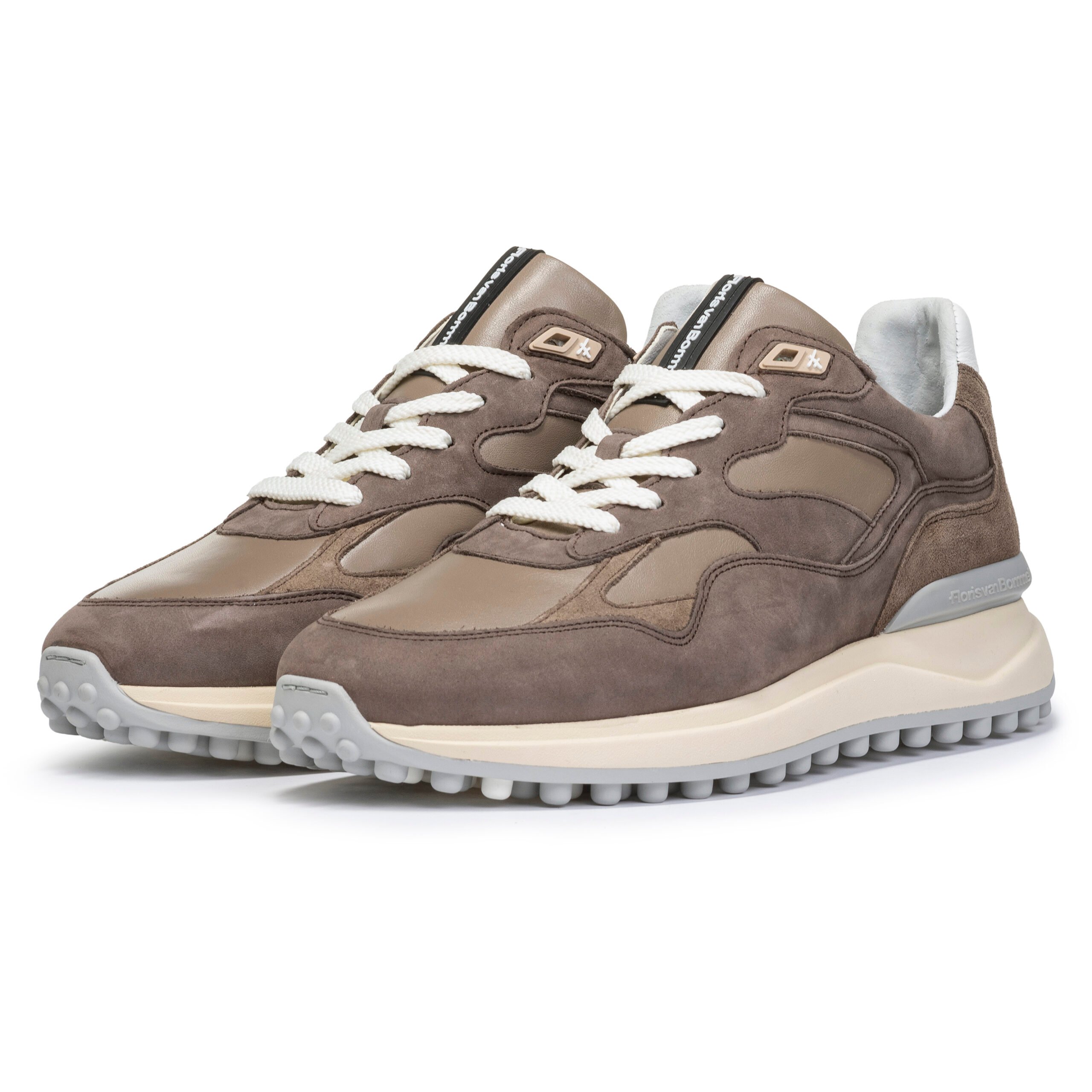 Deze nieuwe uitvoering van onze Noppi sneaker bestaat uit een rijke mix van materialen en kleuren. Verschillende tinten taupe smelten samen tot een stijlvol geheel. Het off-white deel van de noppenzool is vervaardigd uit lichtgewicht EVA materiaal. Het loopvlak is gemaakt van slijtvast TPU materiaal. De stabilizer achter bij de hiel is voorzien van het Floris van Bommel logo. De binnenkant van de schoen is afgewerkt met kwalitatief hoogwaardige lederen voering en een uitneembaar voetbed.