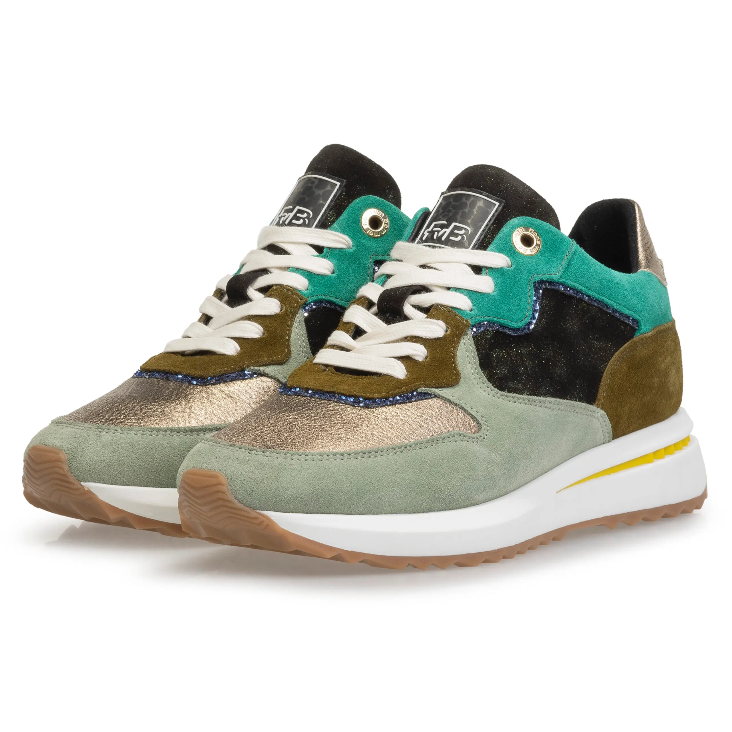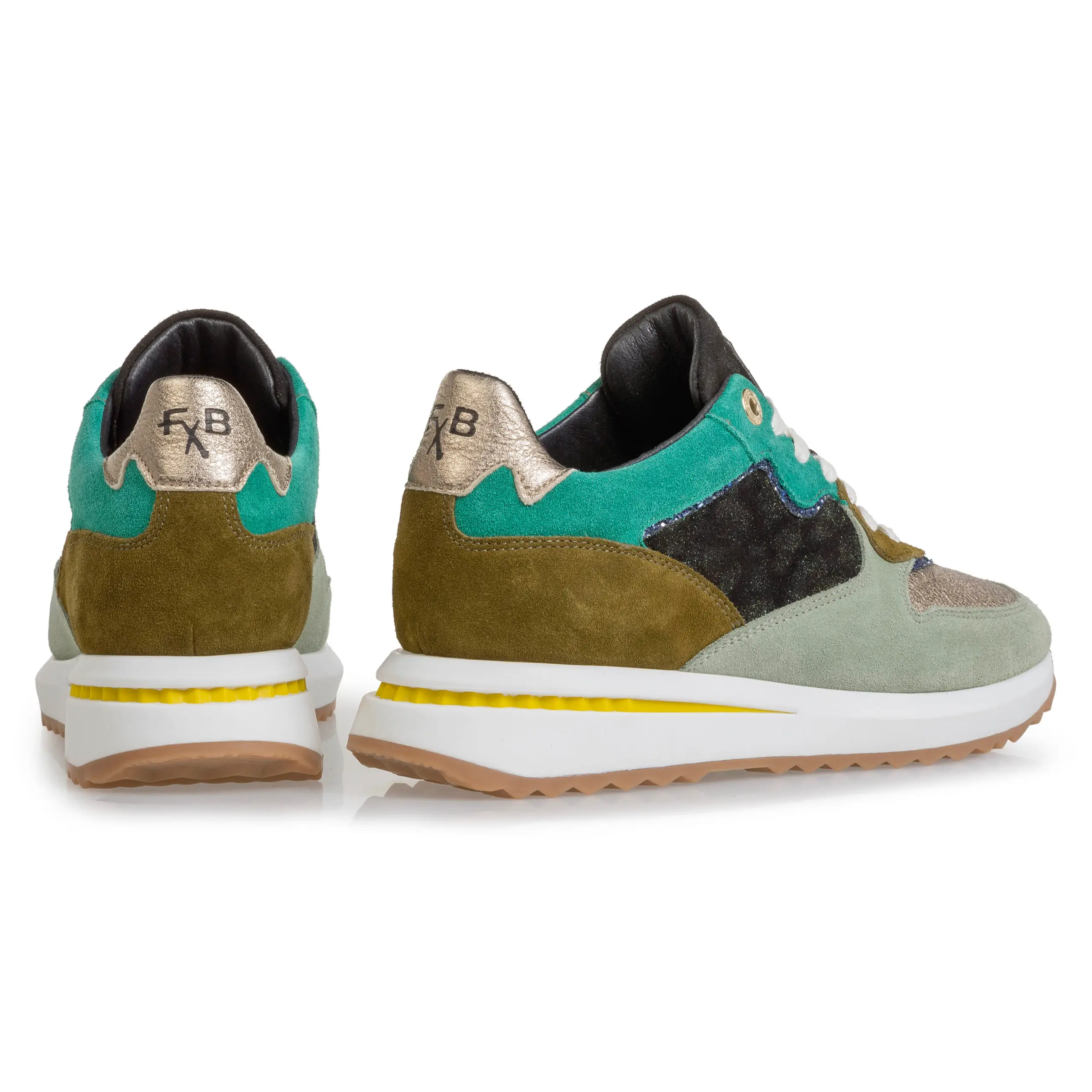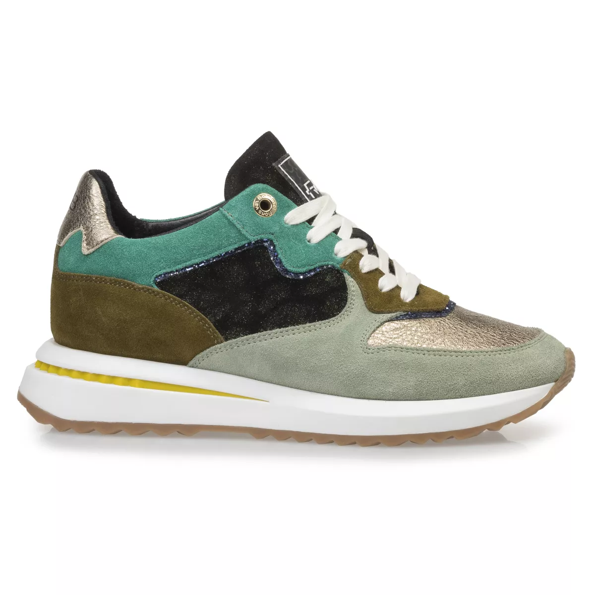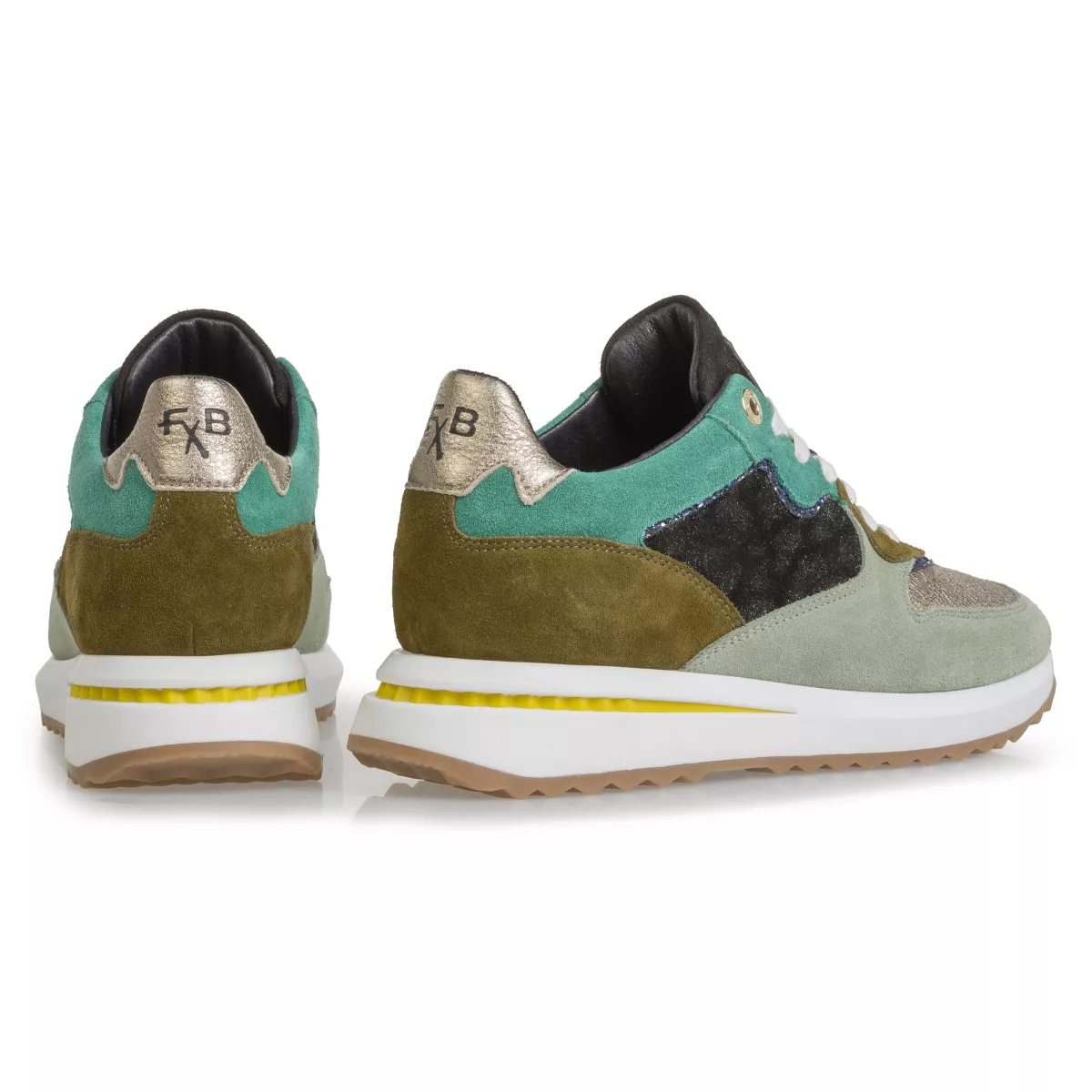 Deze sportieve Sumi sneaker is voorzien van een lichtgewicht zool met slijtvast TPU loopvlak. De uitsnede bij hiel maakt de zool lekker nonchalant. Op het tonglabel staat het logo van FvB. De binnenkant van de schoen is bekleed met hoogwaardige lederen voering en voorzien van een uitneembaar voetbed. Het bovenwerk is uitgevoerd in een combinatie van groene materialen. Suède wordt gecombineerd met gladleer.