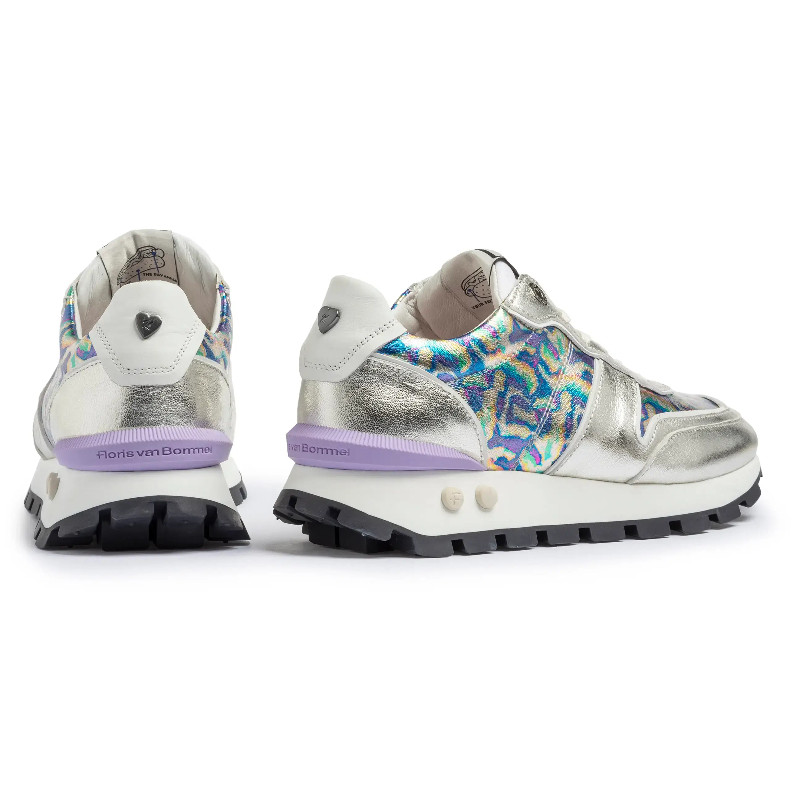 Deze sportieve runner is uitgevoerd met een markante zool. Het loopvlak bestaat uit stevige blokjes die goed zichtbaar zijn vanaf de zijkant. Op de zijkant van de zool zijn 2 ronde plugs aangebracht en bij de hiel is een robuuste stabilizer op de zool gemonteerd. Op de lekkere zachte tong is een label gestikt met op de voorkant een FvB logo en op de achterkant een levensinzicht van Floris (hij gebruikt een afbeelding van een broodje worst als metafoor om tot de kern van het leven door te dringen…). In zijn totaliteit is dit een lekkere vlotte trendy sneaker waar je uren aan een stuk op kunt lopen. Deze variant is uitgevoerd in zilver leer met metallic print leer, afgewerkt met zwarte loopzool. Maak je outfit compleet met de bijpassende riem van Floris van Bommel.