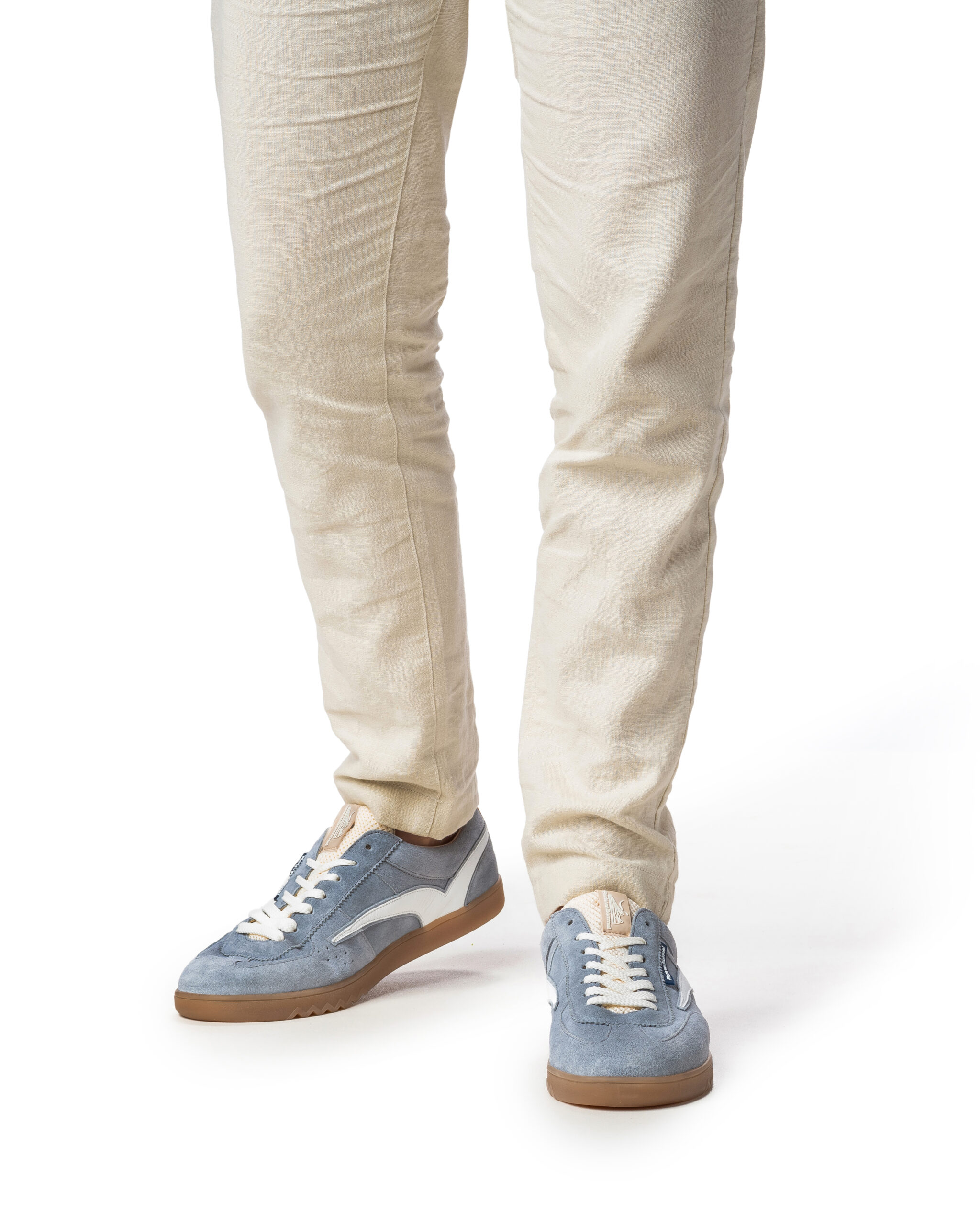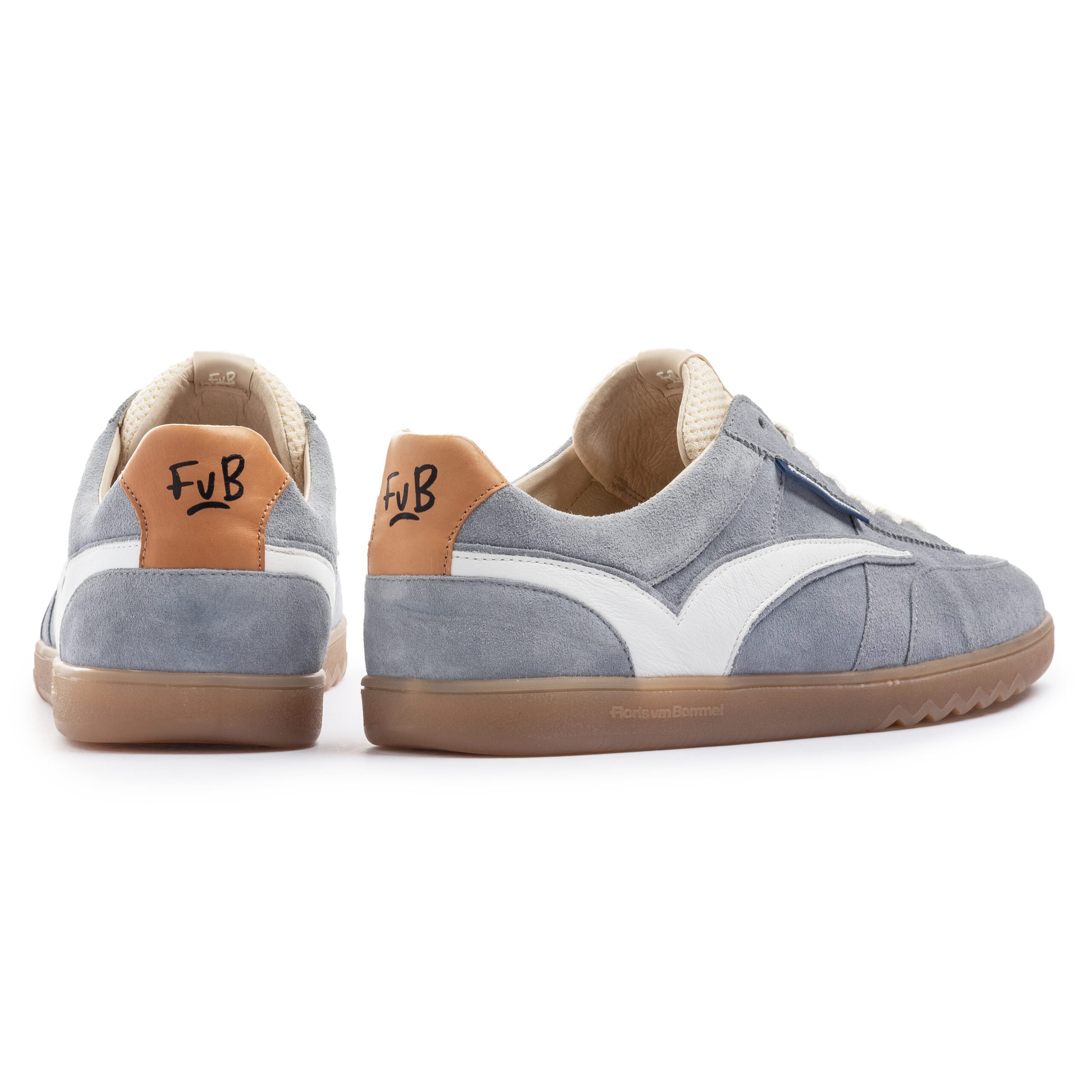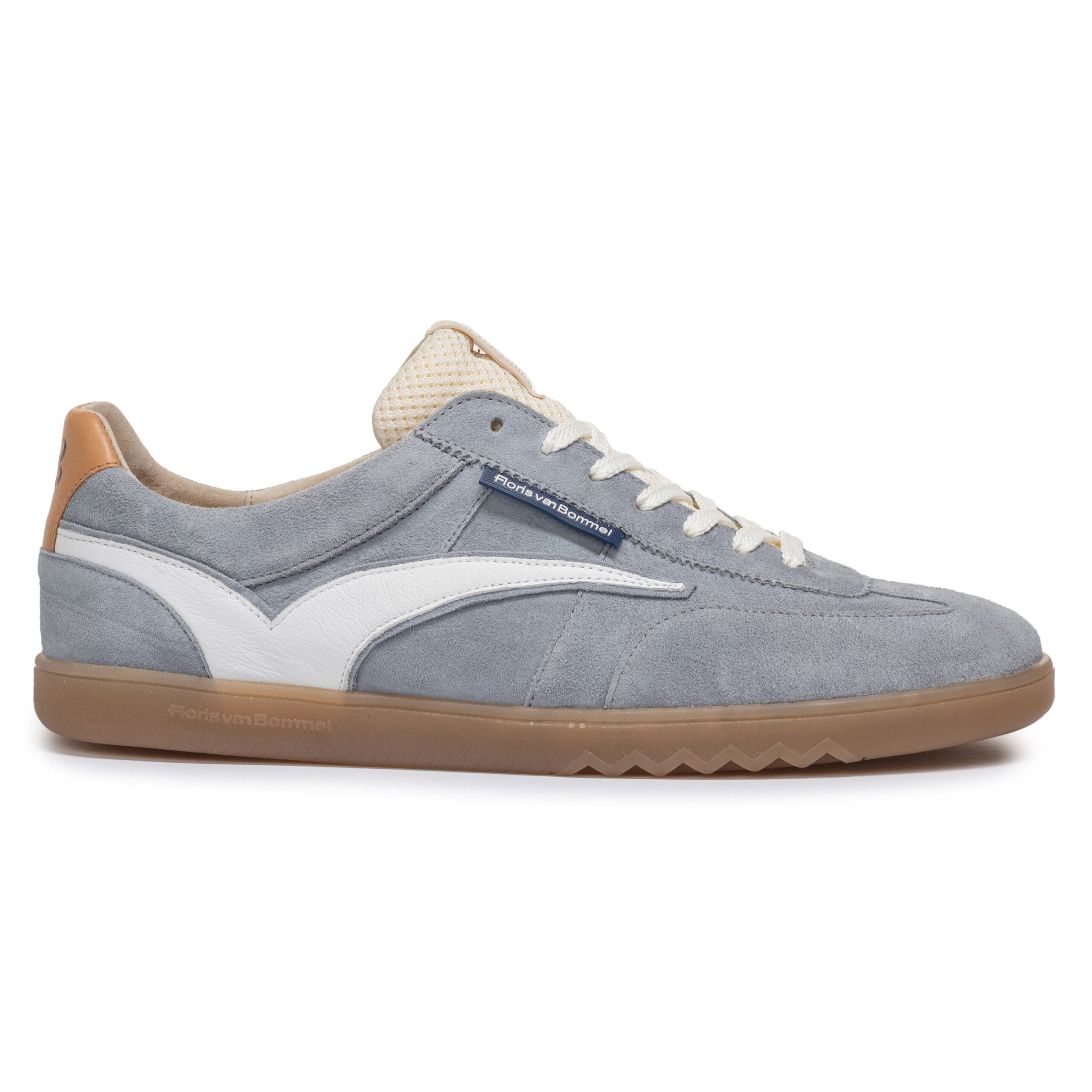 Deze De Zaler-sneaker is geïnspireerd op vintage indoorsportschoenen. De zijkant is gedecoreerd met een retro Floris van Bommel-sportbelijning. Vanwege de inspiratie uit het verleden is de kuipzool ook passend basic gehouden. Om de zool toch naar het heden te brengen, is onder de voorvoet een kenmerkende Floris van Bommel-zigzaglijn aangebracht. Op de tong, zijkant en hiel zijn Floris van Bommel-logos aangebracht. De binnenkant van de schoen is voorzien van een luxe leren voering en een uitneembaar voetbed, dat kan worden vervangen door een persoonlijk voetbed of steunzool. Deze sneaker is uitgevoerd in lichtblauw suède, afgewerkt met een contrasterende witte sportbelijning op de zijkant.