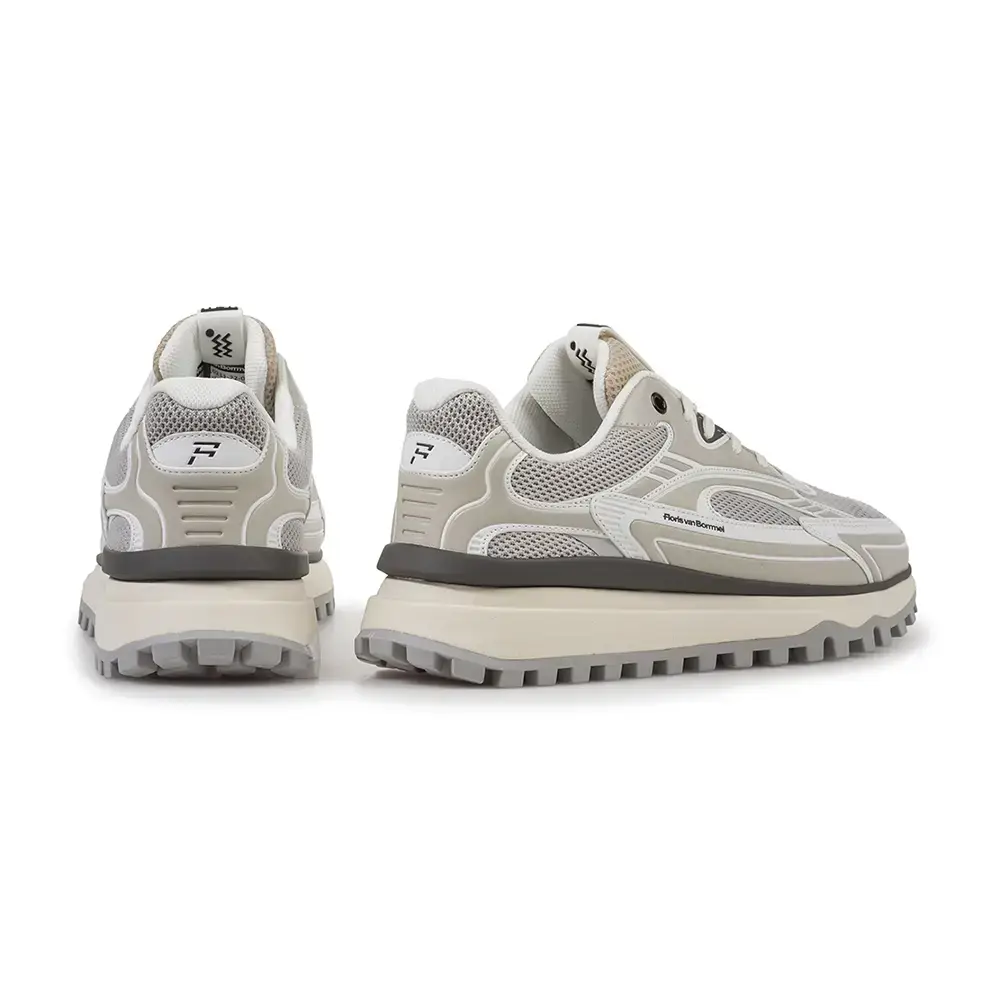 Dit is De Gripper, een sneaker op een robuuste runnerzool met bij de hiel een langgerekte stabilizer. De sneaker is uitgevoerd in een technische materiaalmix van high frequency panelen van polyurethaan en verschillende types mesh. De mesh heeft als detaillering op enkele plaatsen reflecterende heatseals. De voering is gemaakt van sportief, kwalitatief hoogwaardig mesh materiaal. Het voetbed is volledig uitneembaar en kan, indien gewenst, vervangen worden door een eigen inlegzool of steunzool. Met een leest in wijdte G1/2 biedt deze sneaker een comfortabele en ruime pasvorm. Op tong is een rubberen label aangebracht met het Floris van Bommel logo.