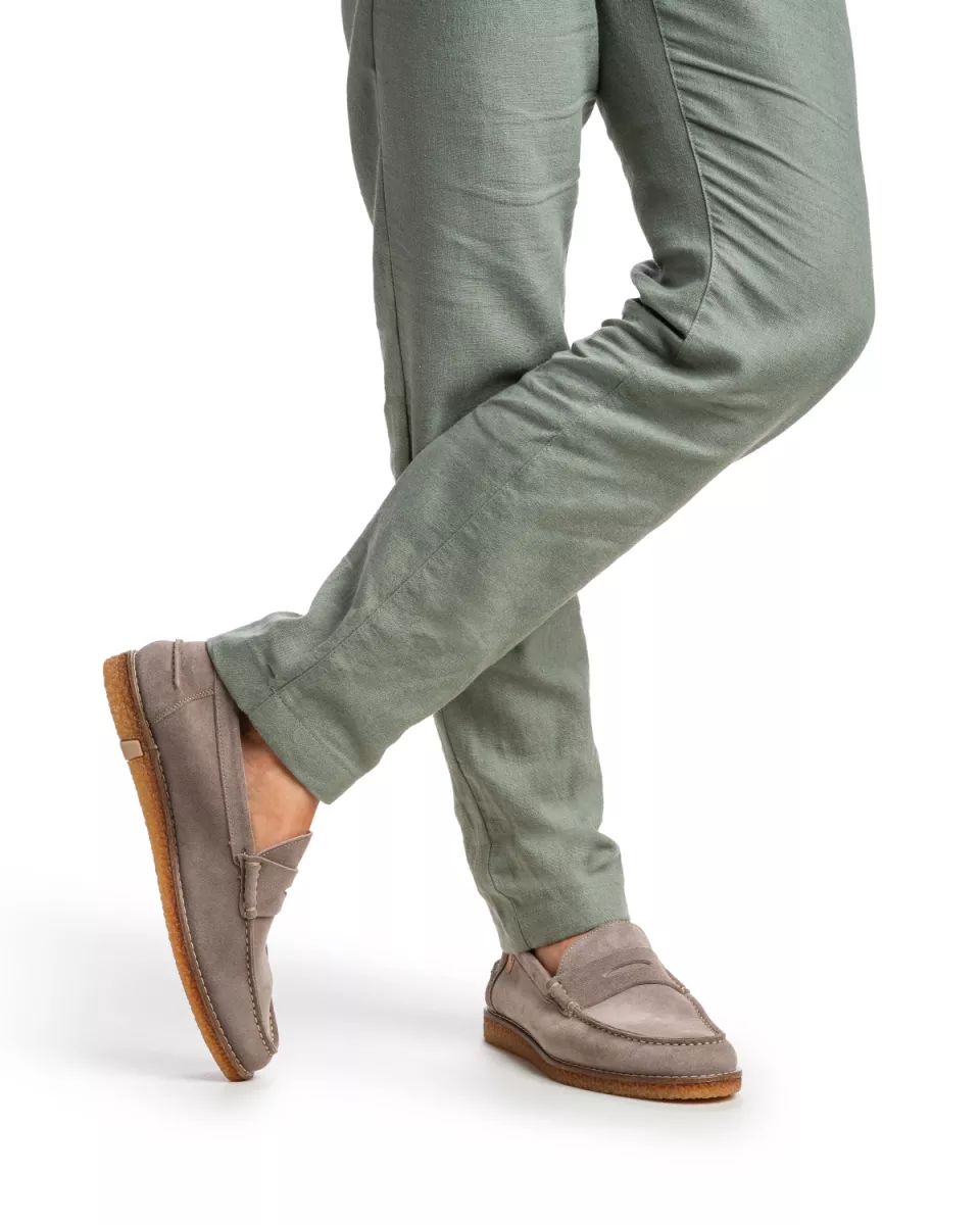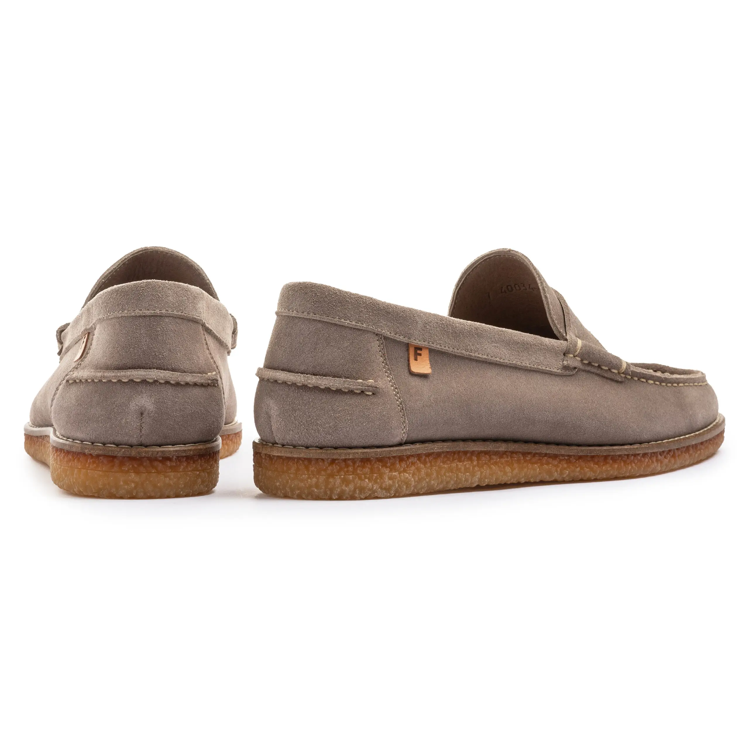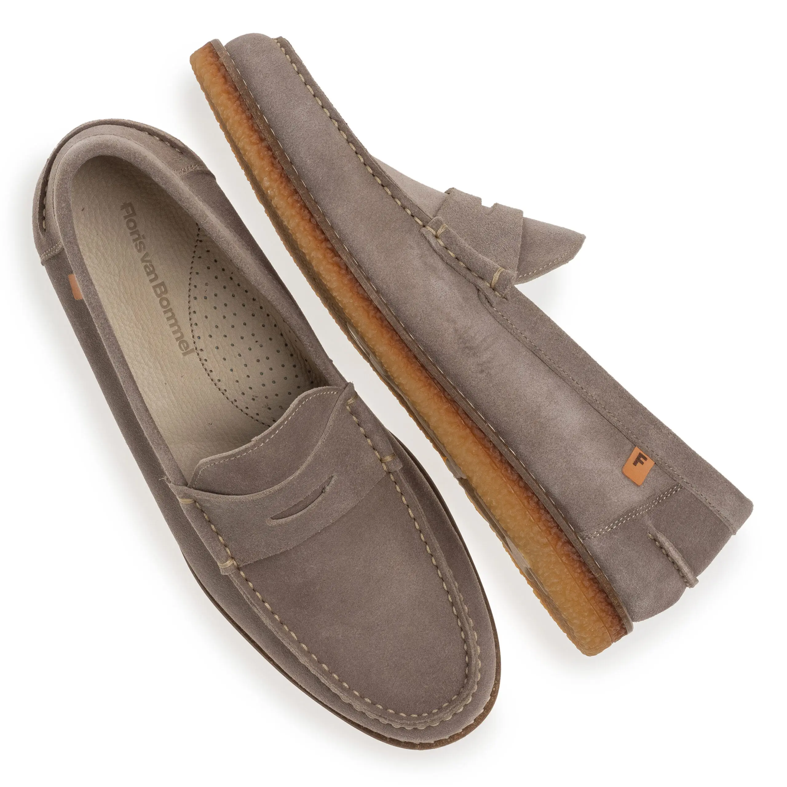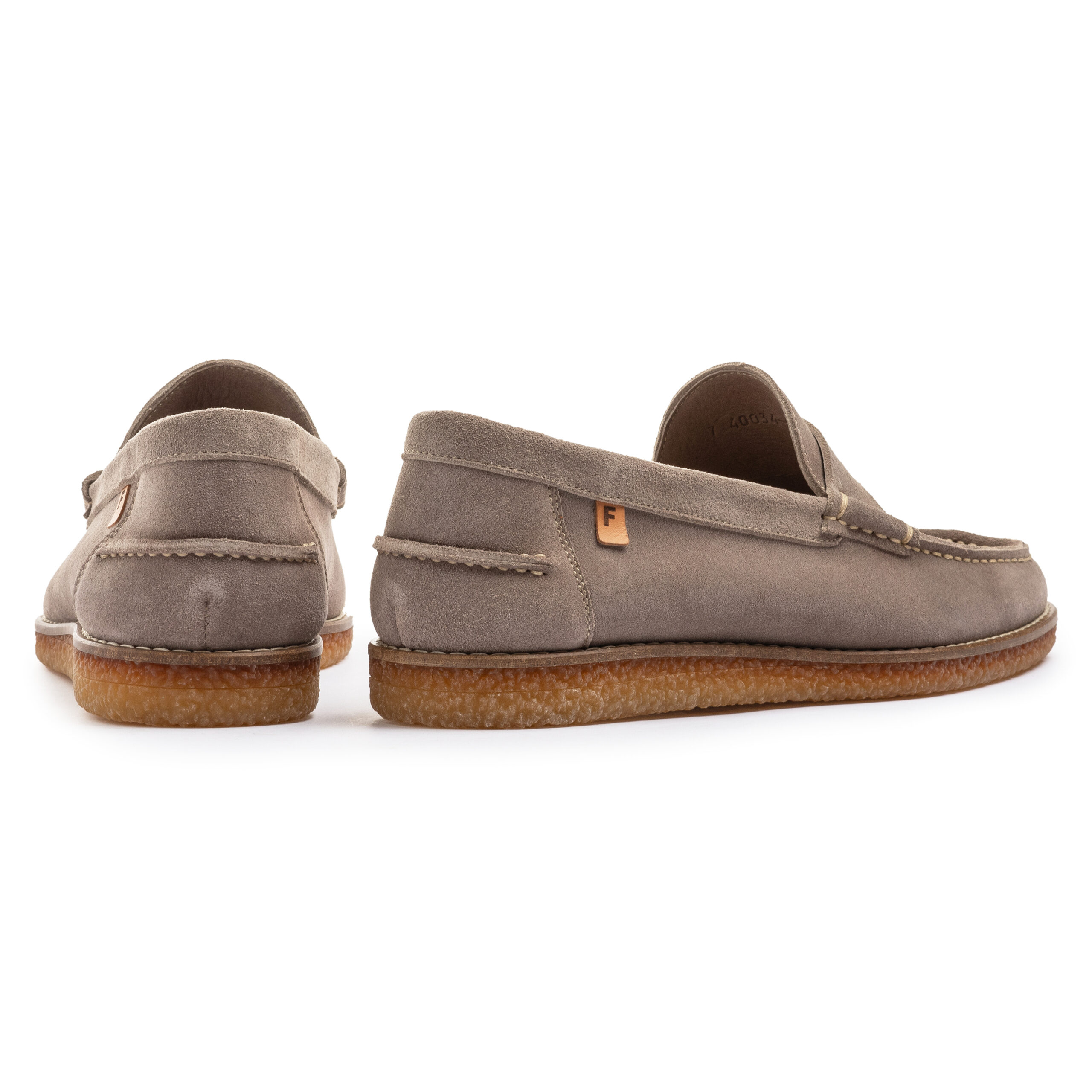 Deze De Krepper-loafer is gemaakt met een zool van TR-materiaal die de uitstraling heeft van een crêpezool. De zool is rijk afgewerkt met een lederen zoolrand en een groot Floris van Bommel-logo in het loopvlak. Op de zijkant is een lichtcognackleurig lederen labeltje gestikt met daarop een logo gelaserd in de vorm van de letter F. Deze instapper is ontworpen zonder voering; in plaats daarvan is er gekozen voor dik, hoogwaardig suède. Qua stevigheid doet deze voeringloze loafer niet onder voor een schoen met voering, maar de look is verfijnder. Het bruine bovenwerk sluit elegant aan, voelt extra soepel aan en heeft een zomerse, natuurlijke uitstraling. De schoen heeft een lederen binnenzool en een niet-uitneembaar voetbed.