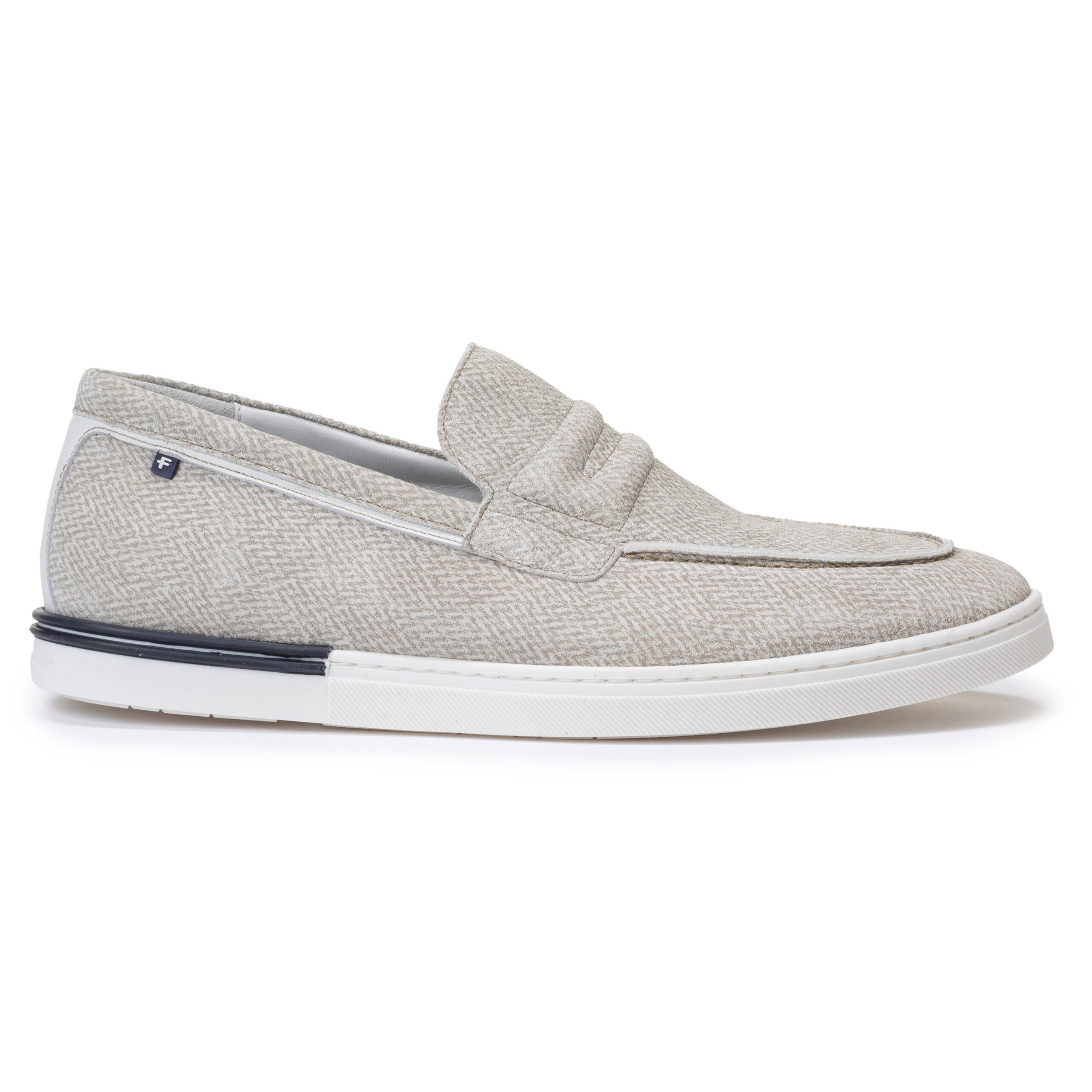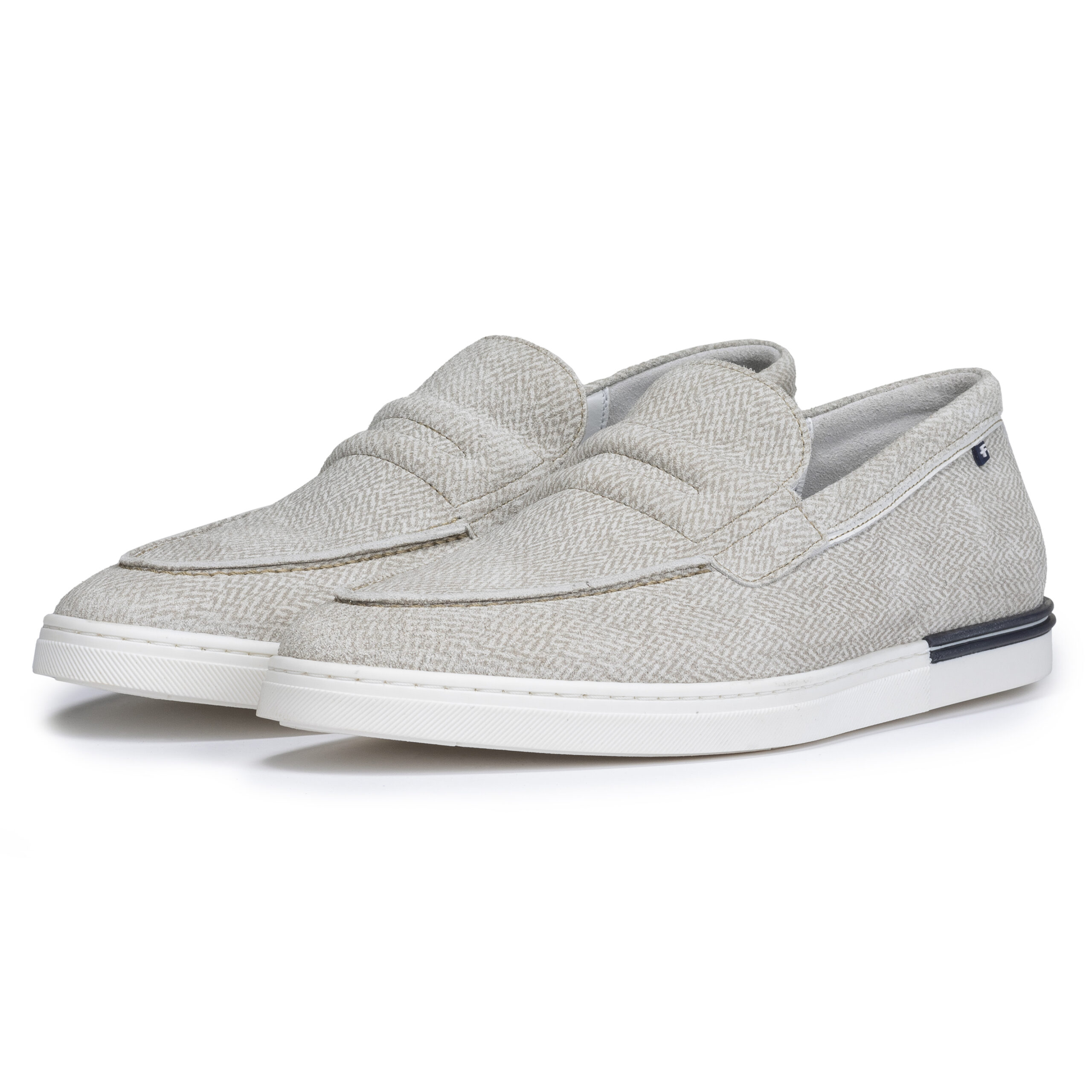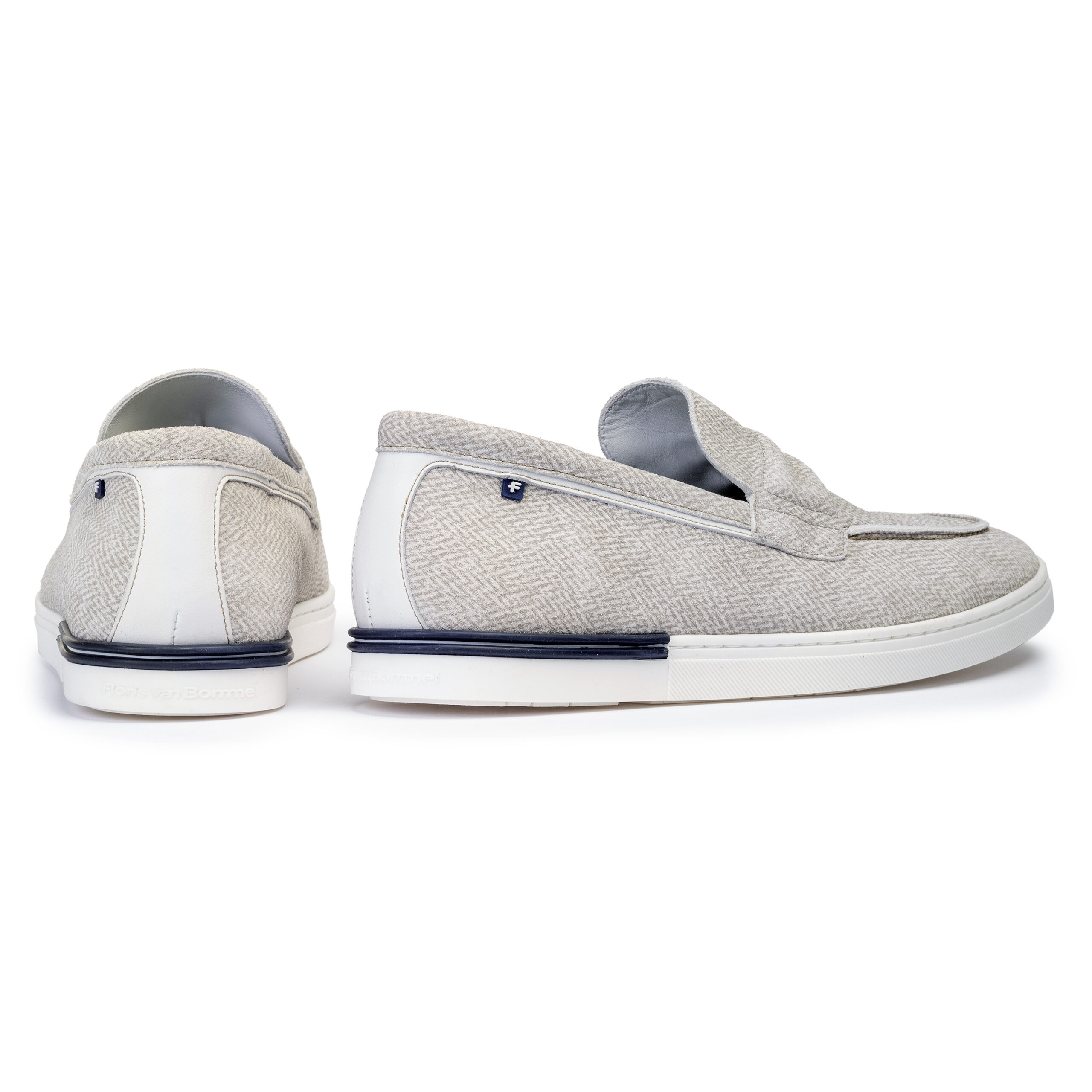 Deze casual loafer is uitgevoerd met een aangespannen spiegel. De TR zool heeft bij de hiel twee donkerblauwe strepen als accent. Aan de achterzijde is een sportief rubberen labeltje met logo in de naad meegestikt. Het passant op de voorvoet bestaat uit enkel een stiksel en een foam underlay en is zo net wat minder klassiek dan bij een reguliere loafer. De schoen is voorzien van witte hoogwaardige kalfslederen voering en een dik en comfortabel voetbed. Het voetbed kan eventueel uitgenomen worden om te verwisselen met een eigen exemplaar. Deze variant is uitgevoerd in licht geolied suède met een mooie grijs tint en een rijke uitstraling.