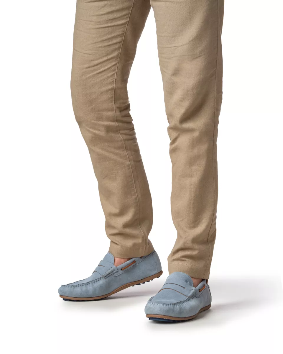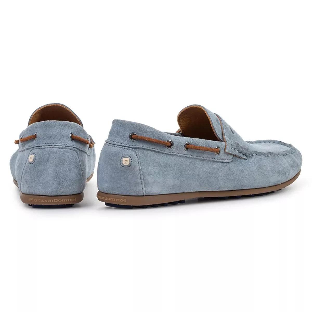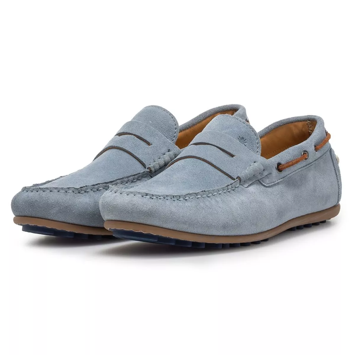 Deze schoen is gemaakt volgens de mocassin maakwijze. Dat betekent dat het leer van de schoen onder de voet doorloopt. De schoen sluit daardoor als een soort sok om de voet. De mocassin maakwijze staat bekend om zijn soepele karakter. Het met de hand aangebrachte stiksel op de voorvoet zorgt voor een authentieke uitstraling. De TPU-zool is op het loopvlak voorzien van een prettig antislipprofiel. De schoen is volledig gevoerd met kalfsleer en heeft een comfortabel, niet uitneembaar voetbed. Deze variant is uitgevoerd in lichtblauw suède.